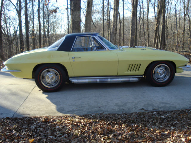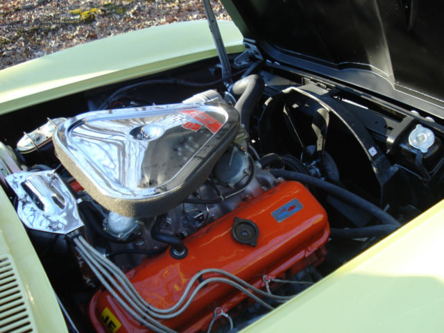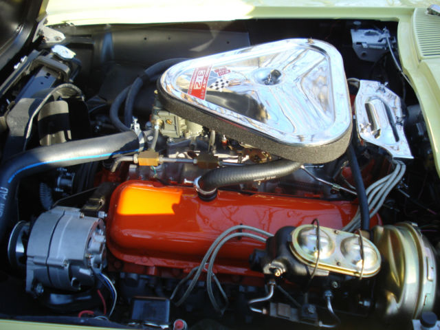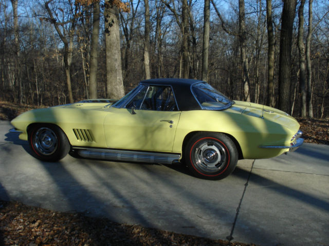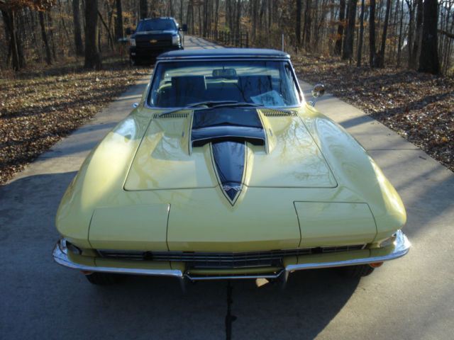 This beautiful corvette just finished a complete frame off restoration and only driven 45 miles for operations check and final tweeking. It is flawless. It is equipped with ps, pb, headrest seats, shoulder harness, speedminder, side exhaust, redline tires and both tops (black vinyl hardtop) first yr as an option. I bought this cat 12 years ago with only 38,000 miles on her and now has 40,653. It is a no hit car and still retains its matching #'s engine, transmission and rear axel. No expense spared on its restoration. In 1999 I started putting together a all Big Block collection from 1965-1974. About 3 yrs ago I started selling off my collection having only 4 cars left, this is the last to be restored and put up for sale. I still have a 67 400hp w/AC----66 450hp Black/Black----65 425hp Blu/Blu 396 car. This yellow 435 is the only one having undergone a frame off restoration. This car does have its tank sticker and prefer seriously interested parties come and look in person at pad stamp, trim tag, sticker, etc, etc. As we spent an hour or so perfectly adjusting all the windows and getting a perfect fit on the hardtop, I did not remove it for a pic of the convertible top but it is brand new, black and fitted perfectly. I do have all pics of complete restoration from start to finish. I am located in Jackson, Mo. about 100 miles south of St. Louis 573-2706199 prefer contact by text or e-mail HOWARDGK@HOTMAIL.COM Thanks