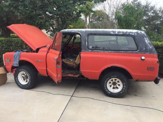 1972 K5 Chevy blazer. Chevy 350 V8, turbo 350 automatic transmission, Full removable top. Four-wheel-drive locking hubs. This K5 Blazer is completely stock. It is running. I have the gas tank unhooked which probably needs to be cleaned since it has not been driven in almost 2 years. A tuneup and a clean gas tank and you're driving. It needs new rocker panels on both sides a couple patch panels here and there. This truck was bought brand-new in 1972 and the second owner bought it in 1976. I am the third owner. Was planning on restoring but not sure when I will get to it so I am listing it to get room in my garage. I have two other projects in front of it so it's going to be a while before I can get to it. If you know these trucks you know they're hard to find and the core part of this truck is 100% it is very restorable. Again the rocker panels/floors are shot they are rusted out and it needs new variuos panels and a few patch panels. I do not have to sell it but would like to get my garage emptied.$8000.00 or best offer plus the $125.00 eBay charges . Thank you for looking and have a nice day. I have a new has tank that will go with her. This is a complete restoration project. There is rust in the common areas. From what I can tell, the frame is in great condition. This car is for sale locally. I reserve the right to cancel listing or remove add at any time. There is no warranty. None. Not written, implied or otherwise expressed. Sold as is.
