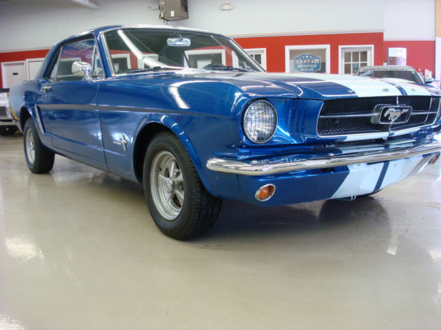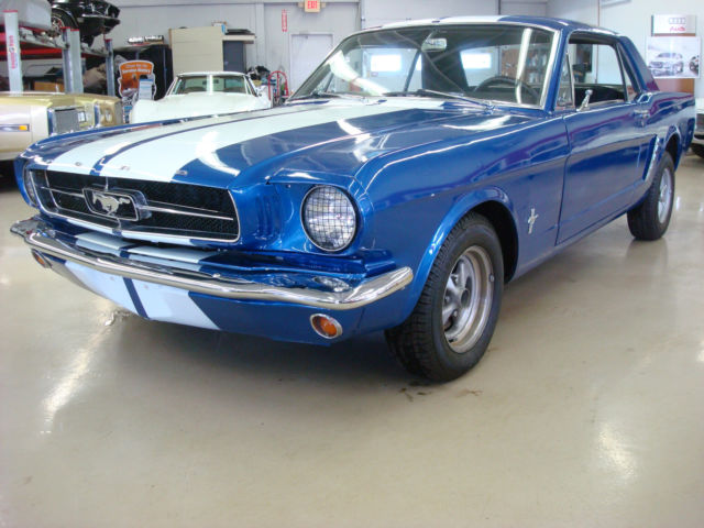 1965 Mustang Co upe, blue exterior with w hite stripes (like a GT), black standard interior. This car was born with 6 cyl., and replaced with a healthy 289 V8, Holley 4 barr el carburator, e l e ctric aux., radiator fan, automatic transm ission with shifter on the floor . The engine runs good, the c arb was rebuilt, the brakes w ere "freshe ned" up, and a new battery was installed. T his mustang would make a great fa ther s on project. It s a great car to drive no w restore later, and e njoy this spring and summer. The body on the car is very solid, just a few blisters here and there, nothing serious. The underside of the car and fr ame is very solid, see the many pic tures I took . It has Cragar wheels, and new tires, dual exhaust that has a he althy rum ble. Eve ryone knows your coming, and the car gets many compliments. The ster eo s ystem was removed, it wou ld need a heater core (no heat) since the hoses have been bypassed. Otherwise, it is a car that you can get in an d go. With a little TLC it can be a nice weekend toy. All of the g lass is good, steering can be better (tighter) , bumpers are in good shape, the paint is average with blemishe s, a few min or nics and chips nothing serious. Bid with confidence, this is a nice car . I res e rve the right to end this auction early, this car is being so ld as is with no warranty, cle an clear origi nal title . We are located 1/2 hour from major airports, overseas buyers welcome I can assist with shipping. I've shipped many cars overseas, buyer pays for shipping. I can get a great quote for shipping "coast to coast", from $1000.00 to L o s Angeles, to $650.00 to New York. Joe 630- 975 nine five nine five. www.napervilleautohaus.com www.napervilleclassics.com