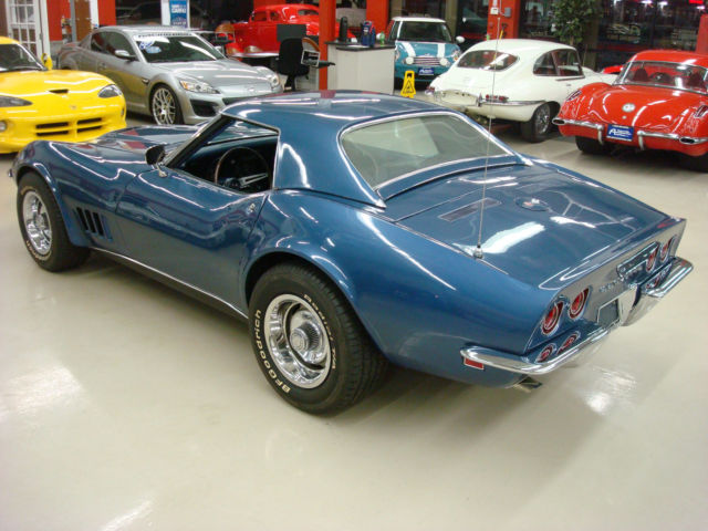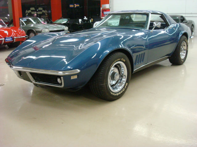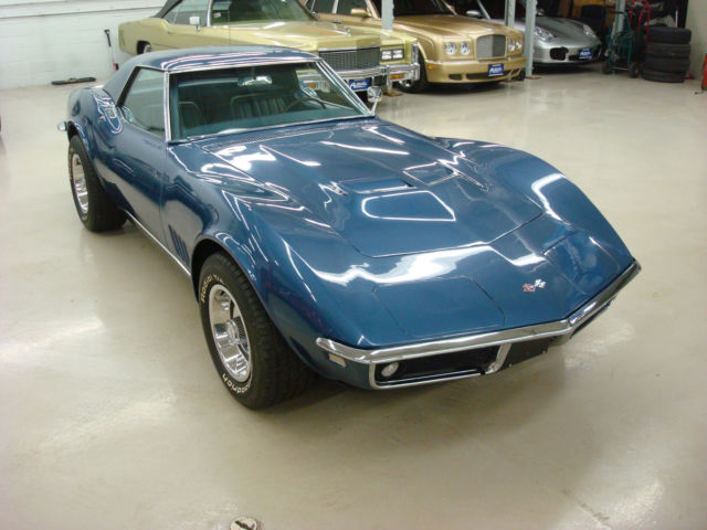 1968 Corvette Convertible, numbers matching 427, 4 speed, two tops . This is a true numbers matching 427 roads ter , all date codes, and stampings are correct on the bloc k , I have great pap erwork on the car from many years ago, and a stack o f receipts. I also have copies of the title s from previous owners. Great t rail of history ! I installed a new gas tank, sending unit , and battery. The pre vi ous owner of the car put on ne w tires, brakes, rebuilt car b, belts, and complete tune up. New hoses for the headlights, one of the hoses is crossed and the lights do not go up, along with the wiper door. I was told its a n easy fix. The body on the ca r is in very go od condition, and I would rate it a very nice presentable cruise night car. The body is very straight, the paint is in very good condition, along with the chrome. New red lens tail lights, n e wer exhaust s yst em give s it a heal t hy big block rum ble. The 4 spe ed trans shi fts easy, and the clutch is good. The fra me under the car is roc k solid, no issues anyw here, and very straight. I verified tha t the engine is correct, I haven't verified the transmission. B ut i t is a m uncie. This is a two top car, corr ec t and very desirable factory ex terior blue color , with a white soft top that was installed a few years ago, still in great conditon. I have the headli ner for the hardtop. The interior on the ca r is in excellent condition, very co mfortable seats, ha ndles nice, and the br a kes are tight. Bid with con fid ence this is a very nice driver quality car. Joe 630-975- ni ne five nine five. I res erve the right to end this auction early, car is sold as is with no warranty. I have a clean c lear title. Out of c ount ry buyers welcome. I 've shipped many cars overseas. I can assist wit h shipping, buyer pays for shipping. Email me for a shipping quote. We are located in Illinois, 1/2 hour from Chicago and ma jor ai rports. www.napervilleautohaus.com www.napervill eclassics.com
