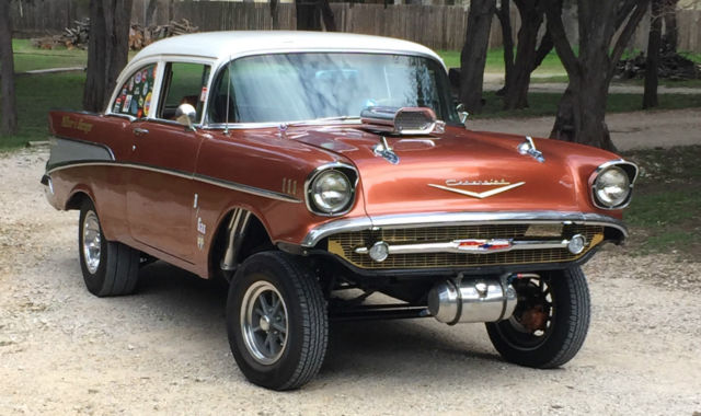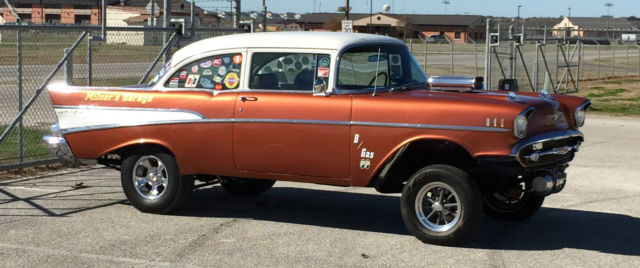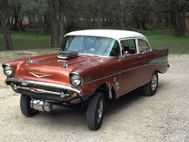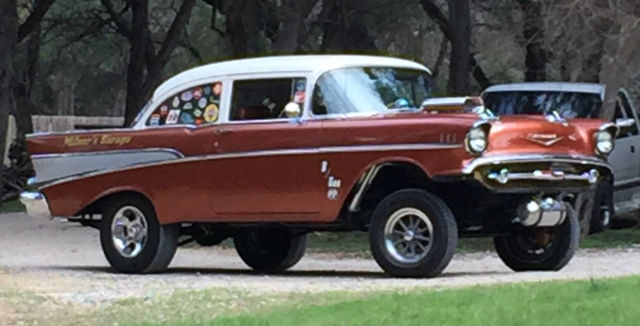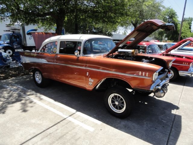 Be Ready to get all sorts of attention if you buy this 1957 Chevy Belair Gasser. Its actually a 210 not a Belair but has all the Belair Chrome (well except for around the windows). It has a brand new "The Engine Factory" built 500 HP 383 Chevy V8 with less than 1K on it. Some of the engine highlights are: Coated(Silver) Hooker Fenderwell Headers Comp Cams Roller Cam (if seriously interested I will get you the specs} Comp Cams Roller Rocker Arms Comp Cams Roller Lifters Complete MSD ignition system (MSD Ready to Run Dist,. MSD Wires, MSD 6AL Digital Box, MSD Coil) Edelbrock Tunnel ram Dual 4 barrel Holley 600's ( Idles at a perfect 800 RPM) Brand new motor mounts and Bellhousing Mounts Brand New Zoom 11 inch Kevlar Clutch, Pressure Plate and Throwout Bearing (less than 1K miles) Rare Lakewood Blowproof Bell housing Muncie M21 with Hurst Comp plus 4 speed shifter (shifter clears a bench seat) Professionally installed Speedway Straight front axle assembly with Disc Brakes (steers like a new car..no bump steer at all......rides and steers perfectly) New Disc Brakes in the front New Brake Shoes in the rear. New Dual Master Cylinder All New Brakes Lines with Braided Steel Front Brake Hoses Original Rear end Caltrac Traction Bars (best of the best) Hurst Piecut Slicks on rear with Rocket Hilbrand look-a-likes Radials on Front with Spoked Rocket Launcher Rims Aluminum 20 Gallon Fuel Cell in the trunk All New Braided Steel Gas Hose from Carb to Tank Red Top Battery in an Aluminum Battery Box in the Trunk Edelbrock Quiet Flow Electric Fuel Pump, Hurst Canister Gas Filter. Paint is Sierra Gold with a Adobe White Top. All Gauges work, horn works, all lights work, Brand new Flowmaster exhaust. Emergency Brake works. Sea Belts front and Rear. Bucket seat from a 1972 Olds. Original back seat. AutoMeter Gas and Water Temp in the Stock Dash along with the Stock Speedometer. All in working order. Drive this car anywhere! This is a great driving car and looks killer. A very Solid Car..Almost all the Chrome trim and Chrome items on the car has been replaced with new!! You will not be disappointed! Runs a cool 180 degrees all day, even in the hot Texas Summer and in traffic. This Car is SOLD AS IS! No Refunds (You will not be disappointed) $1,500 Due within 48 hours of winning Bid, The rest via Cashiers Check or Cash (Must wait for pickup for cashiers check to clear bank..If your an honest buyer you wont mind the wait and will understand!!) Buyer is Responsible for Shipping...better yet...come get it and drive her home!