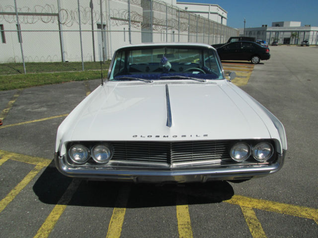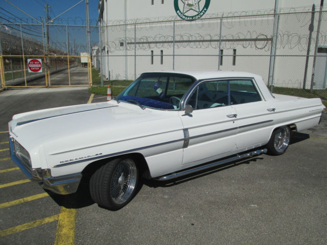 YOU ARE LOOKING AT A 1962 OLDS DYNAMIC 88 WITH A 395 V-8 ENGINE, STOCK, FROM AZ, RUST FREE, BROUGHT DOWN TO FLORIDA A FEW YEARS BACK TO TURN INTO THE COOLEST LOOKING LOW RIDER IN SOUTH BEACH! WE LOOKED AT NUMEROUS 63 AND 63 CHEVYS, THE CLASSIC LOW RIDER, BUT WHEN WE SAW THE LINES, INDENTS, AND ALL THE BEAUTIFUL CHROME ON THIS ONE, WE WERE SOLD. AS IT IS HOT DOWN HERE, WE WERE ONLY LOOKING FOR RIDES WITH FACTORY AC, AND THIS HAS IT! WE THEN GUTTED THE OLD INTERIOR, AND REPLACED EVERYTHING, HEADLINER, CARPETS, DID THE DASH AND BACK LID, EVERYTHING IS CUSTOM, CRAZY CLOWN THEME, WHITE WITH CRUSHED PURPLE VELVET . WHAT IS A LOWRIDER WITHOUT 100 SPOKE RIMS, CENTER CAP REAL SPIN ON WHEELS,LOW PROFILE TIRES, AND LAKE PIPES? WE HAVE ANOTHER PROJECT WE ARE DOING, SO WE WILL LEAVE THE PINSTRIPING UP TO YOU TO PERSONALIZE IT...HAPPY BIDDING, ON ONE COOL ASS CAR! Custom Low Rider New paint and clear coat, metallic White New head liner new seats, white/purple velour insets, custom stitched with evil clown theme custom dash, purple velour new carpet new mats that say Low Rider new Wheels, Truespoke 14's New tires, low profile 394 Stock engine auto transmission lake pipes Looks and runs great Better than the pics and are you ready...? It's a rare AC car with 134a upgrade that works fine! under dash old school CD player with twin Jensen rear mount speakers No issues, get it and drive it, new radiator (aluminum) new water pump, new belts, new hoses, tuned up, ready for a new home, bid to win... very reasonable reserve! On Feb-16-15 at 06:32:37 PST, seller added the following information: The engine is a 394, not 395 as in description, original, 2 barrel, smooth shifting transmission, dual exhaust, interior is completely new so don't let camera shading throw you off, it's beautiful, new chrome emblems all the way around the car, dice door locks, interesting trades anyone?