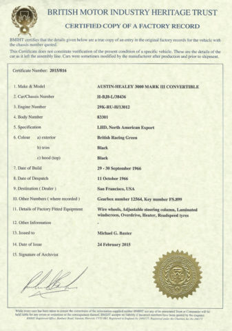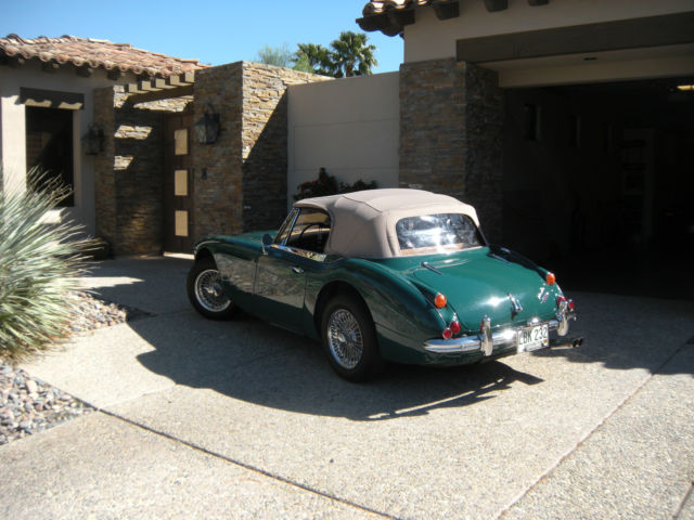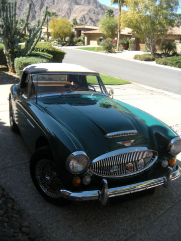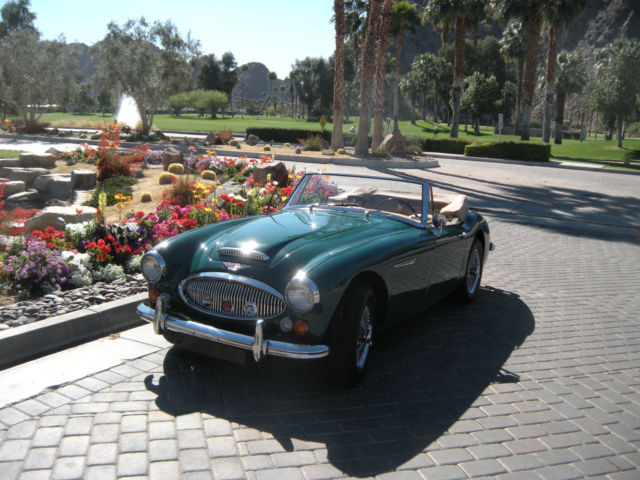 Beautifully restored classic 1967 BJ8 3000 Austin Healy. I have just received the British Motor Industry Heritage Trust Certificate #2015/816 matching body tag. The engine #, gearbox # and body # are all original to the car. The car was originally shipped to the Healy dealer in San Francisco. This is a west coast car (no rust)! I have owned this car since 2001. The car has been garaged all that time. I purchased the car from a gentlemen who had restored many Healy's over the years. This was his last and best. When I purchased the car it had been recently painted and re chromed. The engine had been rebuilt and new exhaust system installed. I have driven less than 2000 miles in the last 14 years. In 2012-2013 I did extensive mechanical upgrades that carry a 12,000 mile warranty. (records can be provided). After the mechanical work was completed I purchased a new interior from Heritage Upholstery in Vancouver BC. (complete list of work can be provided). Interior with biscuit colored leather seats with green piping. Matching biscuit vinyl on other surfaces and green Wilton wool carpets with matching overmats. The dash was redone with birds eye maple to compliment the biscuit interior. The trunk has a new Armacord black lining. Since this work has been completed the car has less than 100 miles. I moved the car via enclosed transport to its current location in Indian Wells California. The car is offered FOB Indian Wells. I can assist new owner in setting up transportation if desired. Additional pictures available upon request. If you are looking for a car to show, drive or just admire this is the one for you.