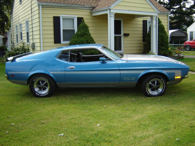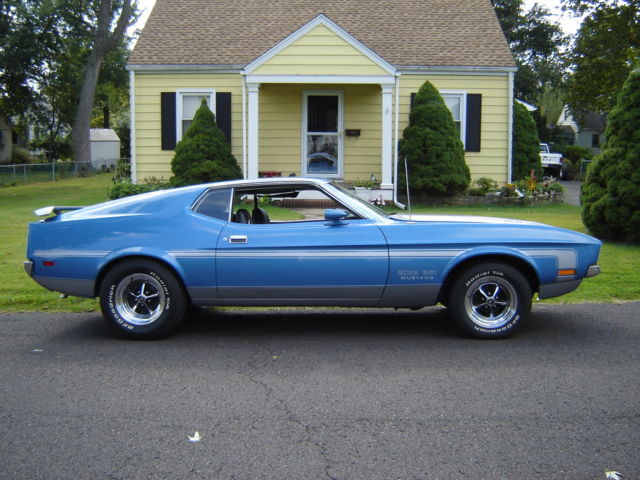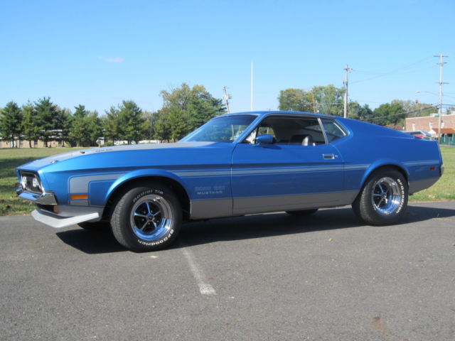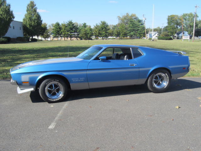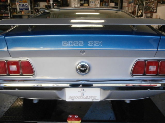 1971 Ford Mustang Boss 351 - Totally restored true R-code Boss 351 . Original Medium Blue Metallic Boss with Argent stripes and black interior. This was a nice car that was driven into the restoration shop, and completely disassembled. The body is beautiful with original floors and trunk. This car still has it's original engine (rebuilt), original toploader trans (rebuilt), original 3.91 N-rear (rebuilt), D1ZF-ZA Autolite 4300D spread bore carburetor (rebuilt and plated), DIZF distributor with correct and rebuilt/plated vacuum advance, original radiator (that's rare)â¦manifolds, headsâ¦The choke works great and the motor starts quite easily. Sounds great running. All parts and fasteners rebuilt, restored, replaced, or reconditioned. The shifter was sent to Hurst for a rebuild and replating, wiper motor rebuilt and restamped , detailed trunk with re-plated locks and latches....and just much, much more. All brake (stainless brake lines) and suspension components, restored, replaced or reconditioned. Has a new Autolite battery with date code cables. Hoses are date coded with part numbers and with correct stripes. Original space saver and canister. Custom stamps were made for factory details. Factory markings were placed according to the built sheet (built sheet is rough but still there). I also have a Marti Report. The car was restored to be as original as possible, but in the last minutes, a set of plated Sanders headers with Flow Master mufflers were installed. Otherwise the exhaust is stock, including the H-pipe and tail pipes. But the rare and original exhaust manifolds come with the car. The interior is beautiful. Gages are reconditioned with new lenses and new bezels. Since it is a fairly low mileage car, much of the interior is still original. But it was left only original if it was in fantastic shape. If it was not in great shape, it was replaced. Unfortunately in the last few months, a small hole got poked in the headliner. (ouch). Otherwise the interior is beautiful. The car is always stored inside. This car is detailed inside and outside, underneath and in all the nooks. Is it flawless? I would not say that it is perfect since the restoration. Some parts were finished in the correct phosphate metal finish and such might have a light surface rust. That can easily be wiped down before a show. But it is still a stunning and gorgeous car. I encourage all bidders to give me a call and get more details. I know I missed good information and I would be happy to send other pictures. Please give me a call for details 215-620-8744. And of course the car is available for inspection if you're in the area.