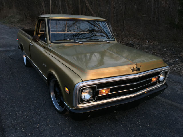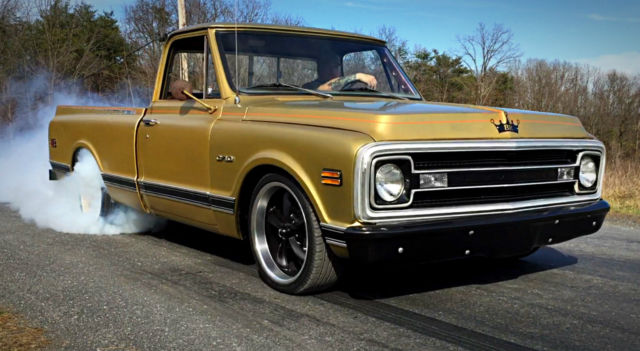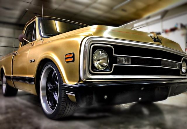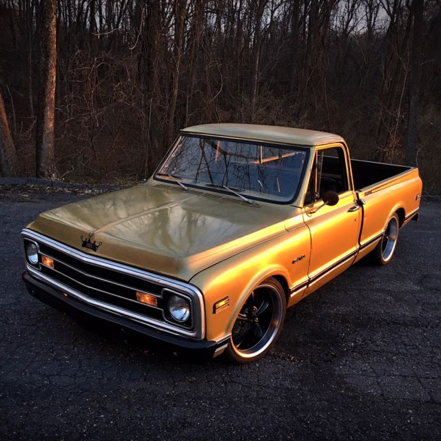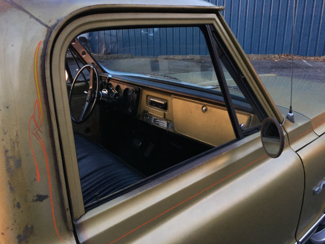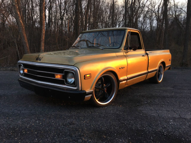 BRð Hotrods Shoptruck We started with a pretty clean 1970 shortbed and then added the following.. New cab mounts New inner and outer rocker panels New right front fender All new light housings and bulbs A roll in bedliner New tailgate New front bumper New window rubbers New halogen headlamps etc. We then moved on to the interior where we installed the following... Sound deadener New molded carpet New seat foam and cover New dash pad New sun visors New Chrome sill plates New chrome (column shift) column with tilt Mechanical oil pressure and demo gauges New Stereo with AM/FM/Bluetooth/Pandora/Sirius XM etc with new 6x9's in the doors We added custom die punched holes with mesh to the door panels to carry the theme inside And finished it off with custom copper A-pillar covers On to the engine bay where we installed the following A low mile 5.3 LS engine with a 4L60 overdrive trans A cold air intake and stainless steel headers Flowmaster mufflers and new pipes New power steering box and linkage New power brake booster and master All new brake lines New battery New fuel system with a 255LPH pump and Corvette filter/regulator combo as well as all new feed and return lines Custom engine cover and filler panels, as well as radiator hold-down made from copper It literally looks like a factory install, with a lot of the wiring hidden. On to the suspension We installed a 3" front/ 5" rear lowering kit with all new springs and shocks New spindles New axles and drums New wheel cylinders and shoes out back New discs, calipers and pads up front New 20x8 and 20x10 wheels with new Z rated rubber The body was in pretty good condition so to keep it affordable we simply pinstriped it and left the patina for the old school (shop truck) look. It literally has 95% all new parts on it, starts the first time every time, doesn't smoke, has killer volts and oil pressure, and the temperature is rock steady! If you are looking for a worry free C/10 to hop in and cruise all summer, then look no further! It does not have A/C but all of the parts are in stock and we will install it if it is bought using (Buy it Now)! Feel free to call or email with any questions.