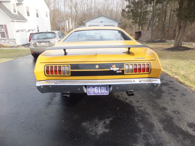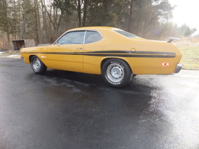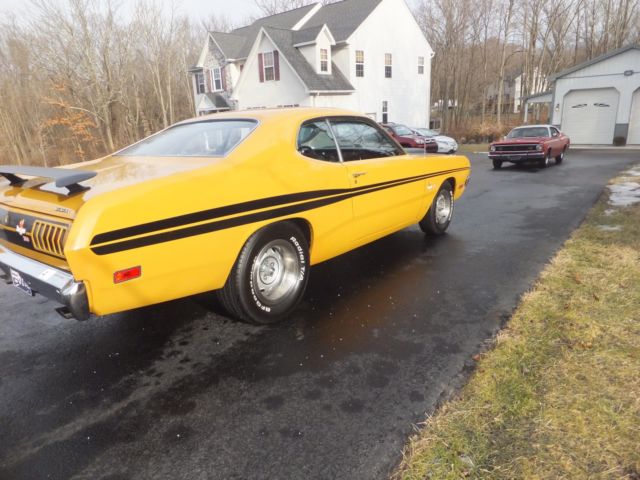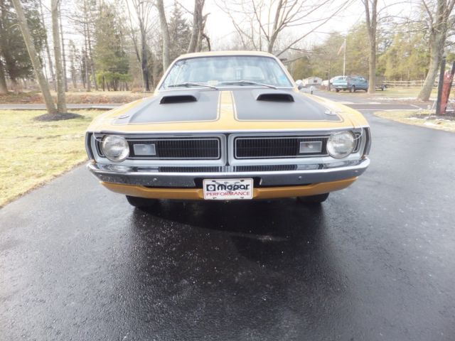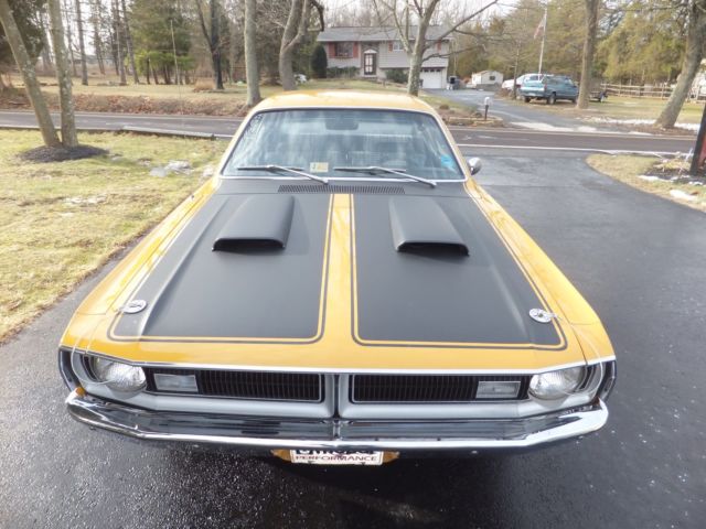 Selling my 1971 Original butterscotch 340 Demon..Please read the ad and ask questions if needed. The demon now has a 360 stroker motor that looks stock but has alot more horsepower then stock. It has elderbrock alum heads, headers, alum intake and 750 carb, again everything looks stock .Has all the factory hose clamps, air cleaner and so on. The trans is a 727 reverse manuel valve body with a 3500 stall speed, also has a 3.91 posi 8.75 rear end. This is a original butterscotch 340 demon H code and comes with the numbers matching engine block. This car was restored back in 2007 and has been garage since. The car sounds very healthy and drives down the road great. I have driven this car to the shore, will not run hot or break down on you. The paint is a 9 out of 10..1 flaw I took a picture of about the size of you pinky nail..Also, chromes is in great shape, all original body panels, again..Very solid car..I have owned 7 demons and this is by far the nicest one I have had..Why am I selling it..I own a 2012 ZL1 and just purchased a Hellcat..So I am selling off a few cars to help fund my Hellcat.. Only listing this 1 time, if it doesn't sell I will enjoy it for the Spring and Summer time. On Mar-22-15 at 14:34:09 PDT, seller added the following information: 0 Feedback bidders will be cancelled with no contact first..These auctions cost money and time....Please understand and respect others. On Mar-22-15 at 14:45:27 PDT, seller added the following information: Some question asked...I never raced it..Horsepower I would say is around 475 or so...The car was redone back in 2003 or so as 2 of the old owners have reached out to me when they seen this auction..Car needs nothing at all...I would not change a thing..Looks to be all original panels, trunk and so on..Talking to the 1 previous owner he stated they are all original panels and the car came from the West and was rust free..The one fender has a very small skim coat of plastic, this is what I am being told..Again, I have had many demons and this car is super nice and great color combo...I will try and post a small video.. On Mar-22-15 at 15:31:22 PDT, seller added the following information: https://youtu.be/Zqlwdj6AK_o On Mar-25-15 at 06:16:13 PDT, seller added the following information: But it now has been added good luck..
