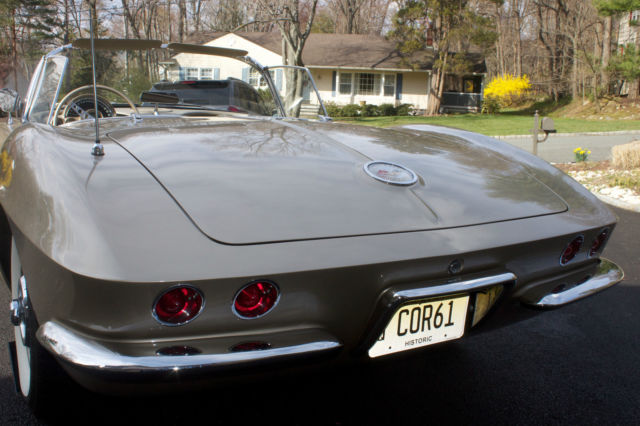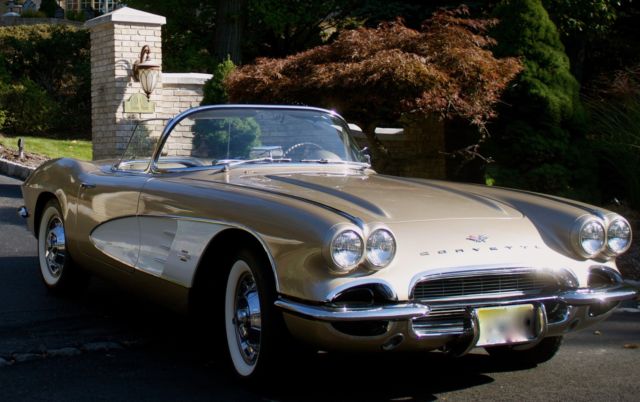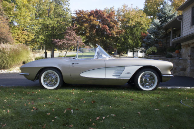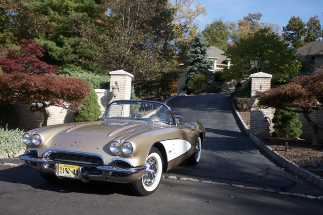 *RARE FIND* 1961 Fawn Beige /Urmine White Coves MATCHING NUMBERS ORIGINAL CORVETTE 283/245 HP HYDRAULIC LIFTER ENGINE WITH TWIN CARTER 4 BARREL CARBS RESTORED TO ORIGINAL CONDITION What makes this car a rare find is it was the last to roll off the assembly line in St louis (MO) in 1961,the last of the 283 small block and 2 tone coves,car represent the bookends of an era. Also out of 10939 cars it is 1 of 358 in this color scheme. Also meaning,there's a handful; of cars with this combination of options still in existence . Options: RPO 440 two tone paint (1 of 358 out of total production of 10,939 in Fawn Beige with Ermine White coves) RPO 290 wide whitewalls ( last year of wide whites) RPO 469 283 C.I./245 HP dual carbs (1 of 1,175 for 1961) RPO 685 Borg Warner T 10 4 Speed RPO 675 Posi rear 3.70:1 RPO 102 AM Radio RPO 101 Heater Fiberglass bonding stripes are all in original . Car is a true survivor and never been hit. Comes with original window documentation and book. Car was featured in the June 2008 edition of Corvette Fever Magazine.also one of 15 Featured in 2011 Corvettes @ Carlisle PA for the 1961 50th Year Anniversary of the 1961 model year (Judged at 95 points). History of Car Purchased in Sept 1961 in Ohio by James Norton who maintained and kept till turn of the century then was given to restoration expert in Philly and presented at auction to its second owner in 2007 , who meticulously maintained cars preservation and presented it in many award winning shows. Any serious buyers who are interest please call me at 973-980-3700