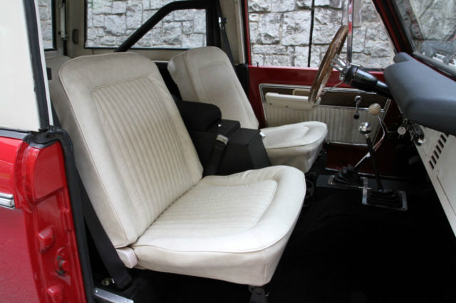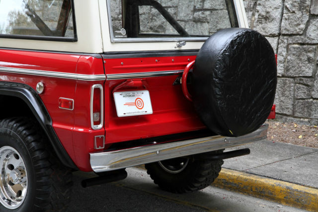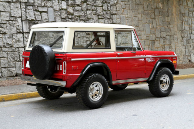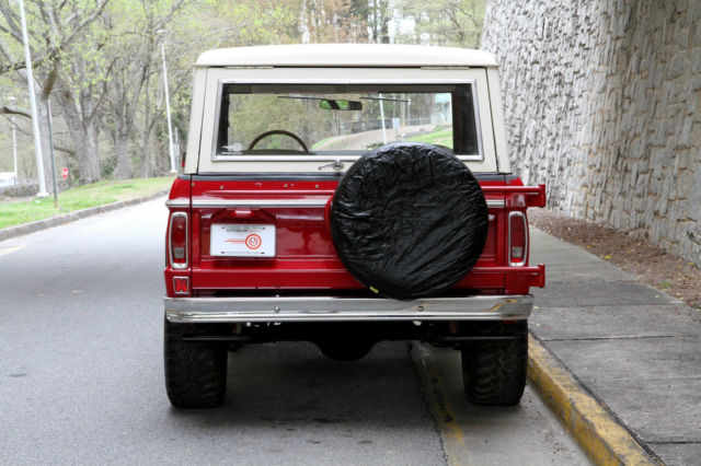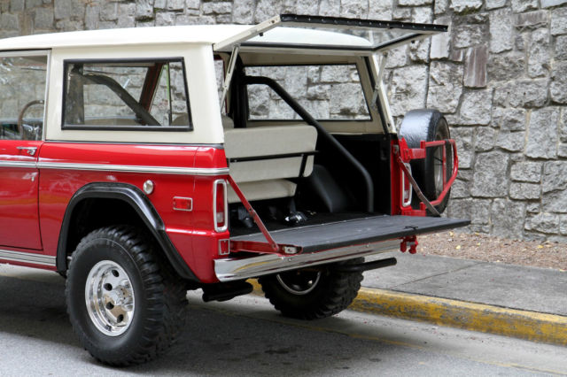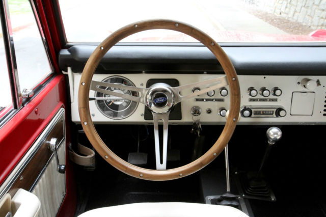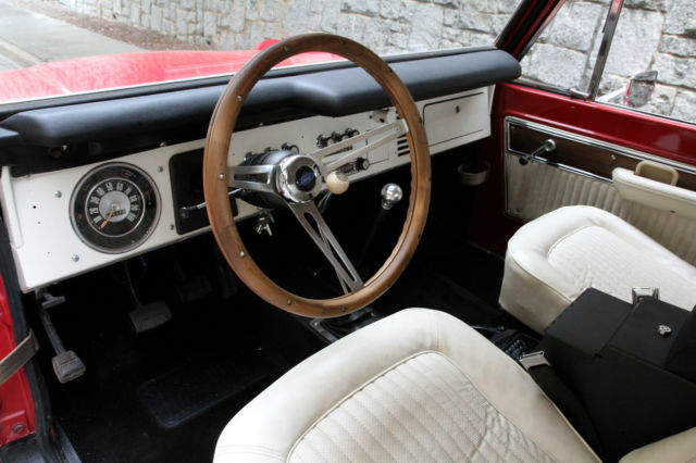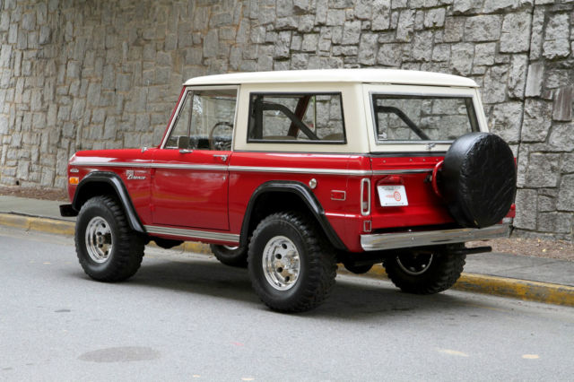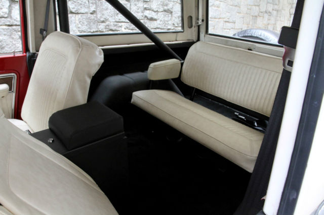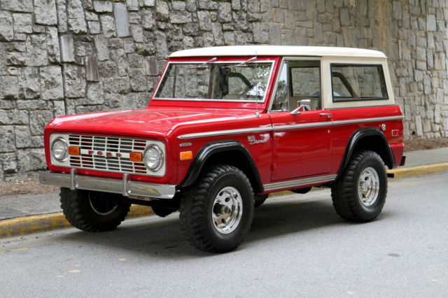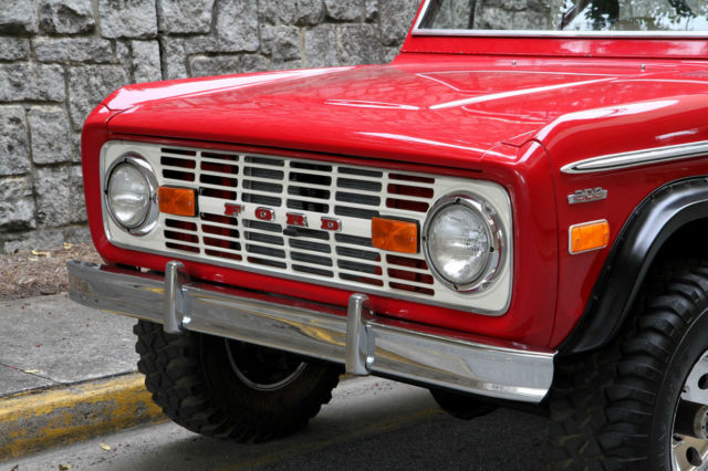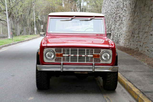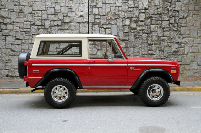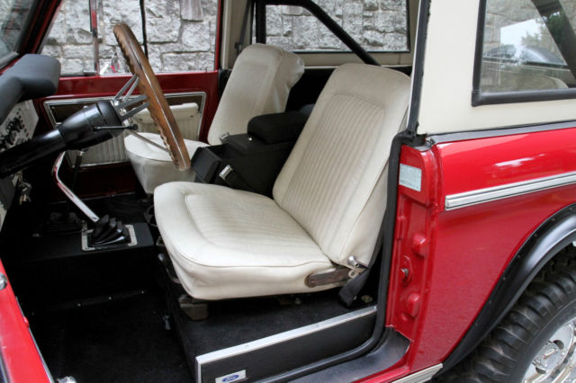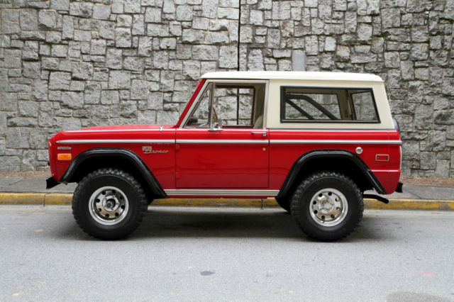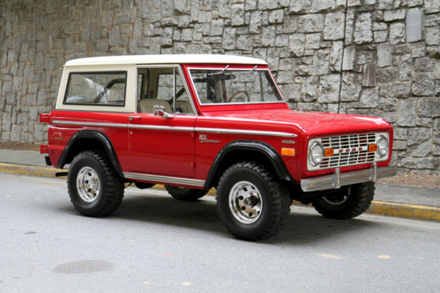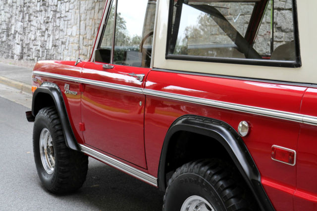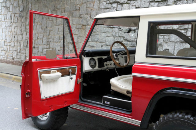 Motorcar Studio is pleased to offer this 1972 Ford Bronco Sport. It's a sharp truck running a strong 302 V8 with mild cam, power steering, power brakes. Recent repaint in Ford Red done to a nice standard; body is excellent with some of the best door gaps we have ever found on an early Bronco. Sport trim (body side molding and window anodized aluminum) in nice original condition. New hardtop-to-body seals. Original underside in decent condition with no rust in the original inner fenders or door posts, which is rare on these trucks. Front floor pans have have been laid over and welded in -- it's not a show-quality job but it's solid. The interior shows well and is mostly new including upholstery, carpet, headliner, door panels, dash pad, wood wheel, locking center console and new stereo. Roll bar with 3-point seat belts. Floors beneath carpet are professionally rhino-lined (see photos before carpet went in). Runs and drives well with new Eagle alloy wheels wearing 32x11.50 mud terrain tires. Recent tune-up, fluids, brake master cylinder, aluminum radiator and many new body felts and rubbers. Three-speed on floor. All gauges, lights, wipers, door locks, etc working properly. This example is a great Bronco with an undeniably good look that is ready to be enjoyed. We often accommodate requests for further enhancements on Early Broncos -- family roll cages, fold and tumble rear seats, air conditioning, etc. Contact us for more info. For more information about this 1972 Ford Bronco available at Motorcar Studio in Atlanta, please call 404-692-5250. Click here for more photos of the car.