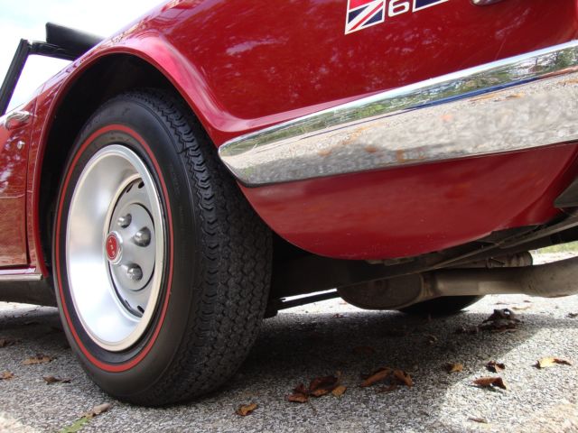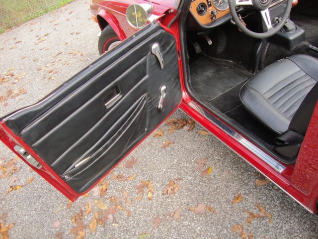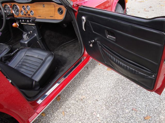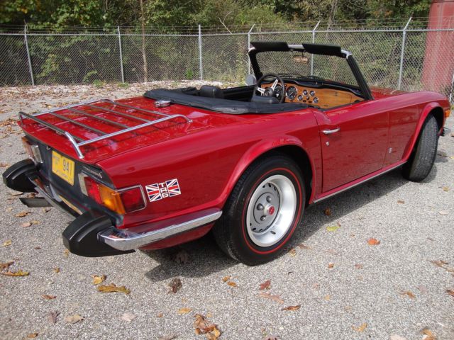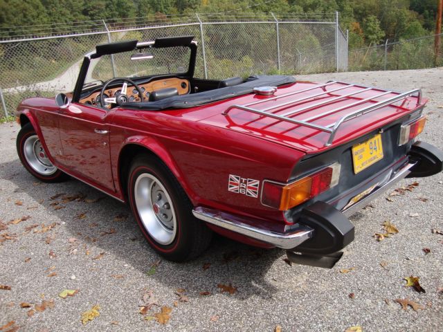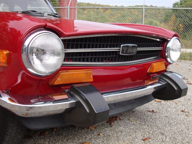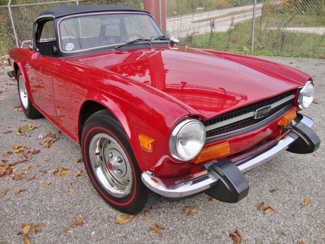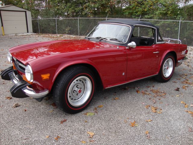 The paintwork on this car is way above average, as you can see. I took pictures of every inch of the body. No rust ever underneath or in the trunk. 5 new Goodyear Redband tires have minimal wear. Beautiful dash, gauges, rear mirror and dash pad. Original door panels and seats are in great shape with only a couple of seat tears needing repair. Carpet appears new. All gauges, lights work. New parts installed in the last year by me include: battery brake rotors, calipers, pads, master cylinder, slave cylinder stainless brake hoses wheel bearings hood release cable and secondary emergency hood release rod wheel cylinders green coolant hoses wiper motor retractable seat belts trunk liner kit spare tire well cover I had the radiator and gas tank professionally cleaned out, the carbs cleaned, and a full tuneup done. I replaced the aging cassette deck with a delete plate, but the antenna is intact ready for music if the new owner desires. I have taken the car on numerous trips in the last year, including a memorable trip back to our hometown to show the completed car to my friend's brother, who had sold me the car as executor of the estate. Each trip has been a delight. No problem of any sort. It runs and sounds great, shifts smoothly and is as comfortable as any TR6 can be. It should provide reliable enjoyment with minimal or no down time well into the future for the next owner. The top is the original style with reflective tape, but there are a couple of rips with silicone repairs. It does not leak, but the new buyer might want to replace the top at some point or have the rips properly repaired. And maybe have a pro repair the small seat tears at the same time. The valve cover gasket has a small oil leak. Other than that, all the car needs is a new home. I will include the Heritage Trust Certificate that I ordered which confirms that the car is the correct Carmine color and has the correct chassis, body and motor numbers. It does not get any better than that! I would welcome anyone to call to discuss the car. Call Bill at 304-389-3900. Better yet, come see and drive the car in Charleston, West Virginia. You can fly into Yeager Airport (CRW) and I will pick you up in the car. Finally, I can allow the car to remain in my garage for a couple of weeks after timely payment while pickup is arranged if that helps the new buyer. Also, can be flexible and cooperative with your shipper and will be present upon pickup to observe on your behalf. I can call once the shipper is on the way for your piece of mind.