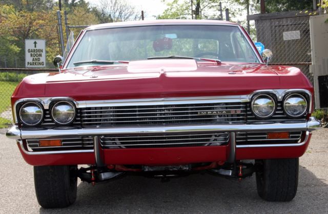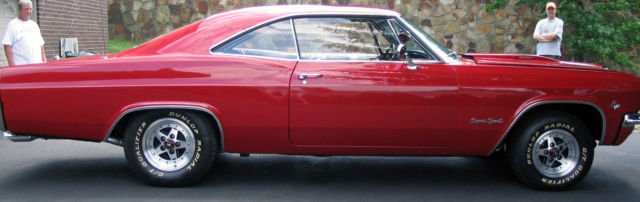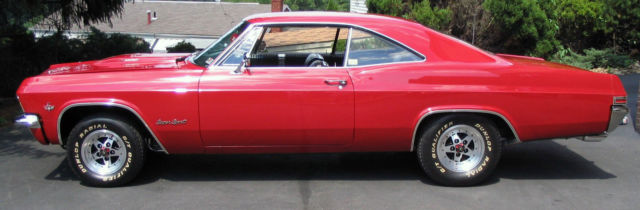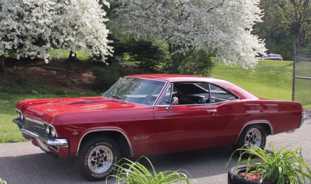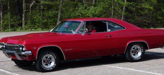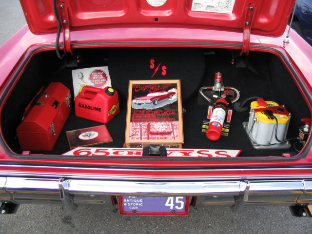 Owned by same family since originally purchased for $3448. VIN 166375F310361 45,343 Original Miles Originally equipped with 327/300 hp, Muncie M20 4 speed, 3:55 posi-unit, 12 bolt rear, tinted glass, SS Exterior and Interior Package The '65 SS was driven every day when new a the family car. In the early 1970âs, the '65 SS was transformed into a Class Winner at Pittsburgh International Dragway. A second tranformation began in the mid-1980âs to what you see today. The '65 SS is a solid cruiser and head turner at the weekly car cruise. Hasnât been in the rain in 45 years! Car has been lovely maintained over its entire life. Includes original Owners Guide, Protect-o-Plate, Original Keys. As equipped today: Engine: NOM 327 cu inch bored .030 over with Crane Roller Cam. Highly Detailed Holley 650 cfm carb Headers Transmission and Rear End: Original Muncie M20 equipped with Hurst Shifter 12 Bolt Rear End, Zoom 4:88 Gears, Moroso Posi-Unit, Henryâs Axles Body and Paint: 85% Original Regal Red paint, with custom hood. Some respray done on rear quarters. No rust or body filler. Interior: Original Black Interior with little wear Sun Tach, Hurst Shifter, Stewart Warner under dash gauges Exhaust: Flow Master dual exhaust, 2-1/2â aluminized pipes Wheels: Front: P235/70 R14 Rear: P255/70 R15 Trunk: Carpeted in Black Holley Electronic Fuel Pump Billet Battery Box w/ Optima Yellow Top, Kill Switch Undercarriage: As detailed as engine bay! Treated w/ Black Imron and Red Accents Spare Parts: Original Taillights and Hood. Many extra trim parts and emblems. All included!