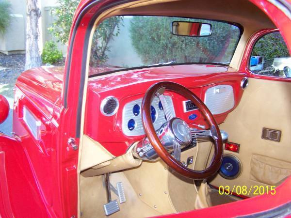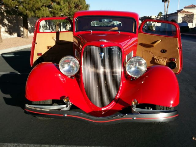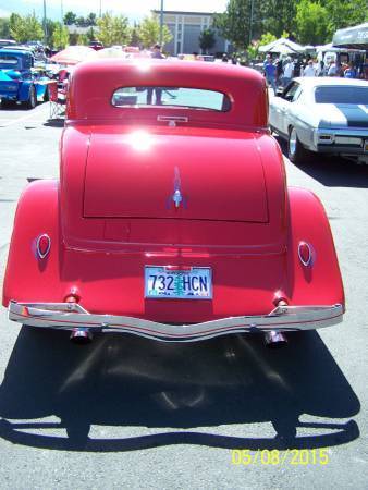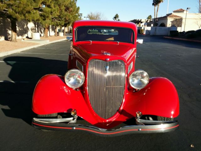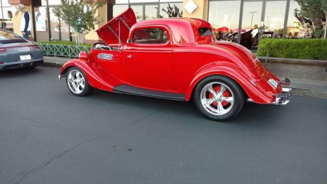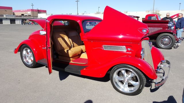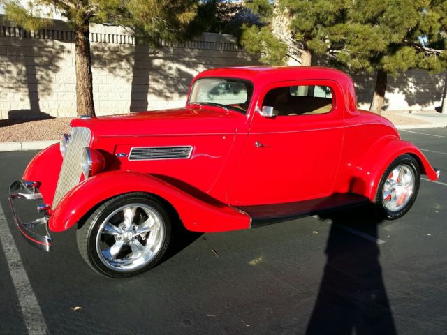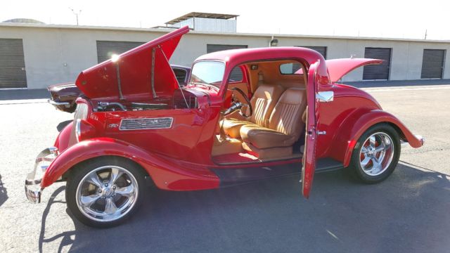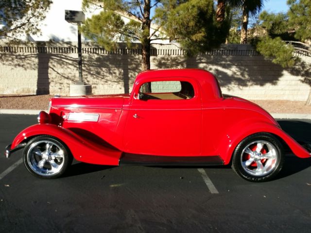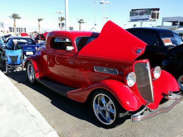 Selling my 1934 ford 3 Window Coupe Chrome front bumper and brackets,Body is fiberglass, Stainless grille Painted grille shell, Painted headlight buckets Bumper mounted chrome turn signals Custom aluminum radiator Rear mounted transmission cooler Electric puller cooling fan CoolFlex radiator hose 434 CID DART V8 motor Aluminum heads Endurashine dual inlet carburetor Polished DART intake manifold Polished billet pulleys Polished aluminum valve covers Polished "434" breathers Taylor Pro Wire 8mm plug wires Polished aluminum plug wire separators Polished ball milled air cleaner Polished air conditioning compressor Polished alternator Chrome brackets Power steering reservoir Power rack & pinion steering system Ceramic coated exhaust headers Hi-torque starter Custom chrome oil pan Independent front suspension Front coil over's Custom frame Power front disc brakes Painted firewall w/polished stainless steel insert GM 700R4 overdrive automatic transmission Chrome dual reservoir brake master cylinder w/frame mounted booster Power Antenna One piece windshield Electric Wipers Tinted glass Rear view mirror Dual polished aluminum side mirrors Smoothed & filled body Suicide Doors Custom wiring Painted dash Ball milled aluminum dash trim Custom air conditioning outlets Dakota digital gauges Wood rimmed Banjo steering wheel Solenoid operated doors Power Windows Billet knob & controls Pioneer AM/FMMP3/XM stereo system Custom upholstered bucket seats Custom embossed headliner Custom door panes w/armrests and map pockets Custom side & kick panels Custom rear panel Leather covering Lokar billet pedals Lokar floor shifter Between the seats parking break 3RD break light Rubber tread running boards Boyd Coddington aluminum wheels Hankook 235/40-R17 front tires Nankang 295/45-R18 rear tires Custom exhaust system QTP electric exhaust cut-outs Four link rear suspension Rear coil over's w/QA1 adjustable shocks Custom Ford 9" rear-end Rear sway bar Custom gas tank Remote operated trunk Upholstered trunk to match interior Trunk mounted battery in hidden compartment Chrome exhaust tips Chrome rear bumper Chrome rear bumper and brackets Show and high quality Red exterior paint Custom pin stripes This 1934 Ford Coupe has been done as a show quality vehicle and has won several awards. Thank you, 7027120041 Troy
