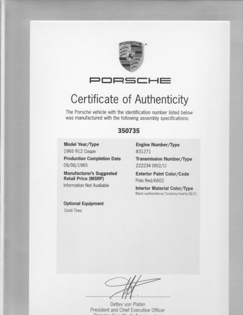 1965 Porsche 912 #350735 is a Euro Delivery car, optioned with a 5 speed transmission. The COA is present. The clock and thermometer were professionally installed at some point in the car's history but are not present on the COA. It's paint code is Polo Red 6602. The corduroy seats are original, and the headliner is in good condition. It's production date is 09/06/1965 and it is tiled in my name in the state of Maryland as a 1965. It is one of the earliest SWB's ever produced and it can be driven home from my house. Mechanically the car is solid. The car has 84,661 miles, and I believe those to be the true mileage on the car based on the title information that I have. The motor runs strong, and the Solex carburetors have been rebuilt by Bieker Engineering-a very often overlooked or ignored maintenance item on a 50 year old car as it is a costly job (1200 bucks, the bodies are machined for new butterflies, shafts, and bushings), which the receipt will show. This early production 912 has the rarely seen Mann air filter set up on it, before the change over to Knecht. The fuel tank has been dipped and sealed as well. The numbers matching five speed works well and I drive the car running errands two to three times a week with pleasure. The brake calipers have been rebuilt, rotors are in excellent condition, and the car rides on Porsche OEM 14" Fuchs with brand new Michelin Harmony tires. There is a date matched 3/65 steel spare in the boot. I do not have the original steel wheels to the car, but the Fuchs are included in the sale. Overall the body is in very good condition for a 50 year old car. The previous owner stated a repaint in the 90's of the original Polo Red, and it is driver quality work. There is no rust present anywhere on the car and the majority of the chassis and pans have been sealed with a POR system. The pans are original and there is very acceptable metal replacement under each rear wheelhouse bend, directly under the spring plates. This is the first year Porsche produced the SWB body and this is the 735th 912 produced, and a European delivery, making it a very special car for the enthusiast, collector, or someone looking to enter into the world of investment grade European models. Available for scheduled test drives and PPI, I would ask that you email or call daytimes EST at 301.648.5510. I reserve the right to end the listing at any time as the car is offered for sale locally.