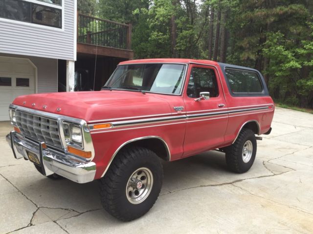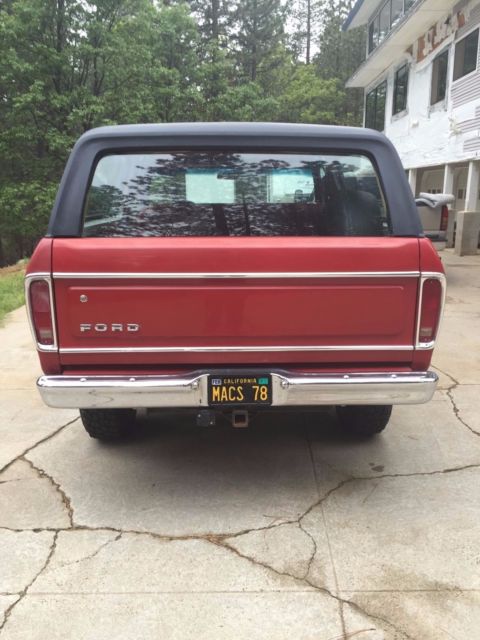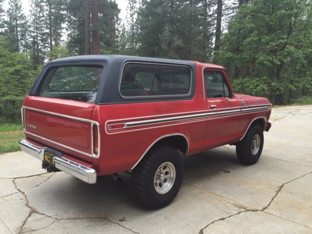 1978 Ford Bronco XLT 103,525 Miles when ad was placed (test drives could increase the miles a bit) 95% Original (after market wheels, stereo and floor mats) Motor 400M Automatic Transmission C6 Air Conditioning AM/FM/Cassette Stereo I think I'm the 3rd owner and I put less than 5,000 Miles on it Original Paint and Interior Original Motor and Transmission, no rebuilds have been performed Brand New Wheels and BFG Mud Terrain 33x11.5x15's. 2" Lift Block in the rear to elimainate the factory sag Everythiung works, even the back window with the dash button and rear tailgate key There are a few small tears on the drivers side of the front bench seat, as shown in the picture Since the paint is original and 40 years old, there are a few flaws here and there and you can see from the pictures, the paint on the top of the roof is faded real bad. The hood also has some oxidizing going on, but might be able to be buffed out. No accidents that I'm aware of, the I would say the body is in great condition, for it's age. This Bronco is being sold "As Is", with no warranty. Please review all pictures thoroughly and ask any questions you have, before biding. Once the vehicle is paid for and pick up, there are no returns, The Vehicle will come with a signed/clear title. Thanks for bidding and good luck ! This is an exceptional "Hard to Find Low Millage Original California Bronco"