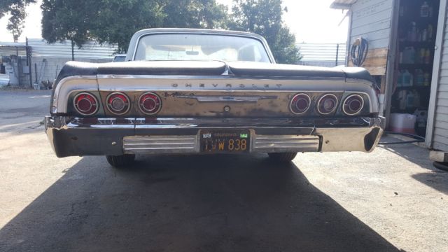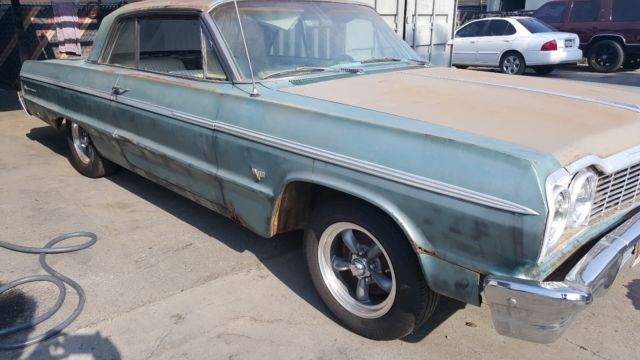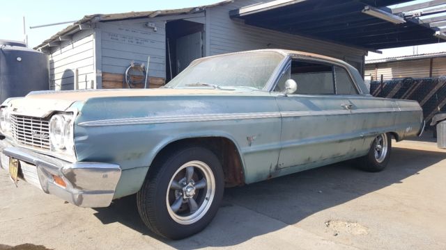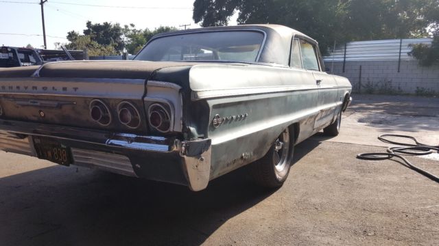 Here is the good and bad. It is a true SS. Easily verified with the trim tag. The frame is in great shape. The Rockers are very solid, as are the floor braces. The trunk is pretty nice with only a couple of minor issues. Has all of its glass. It looks to have never been apart. NO Hydros ever. I did steam clean her so I could see what I had. Has the factory wheel and Radio. This gives a pretty good foundation to start tearing into her and going to town. What she needs... The floors are shot! Instead of a barn find, she was parked in an Almond Grove in Northern California. Worse, the old man left the windows down for years. Just the sheet metal is bad All of the braces are fine. I just redid the floors on my 63 and it was my first time welding. Honestly it wasn't very hard. ( I doubt I will give Jesse James any competition, but it looks pretty good.) There are 2 pics I have included of my 63 floor to give you an idea. Sheet metal halves were about $350.00 total from Classic industries here in California. The roof does need some small patches. Right quarter should be replaced. Left quarter is better, but could go either way. Windows dont roll up and probably need new frames. Doors look pretty nice. The front fenders need patched or replacement. ( I patched mine after watching a couple of you tube videos and they look good.) Parts are missing off the motor and likely will need rebuilding. Trans is a Powerglide. It does not run. This project probably isn't for most people. Be careful of abandoned projects as there is usually some surprise waiting. No lost parts here as they are still on the car. Yes the wheels go with the car. If you decide you don't want them, I will discount the sale $500.00 and put decent roller tires on it. This 64 has a clear California title and was on a non - op for years. Buyer will get all the docs with the car. Please don't bid if your not sure about the car. My name is Scott and my phone number is 909-969-4306. Give a call or e-mail with any questions. Shipping is at buyers expense but we will help load her for you. I will sell Worldwide. Please just have your money in order so it can be a pleasant experience for both of us. Not interested in any trades. Thank you very much for looking.