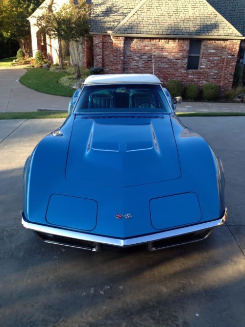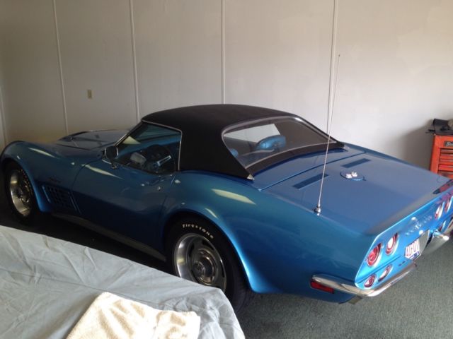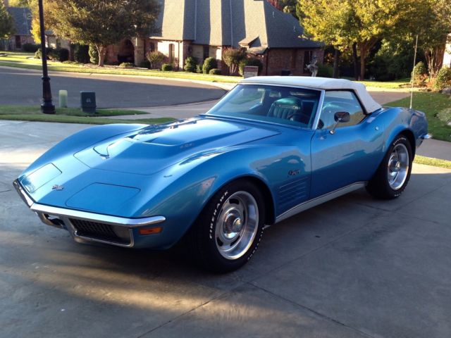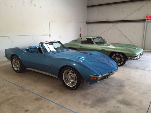 This is the real deal born with engine and drive train. For the first few days the VIN was stamped on the side of the block down by the oil filter. THIS CAR WAS FACTORY AC. The car was found in a KS field in the 80's and a frame off was done at that time (1989-90). It has one repaint which looks to be a perfect match. Same owner had it until 2014 when I purchased. I have a bunch of documentation. These early C-3 big block cars are undervalued at this time and will be highly sought after in years to come. This car is NOT a Top Flight show car. It is a very respectable driver with the DNA and perfect frame to be a show winner if someone wanted to take it there some day. I have a correct date coded hard top and there are a ton of things on this car that are still original and have the right dates if that is what you are looking for. If not it's still nice to know. I will not list all the items here. If you are a serious buyer then contact me for all the details you want. I do not have to sell so bottom feeders don't waste your time. Folks that know classic Corvettes know the potential here. I'm moving on from the classics by choice. The car can be viewed by appointment in Oklahoma City at a private car shop. One of my friends is a 400 point Master NCRS judge and has known the car for 20+ years. I can arrange for him to be there if someone wants. When I bought it I did all maintenance from bumper to bumper and have detailed records/log. I also bought the Year-One Rally 17" rims and new Firestone tires. They really update the car and look awesome. I put in new front springs (550's) so it lowered the front just a bit for a great stance. I of course have the original 15" rims, rings, and caps. For whatever reason the prior owner did not put the A/C stuff back under the hood so it's missing the compressor. (he was deceased so that will never be known why) A first day production, fully numbers correct (born with components) Big Block, Mulsanne Blue, Blue Convertible, 4 speed, with dated hard top is not going to come around often so think about that and good luck. Thanks for looking. Payment by Wire, Cert Bank Check, or Cash. A personal check will be held until cleared if a local bank is not used Don 405-623-1768 cell