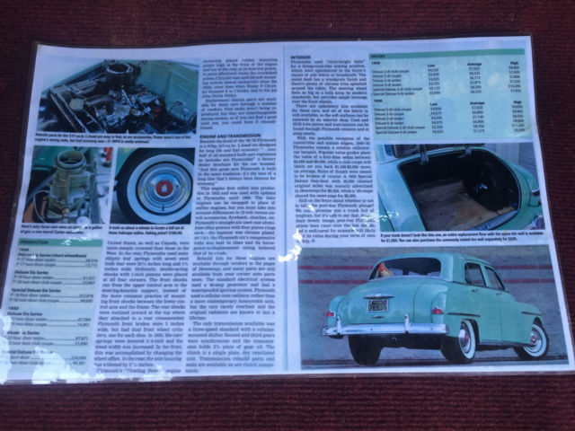 1950 PLYMOUTH SPECIAL DELUXE. Car has the Factory 6-Cylinder Flat Head Engine. Engine cranks and runs very well. Engine has automatic choke {first year of these}. Engine runs smooth and has good power. Car does Not Use/Leak/Burn/ any oil. Engine Holds 40+ LBS. of oil pressure. Transmission is a 3-Speed Manual, It shifts out very smooth is all gears. Forward and reverse work good. Clutch is strong. The INTERIOR is in nice clean condition. Seats are nice, Door panels are nice, Head liner is nice, Carpet is nice, Dash is nice, Chrome on the Dash is clean. Steering Wheel is nice and not cracked. ALL Gauges work. All Glass is in Good Clean condition, windows roll down and up easy. Cowl Vent Opens and works good. All Exterior Lights work. The Chrome on the outside of the car all looks very nice and bright. ****THE REAR BUMPER NEEDS TO BE RECHROMED**** The BODY of the car is in good clean condition, No dents. No known rust is any panels, { I did NOT restore this car, so I cant say what previous owner or painter done} **** DRIVER FRONT FLOOR PAN NEEDS REPAIR OR REPLACING, IT HAS A RUST HOLE.**** Other pans look solid, Trunk Pan looks solid. PAINT is nice and clean and has a Good Shine. Tires are like new, All tires have about 95% Tread Life. NO SPARE TIRE OR RIM. **** This Car was just driven on a 800 Mile round trip with no trouble.**** Brakes are solid. Steering is tight. Car runs and drives good and is very dependable. ========================================================================================================= I have a Clear South Carolina Title in hand. SOLD AS-IS = NO WARRANTY = NO REFUNDS = NO RETURNS = JUST BUSINESS!!!! PAYMENT MUST BE; CASH IN PERSON -OR- BANK WIRE TRANSFER ONLY. PAYPAL IS FOR DEPOSIT ONLY. UNLESS YOU PAY THE PAYPAL FEE'S NO CHECKS!!! NO CHECKS!!! NO CHECKS!!! I REQUIRE A $500.00 DEPOSIT WITH PAYPAL AT AUCTION END. IF YOU CANNOT PAY A DEPOSIT -OR- DO NOT AGREE WITH PAYING A DEPOSIT..... PLEASE DO NOT BUY MY CAR. EBAY FEE'S ARE VERY EXPENSIVE AND THIS IS NOT A GAME. I can have this Car Delivered to You Anywhere in the GREAT U.S.A. {lower 48 only} FOR JUST $1.00 {one dollar} PER MILE = ONE WAY FEE.. I will need YOUR TOWN AND ZIP CODE to give a True Delivery quote. Car is Located in Darlington South Carolina 29532 Any questions...Please Call or Text 1-843-496-4535 Thank for looking.