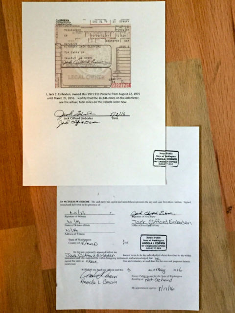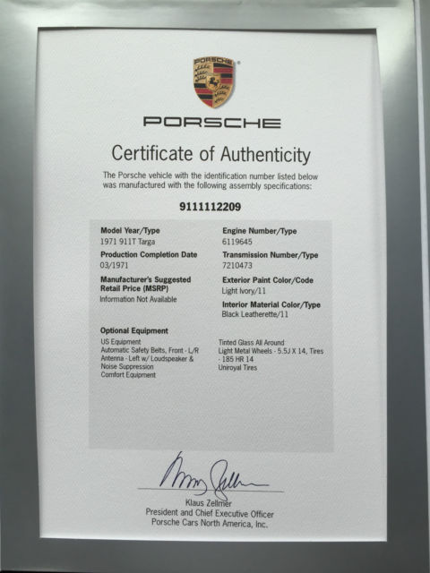 1971 Porsche 911 TTarga / Sportomatic Only 26k Original Miles!Several Rare OptionsVIN: 9111112209ENGINE: 6119645TRANS: 7210473Numbers Matching Super Rare 911!! Sportomatics were VERY low production cars and are rapidly increasing in value. You still shift, you just don't have a clutch pedal. Last owner bought in 1974 with 17k and RARELY drove it. It was put into dry heated storage in 1989 and hasn't started since. Properly stored with ATF in the cylinders and a clean fuel system. Completely original except for a color change in 1974 and a windshield replacement. Car was never wrecked. The car started as Light Ivory and was changed to Black. Absolutely rust free California car. Beautiful pan! This car has never been restored, modified or taken apart. Original Koni shocks. Clean and dry in storage / spare tire area. Original Fuchs Wheels and Comfort Equipment car! Sportomatics are very rare and fun to drive. Wouldn't take much to get this rare 911 back on the road. Rolls and steers, engine rolls over smoothly. Excellent candidate for repaint and drive or full restoration. All Michelin tires date to the early 70's. I just had to replace a front tire that was cracked and losing air. Car has been inspected by a professional Porsche restoration company and they verified the miles and originality. Includes a Porsche COA. Also, a copy of the original title from 1974 when purchased with a notarized sworn statement from last 42 year owner verifying miles. Feel free to call for more info 360-440-5301