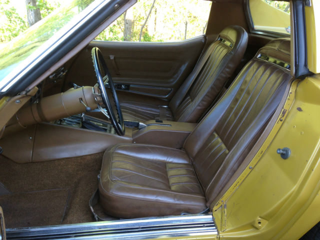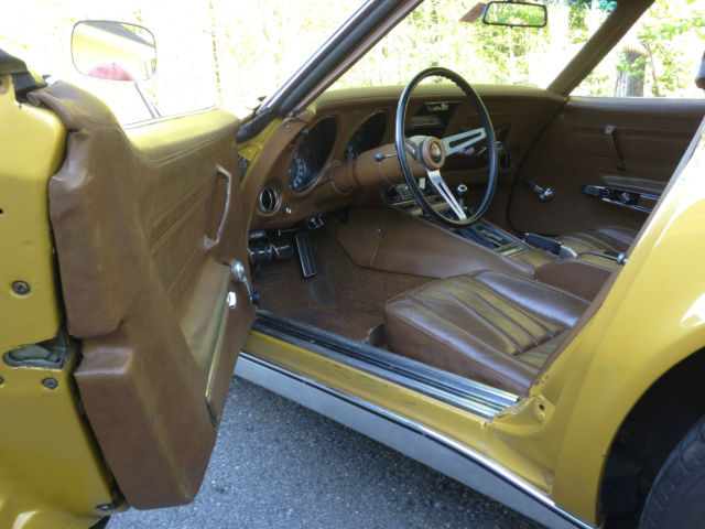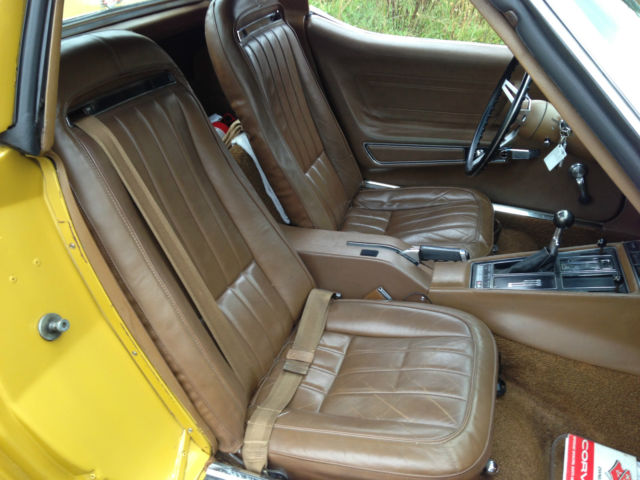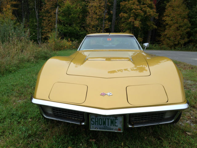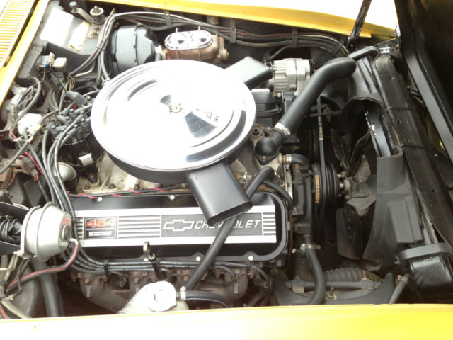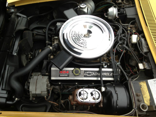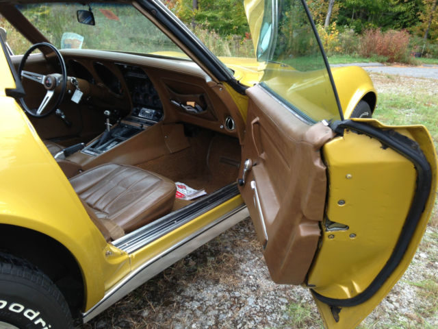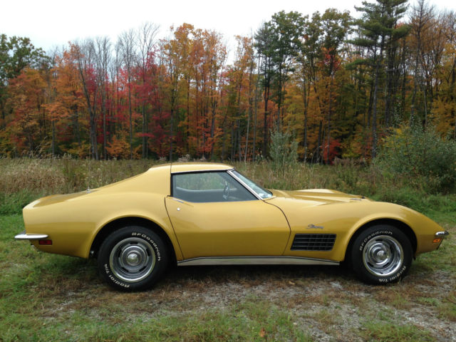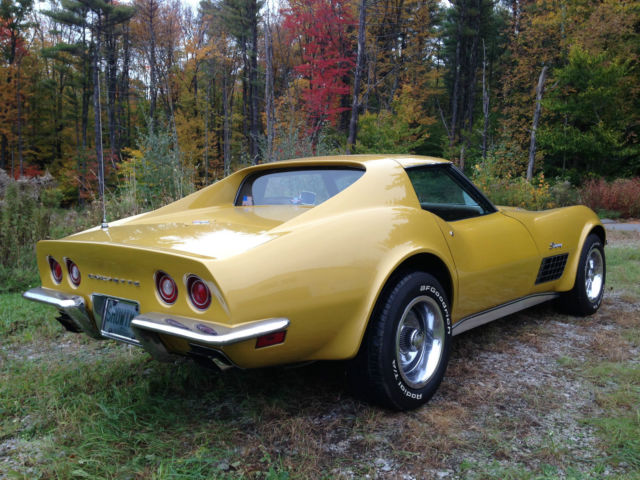 1971 Corvette 454 4-speed Current owner purchased this car in 2002 and has put 13,500 miles on it since. Just prior to purchasing the car the previous owner rebuilt the motor and repainted it in the factory original warbonnet yellow. In 1973 the original 454 motor was replaced under warranty by GM with a 454 LS5 motor bearing codes for "non specific use". So although this car still retains the factory original color and 454 4 speed configuration, it is technically no longer a matching numbers car. Having said that, it is a very well preserved example. The entire interior is in excellent original condition with the exception of the carpets which were replaced in 2000. Leather seats show a bit of patina but are soft and in great shape. This car has removable T-tops as well as the rear glass. It's a turn-key driver ready to continue its life of cruze nights and week-end car shows. The exhaust, brake, and suspension systems are all in great shape. The frame is rust-free and shows no signs of any previous repairs. The paint has some flaws but is pretty nice for being 15 years old. In 2001 at the time of the engine rebuild the odometer was rebuilt and set back to zero so the overall miles from day one is unknown. The two current issues needing attention are the vacuum assisted wipers which are not operating as they should and the steering which has more play then it should. This car drives great and has plenty of power. For the past 13 years it's been garaged and only driven in nice weather, averaging about 1,000 miles a year. I encourage all potential buyers to inspect the car or contact me for additional pictures or info if needed. This car is being sold with a clear New Hampshire title as well as a bill of sale. Sale also includes shop manual, repair records and photo album from motor build. No trades please. VIN 194371S101284