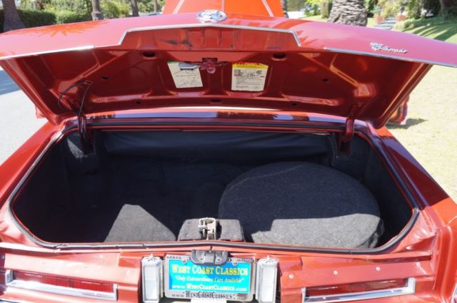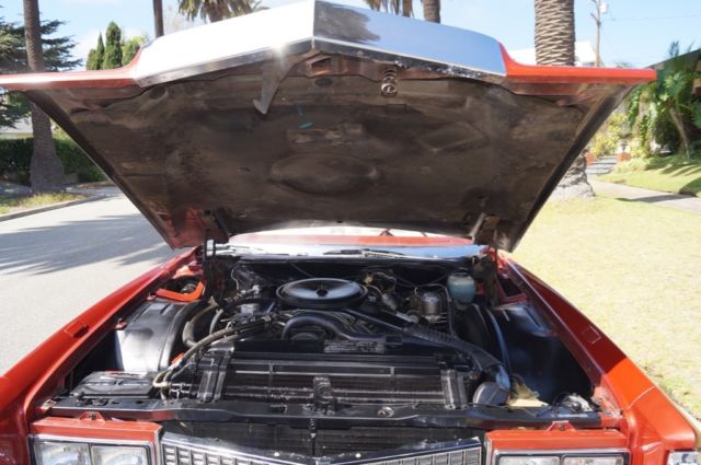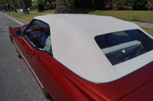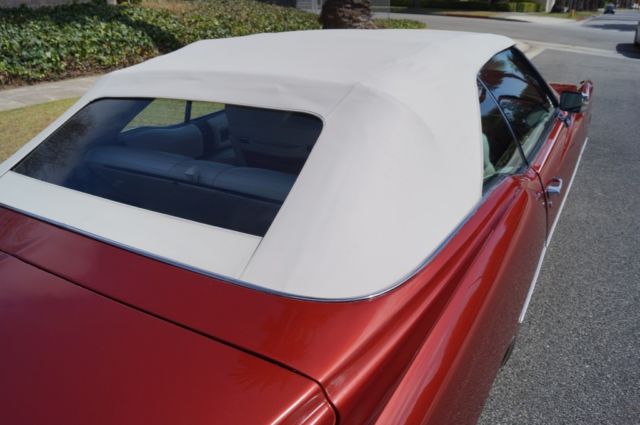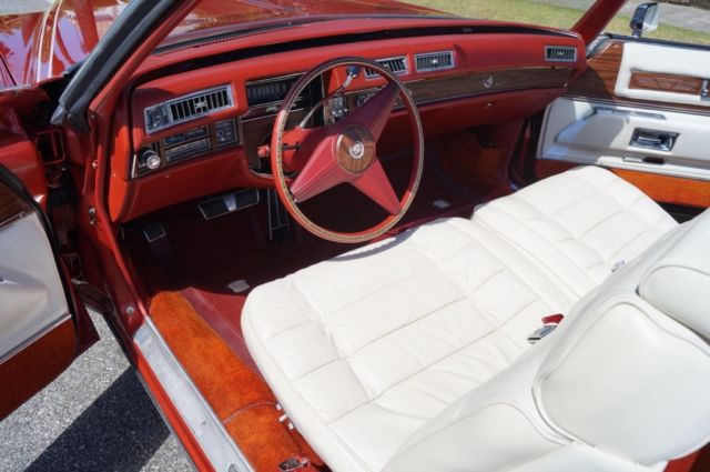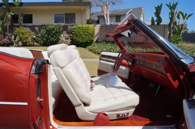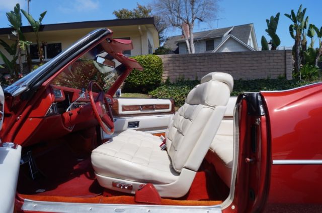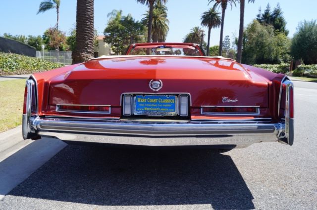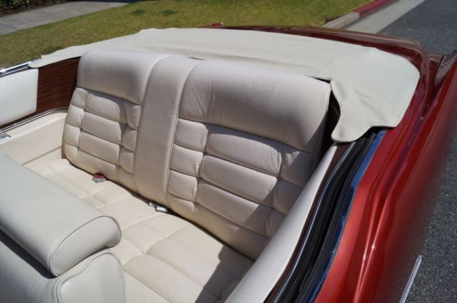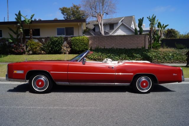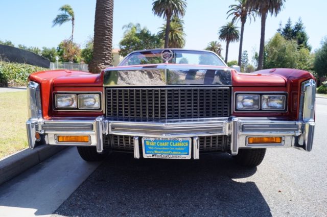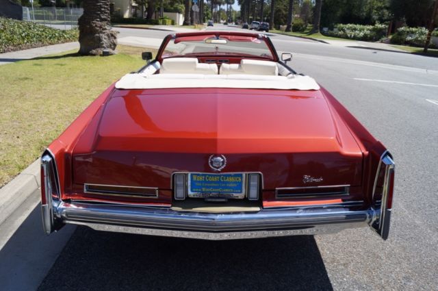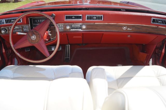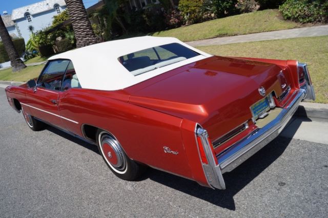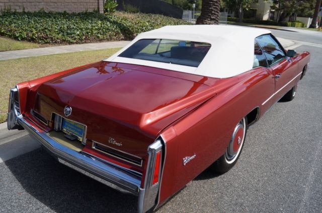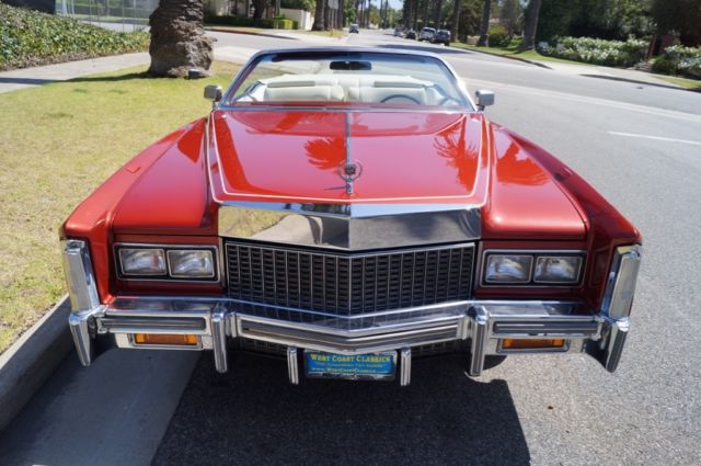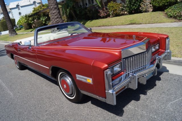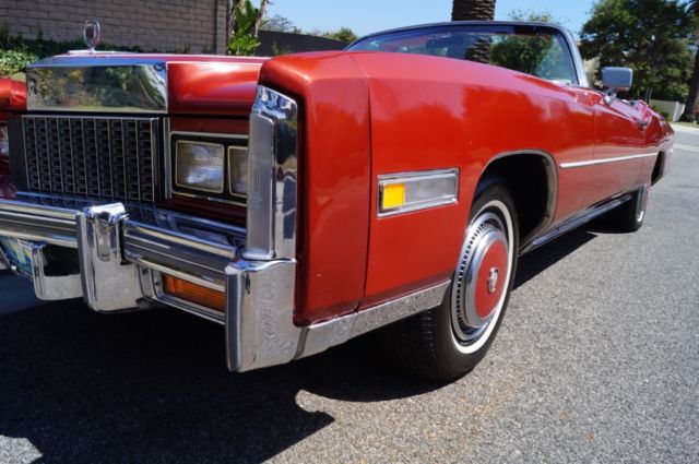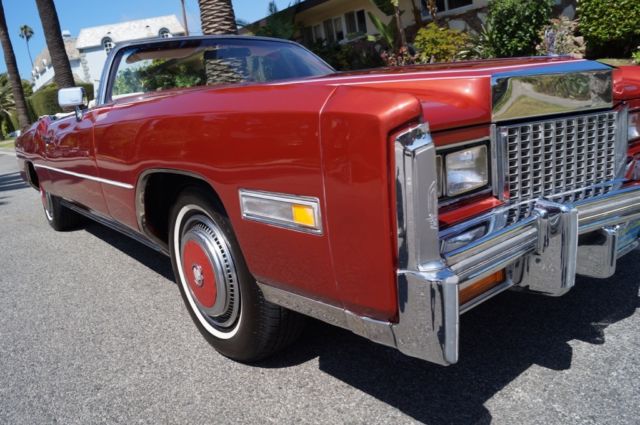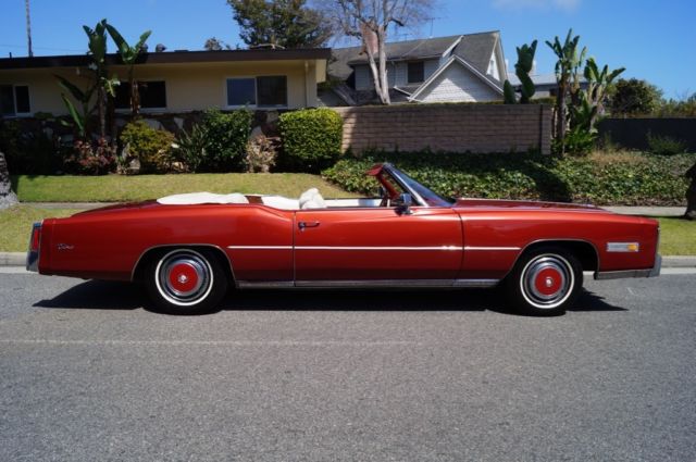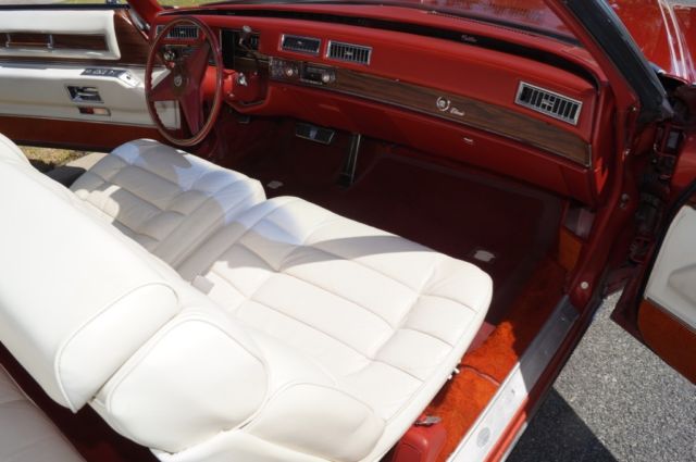This particular example has obviously always been pampered since new. Obviously an always garaged car without any rust whatsoever! The whole car is apparently completely rust and accident free - the car is very striking in its original factory 'Firethorn Metallic' color code 36 paint with a gorgeous and original matching 'Dark Firethorn' Trim Code 72 Sierra Grain leather interior with a matching dashboard and carpeting and a matching 'Cotillion White' Color Code 11R power soft top with a glass rear window in beautiful as new condition. Cadillac introduced a new softer, suppler and 'shirred' 'Sierra Grain' leather interior in 1975 with the shirring technique gathering material into rows which creates wrinkles and folds that essentially have invisible seams. The leather for 1975/6 is noticeably thinner and softer when compared to earlier Cadillac leathers however, when properly cared for, it retains its softness and flexibility and is known to wear better than other leathers. This is the last and most desirable year of this legendary classic Cadillac. The original engine with believed to be only 78K original miles is extremely strong and powerful and this particular car drives absolutely magnificently and must be driven to be appreciated and seen to be believed - drives straight as an arrow with no strange road wobbles, shakes or rattles - a truly remarkable car that must drive almost exactly as when it left the showroom floor almost thirty-five years ago and which needs nothing but a new proud owner!