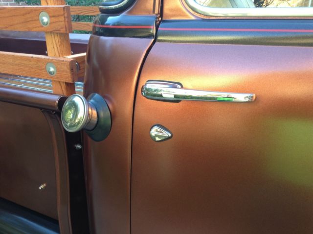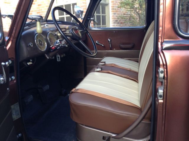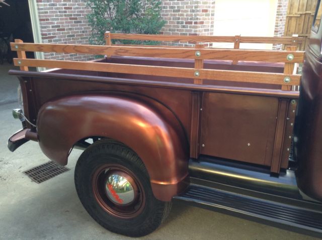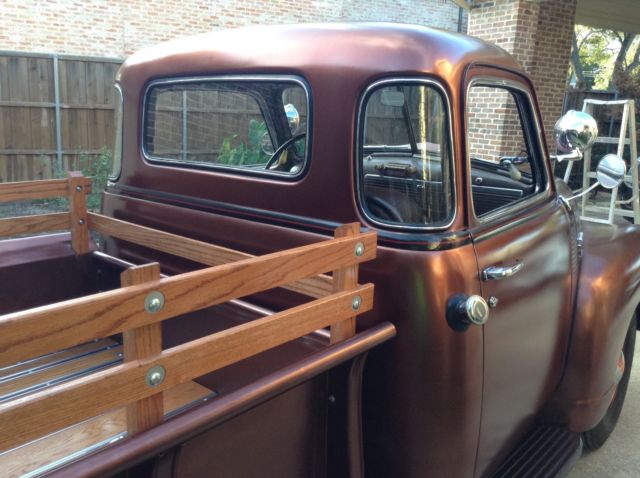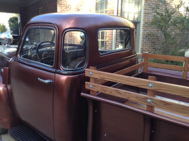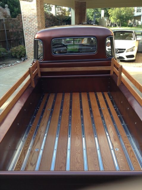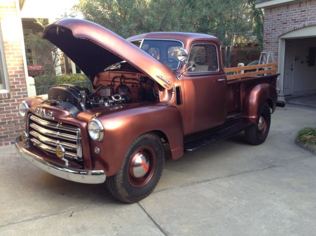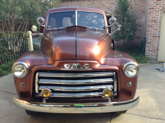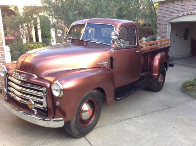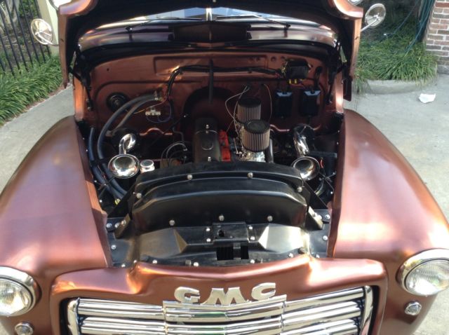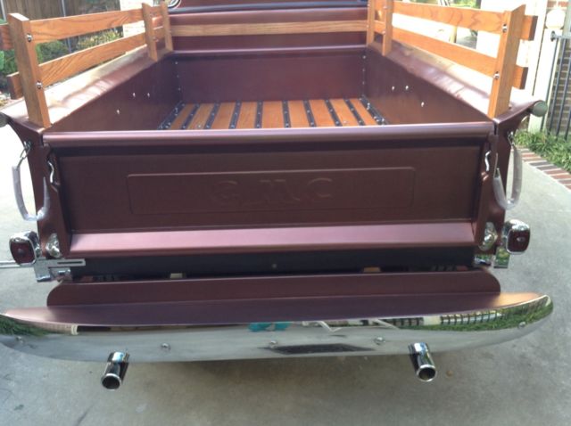 Complete rebuild of original drivetrain & chassis: GMC 228 engine, head, clutch, 4-speed on the floor with "granny gear", drive shaft, rear end, powder coated frame, spring leafs, lever arm shocks, dual circuit brake system, front end and steering linkage with drive box.Performance modifications include .08 overbore of long block, full-flow oil filtering, dual 2-barrel Stromberg carbs adapted to original manifold, Fenton dual exhaust headers with custom routed muffler pipes. Electrical system converted to 12 volts includes orig Delco starter & generator, regulator, new Mallory dual point distributor & coil, new wiring harness, 4 corner lighting with halogen headlights and turn signals. New water pump, radiator with expansion cylinder and hoses.All body panels COMPLETELY disassembled and cab treated by strip and derust immersion process. Reassembly with new fasteners preceded by epoxy and urethane primers with initial lacquer base coat followed by final lacquer and clear coats.Cab restoration included new door handles, hinges, panels, headliner with insulation, visors, gauge cluster and speedometer, vintage GMC repro stereo am fm radio, and 7 new glass windows allowing a surround view. Restored air flow heater with control valve and defroster ducts, vacuum wiper motor with linkage, fuel tank with new sender, and all pedal controls. Traversing seat with new era appropriate upholstery. Sound deadening applications throughout.Rechromed original grill, badging, radiator fan and added trumpet horns. Color coordinated powder coated engine side and valve covers and intake manifold. New bumpers with valences and vintage Unity spot and fog lights, chromed fuel tank linkage. Powder coated orig split rim wheels with new 750-17 tires. Bed finished with top grade stained oak and side rails with stainless linings and fasteners.Only 68 miles and runs FANTASTIC!