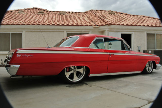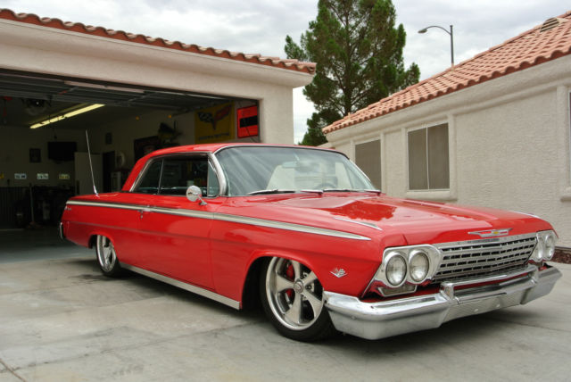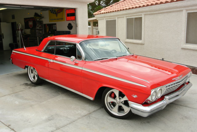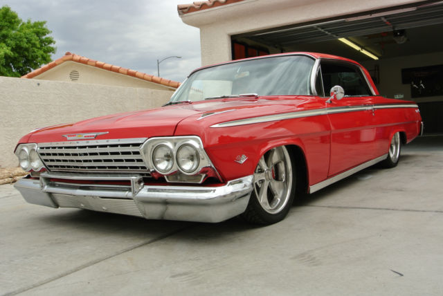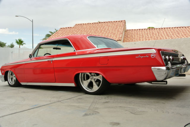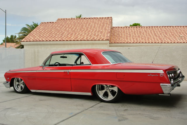 Exterior/Interior Red, not sure exact color as the car was painted that color when I bought it. Boyd Coddington Wheels with Kuhmo Tires, 245/40/18 up front and 255/35/20 in the rearBlack tweed and pleather bench seat in the front and in the rear.Vintage Air Gen IV system AutoMeter gaugesAftermarket Classic looking stereo with MP3 hookup (This is just mounted, not installed)iPad dock hidden in glove box that is used for music player etc...Lloyd's Impala floormatsSony speakers up front and rear and subwooferEntire car has been soundproofed with Dynomat, solid floors Engine/Drivetrain/Brakes/Suspension SBC 350ci, I believe it has around 50k on the engine, runs good.700R4 transmissionMarch pulley setupWilWood Chrome Master Cylinder and brake booster (2) 10" Electric cooling fansAluminum radiatorWilwood 6 piston calipers on 14" drilled and slotted rotor in the frontWilwood 4 piston calipers on 12" drilled and slotted rotors in the rearRide tech Level 2 air ride suspension kit, Shockwave struts in front, bags in the back.Ride tech Billet tie rod adjustersAll new updated wiring and fuse block through entire car.All new carpetAll glass is good, no cracks, chips or anything.There is probably a lot that I am forgetting but I will update this ad if I recall more. This is a good car and I hate to get rid of it but she just sits in my garage collecting dust since I travel too much, I have only driven the car twice in the last year and that was to local cars and coffee meet. The car is NOT a frame off restoration, it is a good solid car. I spent a lot of time and money putting this together and the only thing I know it needs is HOOD HINGES!!! They are good and not faulty but they are the typical 1962 hinges that everyone knows about to where you shut your hood and then you need to walk around and push the back corners down to level the hood. Feel free to message me with any questions, thank you. Robert