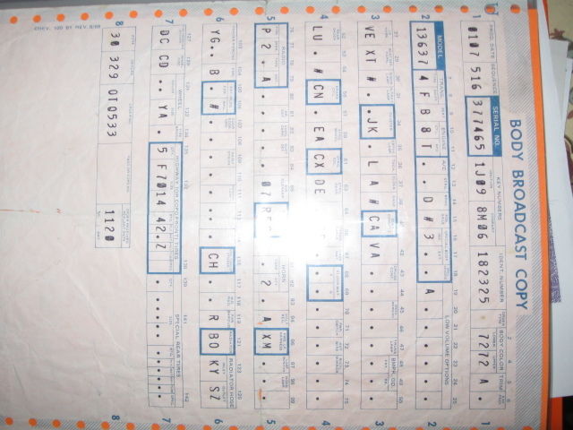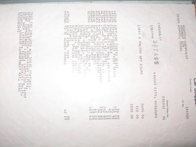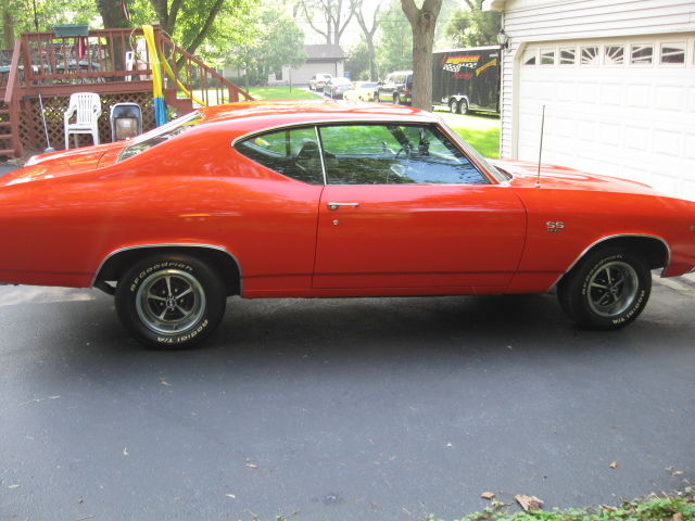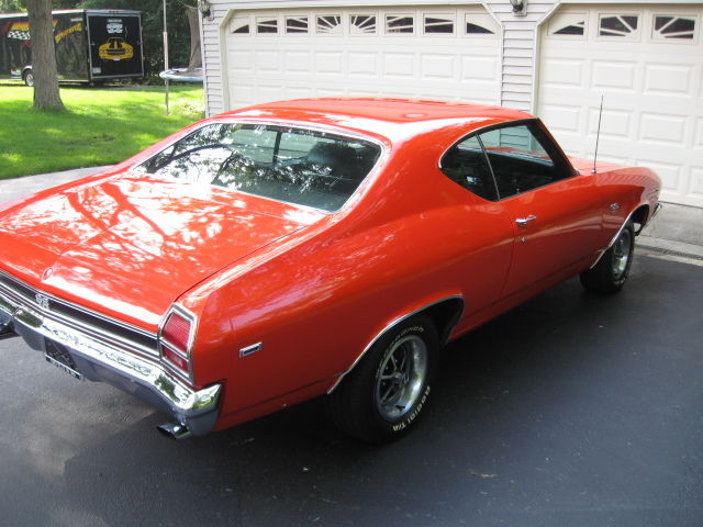 FOR SALE/AUCTION 1969 CHEVELLE SS 396/375 H.P. CARTHIS 1969 CHEVELLE IS A SUPER EXAMPLE OF A âREAL DEALâ NON RESTORED SS 396 375 h.p. CAR. IT IS A TEXAS CAR AND LIVED THERE TILL 1999.*I AM THE FOURTH OWNER*THE CAR GOT DELIVERED TO KEATON CHEVROLET IN LATE 1968/EARLY 1969*THE FIRST OWNER TITLED THE CAR 2/21/69, AND OWNED IT TILL 7/7/1972*THE SECOND OWNER PURCHASED THE CAR FOR $ 1450.00 (1972)*HE OWNED THE CAR FOR APROX 27 YEARS*WHILE HE OWNED IT, IT WAS HIS DAILY DRIVER AND RACED THE CAR ON WEEKENDS AT A LOCAL TRACK IN TEXAS*HE ALSO REBUILT THE TRANS & REAR END, INSTALLED NEW SHIFTER LINKAGE, INSTALLED A 350 HP CAM, AND TOUCHED UP THE HEADS.*HIS BUDDY PAINTED THE CAR.*IT WAS PAINTED THE PROPER COLOR, MONACO ORANGE, PAINT CODE 72 OVER WHAT I BELIEVE IS THE ORIGINAL SHEET METAL.*HE ALSO REDID THE INTERIOR.* THIRD OWNER PURCHASED IT AND BROUGHT IT TO THE CHICAGO LAND AREA IN 1999*HE DROVE AND ENJOYED THE CAR, DID REGULAR MAINTAINENCE ON THE CAR, REBUILT THE CARB, AND ADDED A FEW SUSPENSION GOODIES.*IT WAS HARD FOR HIM TO SELL IT TO ME.*THE CAR HAS A NOTEBOOK FULL OF DOCUMENTATION AND REGISTRATIONS, IT INCLUDES:·SHIPPER/DEALER DELIVERY PAPERWORK TO KEATON CHEVY·BODY BROADCAST BUILD SHEET·MANY YEARS OF REGISTRATIONS OF PREVIOUS OWNERS·LOAN DOCUMENTS·BILL OF SALE FROM FIRST OWNER TO SECOND·BILL OF SALE FROM THIRD OWNER TO FOURTHTHIS HIGHLY DOCUMENTED 1969 SS 396 375 H.P. CAR HAS SURVIVED AND STANDS PROUD AND TALL. SHE DRIVES FANTASTIC, SHIFTS SMOOTHLY, AND HAS GREAT POWER. IT IS A PLEASURE TO DRIVE. SHE IS NOT A BARRETT JACKSON SHOW CAR AND IS NOT PERFECT. SHE HAS A FEW PAINT/PREP FLAWS, BUT NO WAY WILL I CHANGE THAT ON A GREAT CAR LIKE THIS.THE CAR IS âPERFECTâ JUST AS SHE SITS THIS CAR HAS A DATE CORRECT (1968) 396 325 HP MOTORM21 IT HAS THE 12 BOLT WITH 4:10 POSITHIS CAR IS NOT A MOTOR MATCHING CAR, BUT IT IS A 69 SS 396 375 DOCUMENTED CAR.IF YOU HAVE ANY QUESTIONS PLEASE CALL AND I WILL ANSWER THEMJEFF M. 708-308-0282