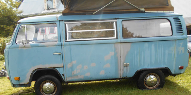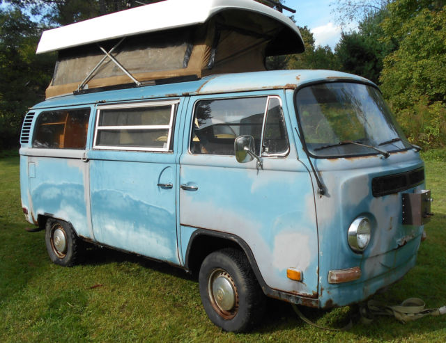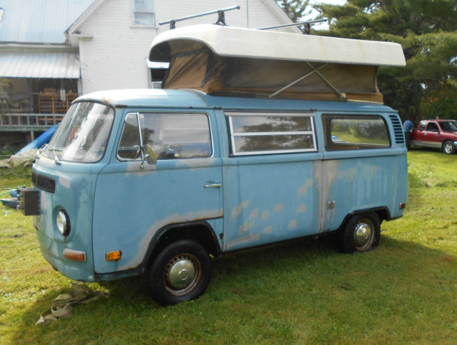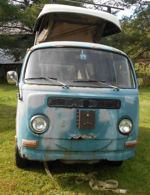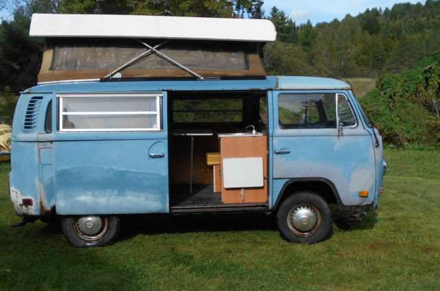 Available today, My 1972 Volkswagen bus camper, westfalia,riviera, Sportsmobile, Andrews Indiana, Penthouse pop top. This is a clean, complete original example! It's been in a barn since 1989, was last driven and inspected then. Before that at some point it was sold at a car dealership in PA and took summer trips to places like "Kings Dominion in Virginia,based on the stickers on the bumper. Milage could be original, speedometer is at 103,700, maybe only gone over once. Engine was said to have run when parked, turns over freely,engine is stock, correct, original in appearance. is believed to to been stored in running condition. Nice time capsule, almost 100% complete and original. I found some nice Holland made rocker parts to include, bumpers are in good shape, I removed them after purchase. it does not run currently, I never took the time to investigate. The bus has a westy package and the american made poptop. Pop top canvas is intact, but would benefit from replacement,old, worn, stained, etc. This bus is all there,complete, out of circulation for the last 25 years. As pictured, tires are rollers only, this van needs a restoration, is a prime candidate. Will need left and right inner and outer rocker panel repair. All parts pictured are included in the deal,comes with some nice holland made rocker repair panels. Cargo area floors and front floors are very solid, will not need much work. I can help arrange insured professional transportation for $1.50 to $1.75 per loaded mile, from zip code 05826. Buyer is responsible for pick up from my location. AS pictured, used, parked for 25 years inside, dry, original, complete Volkswagen bus, as pictured, has some rust, and has not been driven since 1989. Time Capsule! This bus will need mechanical work to be road worthy, is believed to be road worthy when parked. It will also need body work,etc. Is being sold as a project vehicle. This van is being sold with the bill of sale only, no title, in VT cars older than 10 years are not issued a title. Included in the purchase is a State of Vermont bill of sale.