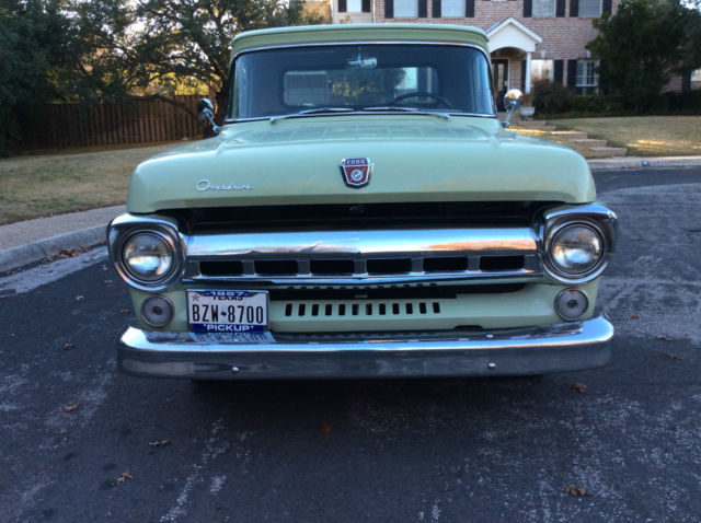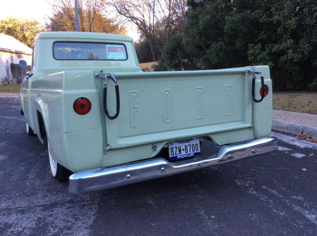 New Parts and Rebuild include: Soda blasted frame, cab, fenders, hood, box primed and painted Ford Willow Green.4-6.70 X 15 tires, 2 3/4in. whitewalls, chrome beauty rings, chrome Ford hubcaps.All new wheel brake assemblies, drums, brake lines, and wheel axle bearings.Rebuilt 6 cylinder 223 cu. in. engine, w/new bearings, pistons and rods, rings, valves, gaskets, and motor mounts.New clutch, resurface flywheel, new pressure plate, pilot and release bearings, and slave cylinder.New brake and clutch master cylinder.New rule pump, water pump, radiator, and chrome overflow tank.New plug wiring, distributor, voltage regulator, coil and resistor.Rebuilt 1 bbl Holley carburetor with glass float cover.New wiring harness, overdrive solenoid, relay and kick down switch.New upholstery: seat, side door panels, under dash kick panels, sun visors, and headliner.New floor carpet with heat shield floor cover, and arm rests.Rebuilt starter and generator.New batter, cables, wiring, and fuse block.New king pins and bushings, Monroe gas shock absorbers.New side, rear and vent window glass, window seals, rubber door seals, and window tracks.New chrome instrument dash plate, chrome "Custom Cab" emblems, side rear view mirrorsNew muffler and tail pipe.Rebalanced drive shaft.New headlights and horn assembly.Removed and cleaned fuel tank and installed new tank gauge assembly.New tie rod ends, u-joints, and drag link.New electrical switches for oil, water, headlights, ignition, wipers, floor dimmer, turn signal switch.New black steering wheel.New windshield wiper motor, firewall insulated shield.Plus numerous nuts/bolts, wires, clips and parts necessary for the bumper to bumper restoration.This vehicle took 4 years of dedication and hard work for the restoration to come true. I have driven the truck for 2 years after restoration for personal pleasure and am selling it because of personal illness (cancer) and family reasons. The truck is located in San Antonio, TX. Have a clear title in hand, current registration and inspection, and is ready to drive.