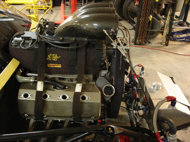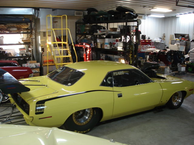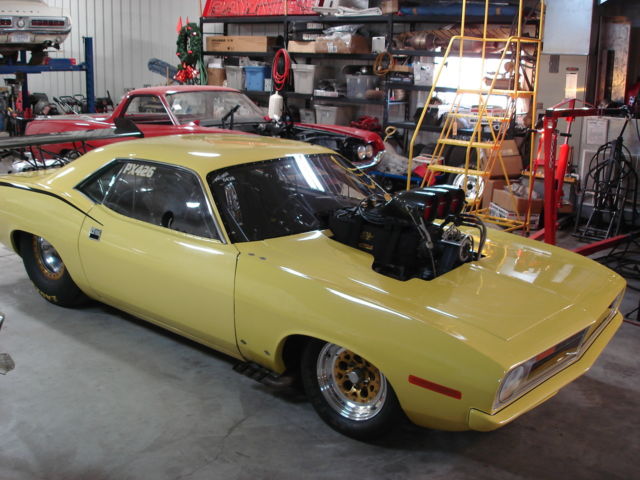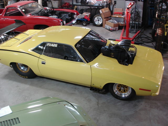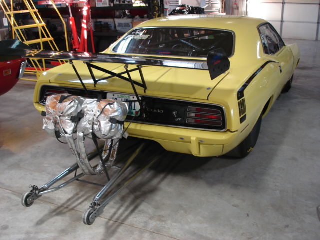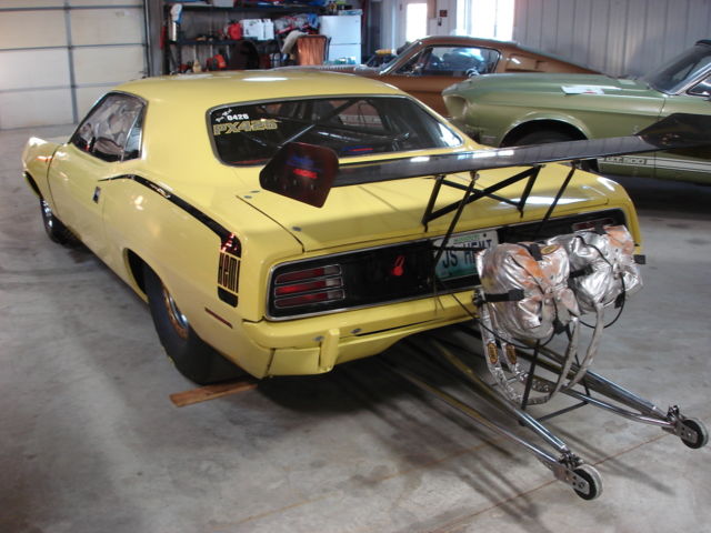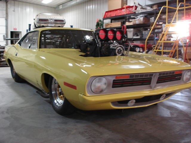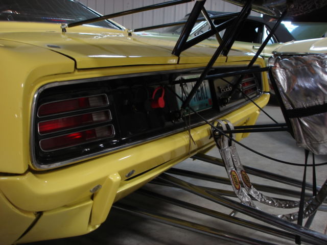 The block is a TFX96 4.5 bore with 4.5 stroke. Brad Anderson's BAE 5 aluminum Hemi heads. Sonny Bryant crank. PSI Roots 1471 blower with carbon hat. Engine was fresh when parked in the climate control garage several years.The transmission is Lenco 3 speed CS1 with a Crower clutch and Trick titanium can. The rear end is a Fab Housing with a 9.5 Strange center section with 40 spline gun drilled axles.Other options include ProMod wheelie bars, dual chutes, fire system with dual tanks, tranny blanket, engine diaper, blower restraint, Weld wheels with rear beadlocks (Rear 33.5x17.0-16 Front 26.0x4.5-15), Strange brakes, shocks and struts. Carbon fiber removal floor and wheel tubs. AND MUCH MORE..... It's time to update the NHRA chassis sticker as the Cuda has been parked and not at the track recently. It's completed less MSD 44 Ignition, plug wires and mag. The Cuda cost a fortune to build and is ready for a new owner and or new race team. Has a low reserve and we're not really interested in a trade. Might consider a partial trade of a Ford crew cab pickup which can used as a company vehicle. Please email or call with any questions. Thanks, Chris 816.590.7660.