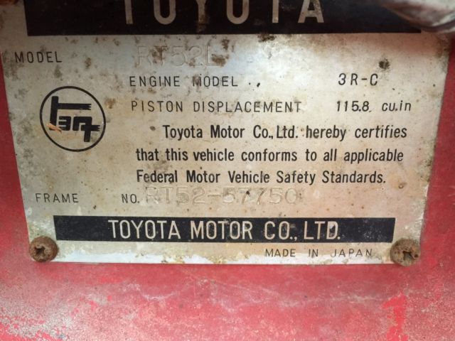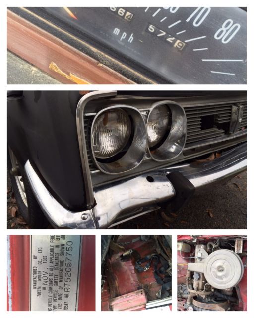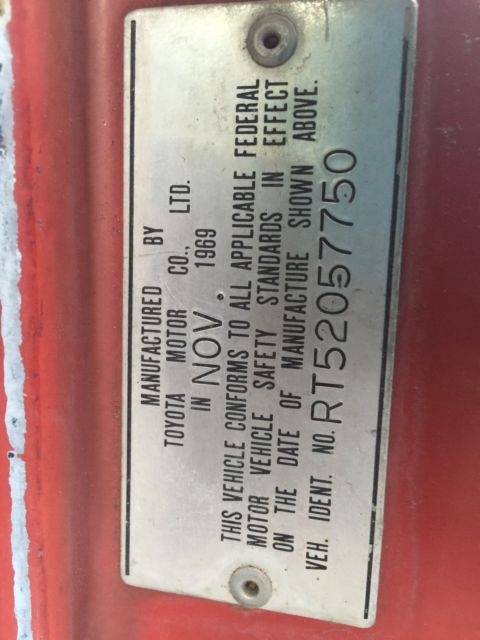 Obviously it is not a Corolla! Technical specifications of Toyota Other 1970Price:US $2,495.00Condition:UsedItem location:Roswell, Georgia, United StatesMake:ToyotaModel:OtherType:CoupeTrim:DeluxeYear:1970Mileage:28XXXVIN:RT52057750Color:RedEngine size:1900ccNumber of cylinders:4Transmission:AutomaticDrive type:RWDInterior color:BlackVehicle Title:ClearYou are interested?877-356-8827 Ext 1 Car descriptionUnrestored 1970 Toyota Corona RT/52- The Corona appeared with its slanted front end and quad headlights in the grill, designed with the help of Italian designer Battista Farinnia. This was Toyotas first success in the American car market.- Offered here is an unrestored Toyota Corona RT/52, manufactured in November back in 1969.This car is in mostly, original.- The car has its original 3rc engine producing 90 horsepower mated to a 2-speed Toyota Glide transmission- The car is ready for a full restoration.The body is dry with minimal rust. Engine turns over easy and does run with a battery and auxilliary gas tank.Not sure of the contents of the tank, as we bypassed it.- The car is dry and fair inside and out and is in pretty rough condition overall.- With Japanese collector cars on the rise here is your chance to own one of the best looking classic Toyotas.Repair manual included!This particular car is actually a good solid candidate for restoration, racing, or just drive it as is with little repair effort.The tires are brand new, never used, not even rolled to the car. We planned to drive it as is and restore it later. New fuel line, filter, and spark plugs installed. With a borrowed hot battery, the dash ights come on, and most electronics came to life.Someone started to take it apart. Seats are not bolted in, a few things like the floor shifter plastic is removed, but included.While things are loose, as in the seats and carpets removed, this is a great time to clean it up.Dents and dings tell you it's been around the block. The original red paint peeks out from the lame black spray can paint job the previous owner gave it. Rubber is cracked, door sticks, back trunk key assembly is in a box, and routine evidence of a weak attempt to start cleaning it up.It is not running, it does not drive, and the brakes are completely shot and only holds with E brake.The pictures do tell the story. Since it is a pre 1986, it will come with transferable paperwork according to the laws of Georgia.I can ship it to you probable cheaper than any broker can quote you. Questions?