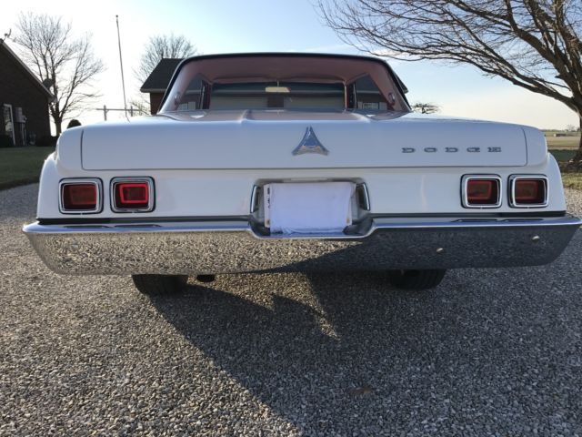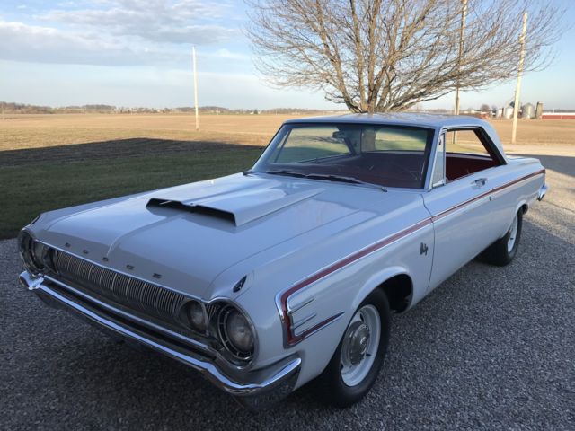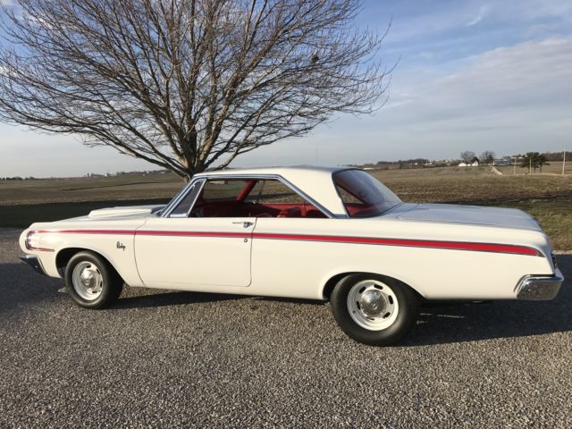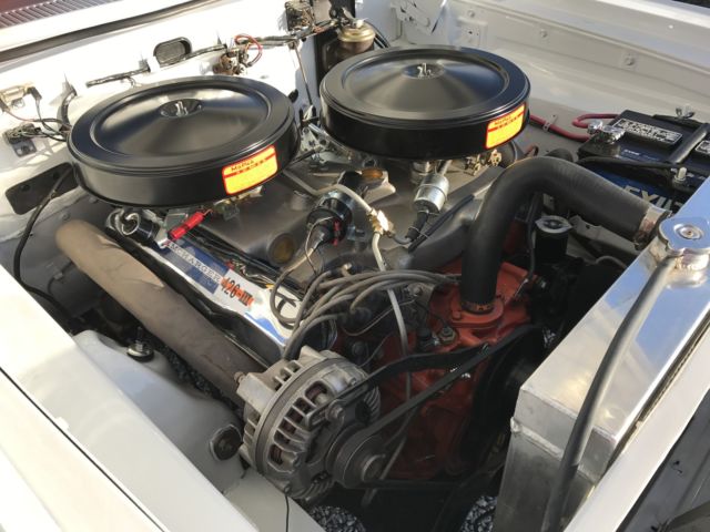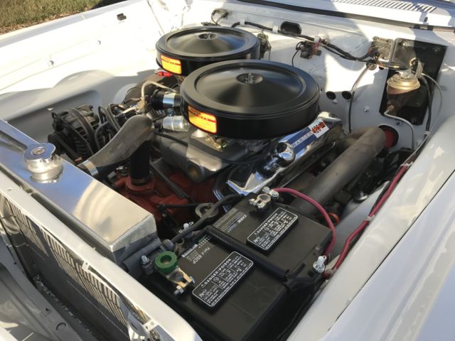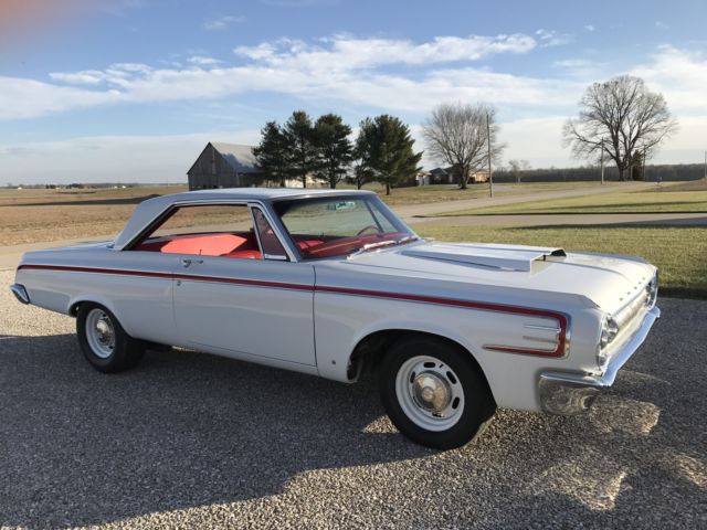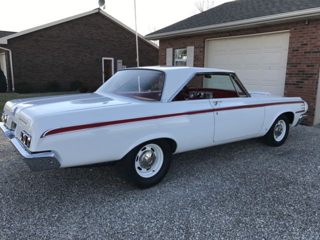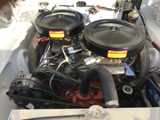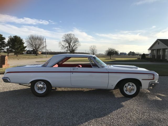 Paint is bright white and is perfect. Tires, wheels, and hub caps are also new. New 2 1/2" exhaust. New drum brakes all around and work well. All stainless trim and chrome is either new or polished. Underside of car still retains original undercoating and is rust free. As is the trunk rust free. New gas tank and sending unit. Instrument cluster was sent out and recalibrated and finished to perfection. Radio and heater delete. All gauges and lights work properly. Engine is a 1966 440 out of a Dodge Charger. Transmission is the original 1964 out of this car. Rear end is a 8.75 with a 3.55 sure grip. Engine and transmission was rebuilt last year and has approximately 2000 miles on them. Max wedge intake and carb set up was bought from A & A Transmission this summer and added to the car during reassembly. Max wedge exhaust manifolds were put on the car at the same time of assembly. Starts, stops, and runs fine. Car has only 80 miles on it since it was restored. All four shocks are new. New aluminum radiator. All that is left to do on this car is a disc brake set up. I thought I would let the next owner put on what they wanted. I have tried to explain this car to the best of my ability. Car is sold with no warranty implied. Any question please feel free to contact me. Car is listed locally. I reserve the right to end auction early.