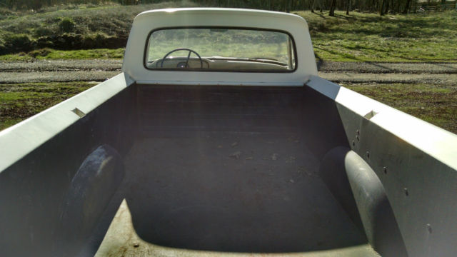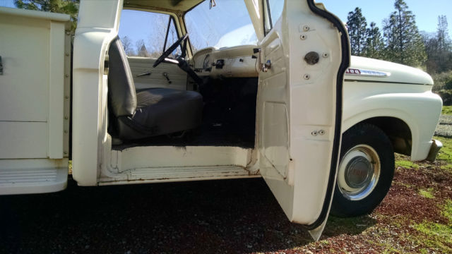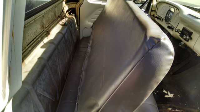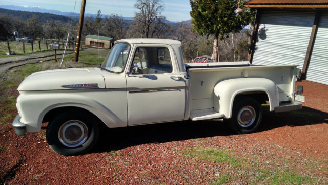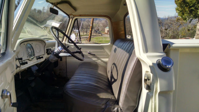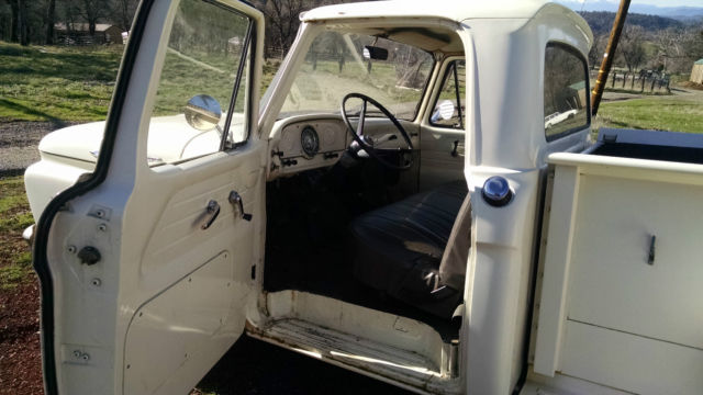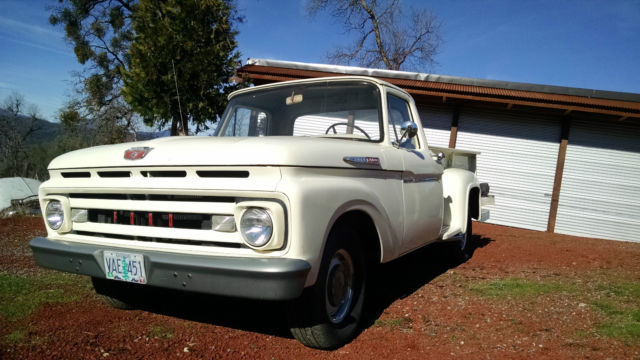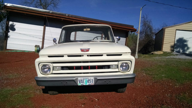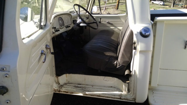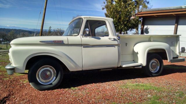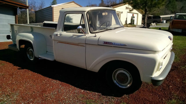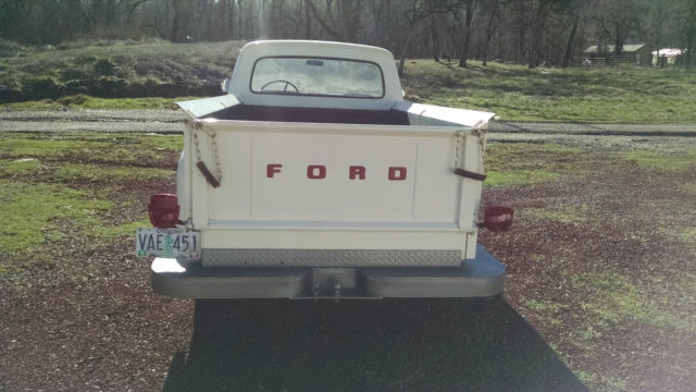 THE TRUCK IS RUST FREE AND SOLID WITH THE ORIGINAL FORD SCRIPT GLASS STILL IN IT. ABSOLUTELY NO CANCEROUS RUST REQUIRING ATTENTION IN THE FLOORS, ROCKERS, CAB OR ANYWHERE AS YOU CAN SEE IN THE PHOTOS. THIS WAS THE FIRST YEAR OF THIS BODY STYLE. IT HAS BEEN WELL MAINTAINED OVER THE YEARS AND NOT ABUSED, JUST LOOK AT THE BED AND BODY. I USE NOTHING BUT AMSOIL IN IT FROM FRONT TO BACK AND EVERYTHING IS CURRENT ON SERVICE. HARD TO FIND ANOTHER '61 IN THIS ORIGINAL UNMOLESTED SHAPE UNLESS YOU GO TO BARRETT JACKSON. TRUCK EXTERIOR WAS REPAINTED ABOUT 7 YEARS AGO THE ORIGINAL FORD WIMBLEDON WHITE COLOR WITH RED ACCENTS AND THE BUMPERS ARE CUMULUS GRAY. I DID NOT WASH, BUFF OR WAX THE TRUCK FOR PHOTOS, JUST PULLED IT OUT OF THE GARAGE.I INSTALLED A MOTORCRAFT 2100 500 CFM CARBURETOR, PATRIOT HEADERS AND NEW EXHAUST WITHIN THE PAST YEAR. HAS PERTRONIX ELECTRONIC IGNITION CONVERSION IN ORIGINAL DISTRIBUTOR. I STILL HAVE THE ORIGINAL CROSSOVER EXHAUST PIPE AND MANIFOLDS IF INTERESTED. THE 292 RUNS GREAT AND THE CHOKE WORKS AS IT SHOULD FIRING RIGHT UP EACH TIME AND KICKING DOWN. PLENTY OF OIL PRESSURE TO THE TOP END AND SOUNDS HEALTHY. YOU'LL GET A PUFF OF SMOKE WHEN YOU FIRST COLD START IT THEN IT CLEARS RIGHT UP AND IT DOES NOT USE ANY OIL OR RUN HOT. THE TRUCK ZIPS DOWN THE HIGHWAY AT 70 MPH AND IT FEELS GREAT. RUNS COOL IN THE SUMMER IDLING OR ON THE ROAD UNDER LOAD. YOU CAN DRIVE THIS TRUCK HOME. IF YOU'D LIKE TO DISCUSS THE TRUCK, PLEASE SEND ME A MESSAGE WITH YOUR NUMBER. SERIOUS TRUCK BUYERS ONLY PLEASE. LOOK AROUND AND FIND ANOTHER ONE LIKE THIS.