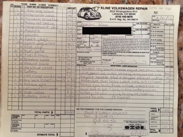 I began by having it professionally outfitted with a brand new rebuilt motor, an 1800 long block with dual baby Weber carbs from a top-notch shop in San Diego called "Kline Volkswagen". The receipt in the photo details the work completed and totals to $4,308. At the same time I had a professional install new commercial grade KYB shocks and new tires. Since the installation of the motor, shocks, and tires - the bus has been driven about 200 miles. I then shipped the bus across country to my house in NJ to complete the remaining projects at my garage. I had new foam cushions installed on the back seats, and while continuing work, had installed a temporary non-matching black cover set, simply to protect them from dust, etc... The original seat material cover was carefully removed and will be included with this vehicle in the auction. I also will include an additional front push out "vent" window that I acquired while shopping for parts. I never had the opportunity to use the camping gear, but I'm told by the previous owner that it was in working condition. Aside from a tear in the tent material of the pop-top - the top is in working condition. There is a light warp on a small piece of the top which has not impaired it's functionality. The bed on top is still outfitted with the original material and cover. I didn't plan on replacing it because it appears barely used. If you have any questions, or would like to schedule an appointment to view, please email or call me directly at (917)940-5997. Additional photos available by request. California title in hand.