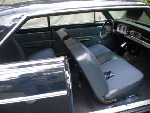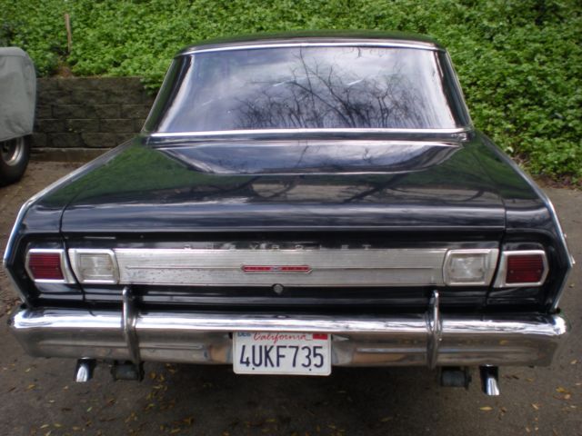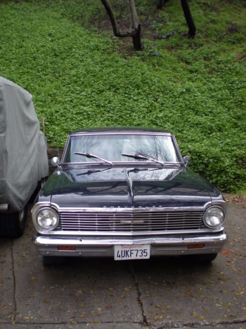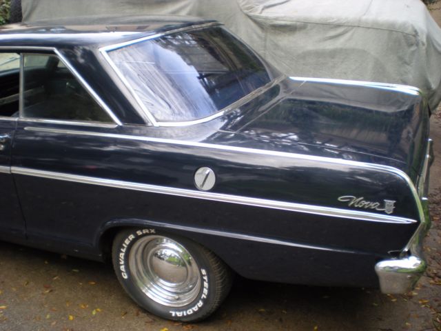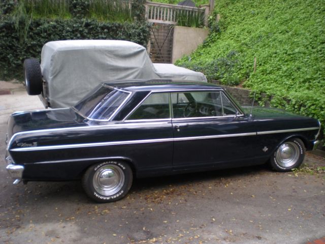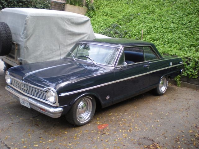 1965 Chevy II Nova (FOR SALE) 2 Door Coupe. Midnight Blue. Well-cared-for car has been in CA for last 20 years.Restored, maintained, and well-kept, this Nova is ready to be taken to the next level. Or, use it as is.Comes with original chrome trim package which was a relatively rare option even back in 1965 -- it's very rare to have all the original trim these days. Here's some of the car's numerous features.350 V8 Chevy Engine upgrade installed in the 1980's 4 Barrel Holley Carburator4-Speed Automatic Transmission (Rebuilt and in great shape)Automatic Transmission Cooling (attached to radiator)Alternator Replaced with Self Regulating AlternatorRecovered SeatsNewer Oil PanNewer Iron Cast OEM GM ManifoldReplaced Dash Board and Rear TrayReplaced CarpetReplaced Emergency Brake HandleB&M Floor Shifter (Racing Style)Grant Steering WheelVintage style seat beltsBaby Moon Chrome RimsExterior Paint in Good Condition (Midnight Blue)Chrome Exterior Trim in Excellent Condition (Flags, 283 Emblems, Nova Scripts, Mirrors)Chrome Gas CapNOS Chevy II Radio (works!!)NOS Wiper Blades (Anco Turtleback)All light bulbs and switches workOriginal Tinted WindowsLights (Work)Horn (Works)Heater (Works)Fan (Works)Clock (Works)Vents (Work)Wipers (Work)Signals (Work, but sometimes the switch sticks a little -- typical Chevy II signal switch)All other gauges function normally (odometer, gas, oil, electric)Original Chevy II JackNew Battery (purchased last week) Duralast -- cranks strong! (2) GM key blanks (not shown) one for ignition and one for glove box.------------------------ISSUES:1. The cigarette lighter was working at one point but is not working presently. 2. Overall there is very little rust to the exterior, however, the one noticable spot is on the quarter panel (see picture)).3. Tires are on their last legs -- should be replaced soon.-------------------------Comes with some old parts that were removed (interior trim pieces, clutch linkage, old dashboard and tray).The car is in California on a non-operational registration. Title is clean. The undercarriage looks good (see pictures).Overall, a very tidy Chevy II Nova. Earlier this week I had AAA bring over some Premium gas and put air in the tires. After adding a new battery, the Engine started up smooth even after sitting for a while. No leaks.Overall, in fine condition for its age.Sold "AS IS".