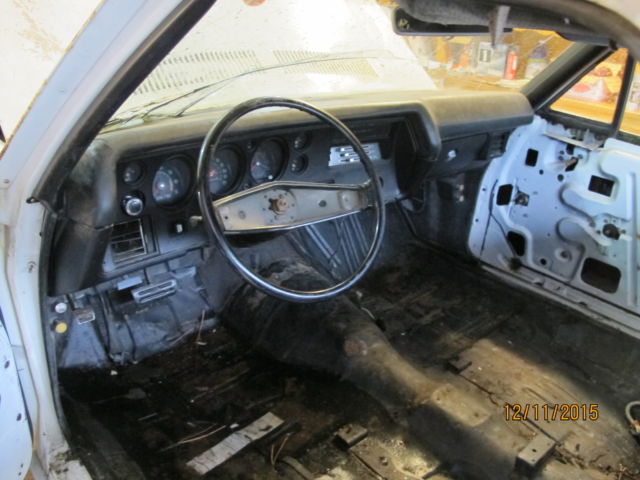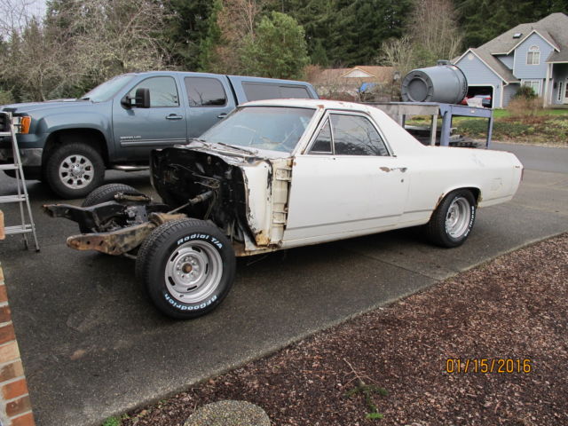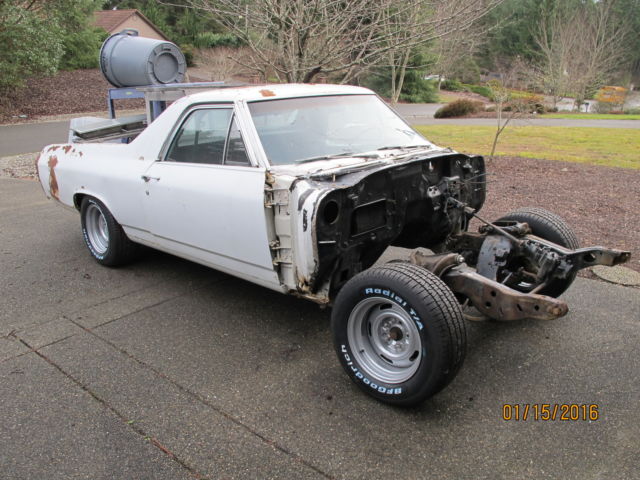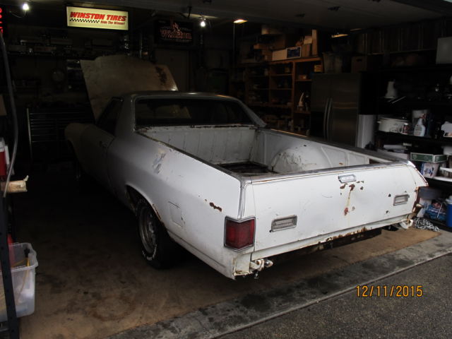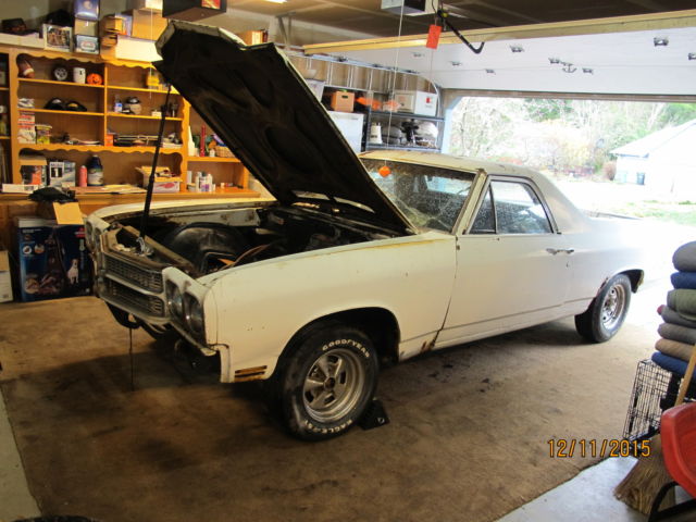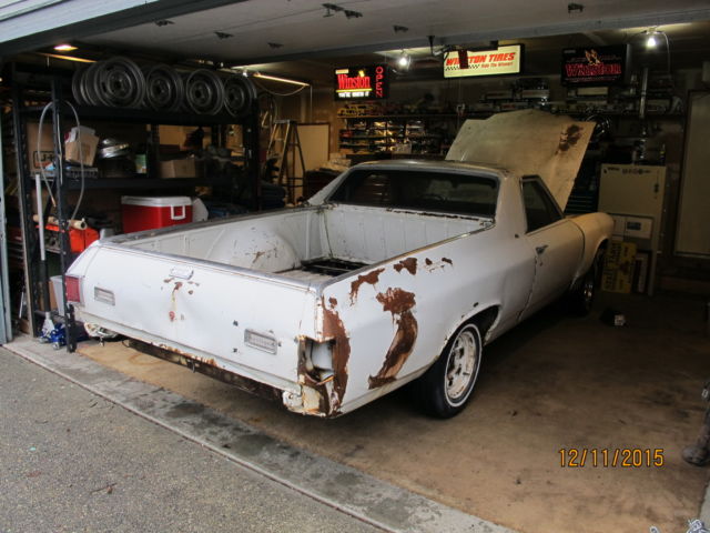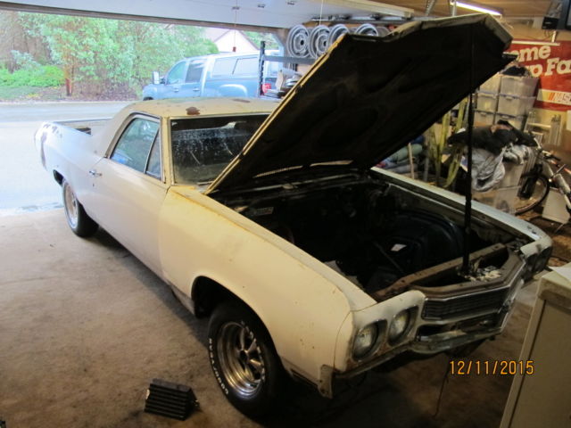 THE CORE SUPPORT AND STEEL INNER FENDER WELLS AND OTHER PARTS FOR THE FRONT END HAVE ALL BEEN POWDER COATED ALSO HAS POWDER COATED 15X8 RALLEYS WITH NEW 245/60/15 BFG TIRES I DO HAVE A NOS HOOD FOR THE CAR NO AIR CLEANER I DO NOT HAVE ANY BUMPERS FOR THE CAR OR THE CONSOLE BUCKETS AND AMFM STEREO THERE WAS ONLY 259 EL CAMINOS BUILT IN 1970 WITH THE L-78 396/375HP ENGINE VERY LOW PRODUCTION VERY RARE CAR THIS CAR IS REGISTERED IN THE L-78 REGISTRYTHIS CAR WAS SPECIAL ORDERED ENGINE IS NOT ORIGINAL TO THE CAR IT IS A 496 STROKER 4 BOLT BLOCK EVERY BOLT IN THIS MOTOR IS ARP MAINS HAVE ARP STUDS AND SO DO THE HEADS SCAT CRANK SCAT H BEAM RODS SRP PISTONS CANTON OIL PAN AND PICKUP NOS ALUMINUM HEADS 3946074 MANLEY VALVES COMPLETE COMP VALVETRAIN 652 LIFT SOLID ROLLER CAM NOS 163 INTAKE 850 HOLLEY ORIGINAL DEEP GROVE PULLEYS MOTOR HAS BEEN PRO BUILT AND DYNOED JUST DROP IN AND GO I HAVE $15,000 INTO THIS MOTOR ALSO HAVE REBUILT TURBO 400 TRANY WITH 3500 STALL AND LOTS OF OTHER GOODIES I DO KNOW WHERE THE ORIGIINAL ENGINE IS I WILL ONLY GIVE THAT INFO TO THE PERSON WHO BUYS THE CARANY QUESTIONS PLEASE CALL 530-304-8728I MAY REMOVE THIS CAR AT ANYTIME AS IT IS FORSALE LOCALLYI HAVE A SHIPPING COMPANY THAT WILL SHIP THIS CAR CALL FOR A QUOTE 212-729-0192 I CAN ALSO DELIVER IT MY SELFOPTIONS ON CARAS1-STANDARD FRONT HORN A51-STRADO BUCKET SEATS B37-COLORED FLOOR MATS B79-SS 395 EMBLESB80-ROOF DRIP MOLDINGS B90-DOOR WINDOW MOLDINGS B93-DOOR EDGE GAURDS B96-WHEEL WELL MOLDINGSC08-VINYL TOP BLACK C56-I P SIDE VENT D33-REMOTE MIRROR D34-VISOR MIRROR D55-CENTER CONSOLE D88-HOOD STRIPES G96-3.55 REAREND J50-POWER BRAKESJL2-FRONT DISC BRAKES L78-375HP TURBO JET 396 ENG M40-TURBO 400 TRANY N33-TILT WHEEL NK1-CUSHIONED GRIP 3 SPOKE WHEEL T60-HEAVY DUTY BATTERY U29-GLOVE BOX LAMP U35-ELECTRIC CLOCK U69-AM-FM STEREO U76-W/S ANTENNA V31-FRONT BUMPER GAURDSZL2-COWL INDUCTION ZL3-SS 396 CONVERSION
