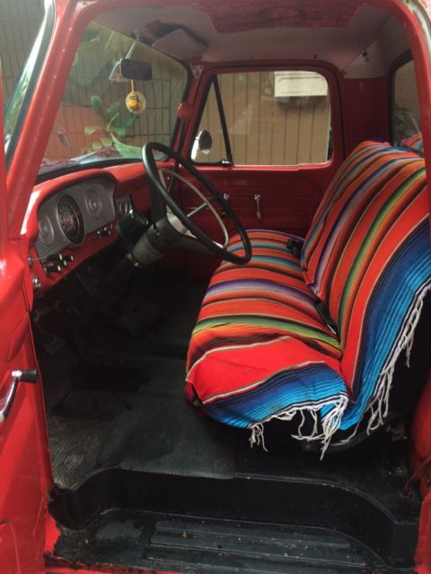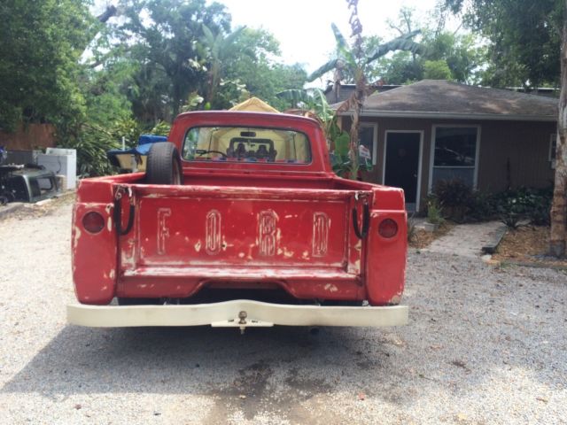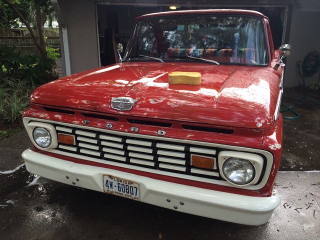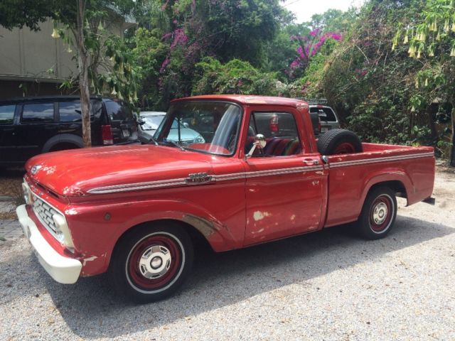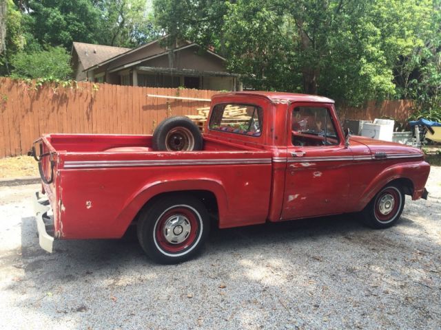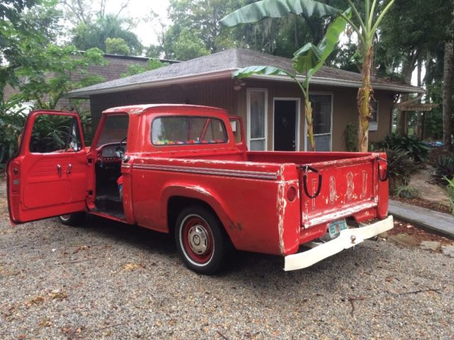 Runs good, stops good, starts right away, drives good. Some slop in the steering, but that's pretty standard for an old non power steering box. It's a short bed, style side. Incredibly rare truck, not many short bed trucks were made back then, especially from 61-63 when Ford introduced the "unibody". Not easy to find another like it. The previous owner swapped in a 4 speed with and a custom shifter on the floor to replace the three on the tree, It cruises at 60-65 on the highway at about 2200 RPM's. He also did a top end rebuild. Gets better gas mileage than my Jeep Wrangler. Full size spare mounted in bed. New front wheel bearings Turn key, it's a great daily driver. Lowered just a little bit, to give it a nice stance.Original 223 inline 6 engine runs like a top. New exhaust, a straight pipe with a small glasspack that sounds awesome. Awesome little truck. Nothing to hide, what you see is what you get. This is the decoded warranty plate info: F10 = 2 wheel drive truck. J = 223-1V I-6 engine. D = built at Dallas, TX assembly plant. 430872 = built in July, 1963 as a '63 model truck. 114 = your wheelbase in inches. J = Rangoon Red exterior color. F100 = 5000 pound GVW half ton truck. 81A = Standard Cab. Trans A was a 3 speed manual, light duty. Obviously you don't have that one any more. Axle 11 = 3.70 gears in a Ford 9 inch non-limited slip differential. 5000 pounds is your Maximum Gross Vehicle Weight rating. 114 is your NET horsepower rating, achieved at 3600 rpms. 62 = Houston, the district sales office from which your truck was ordered. It is not a special order vehicle.If you have any questions or want any specific photos feel free to call or text me at 321.427.4421
