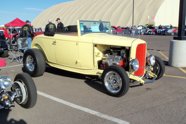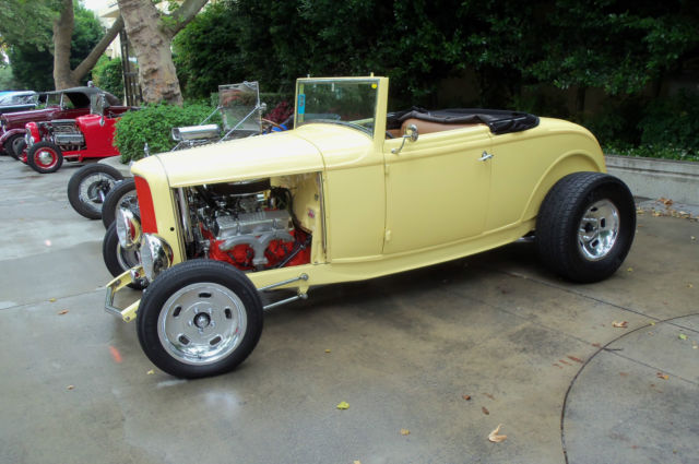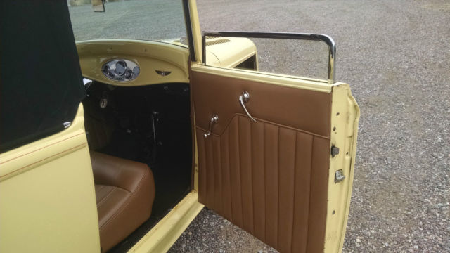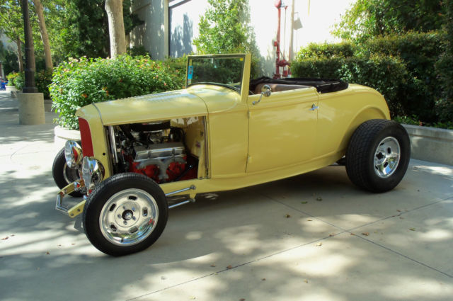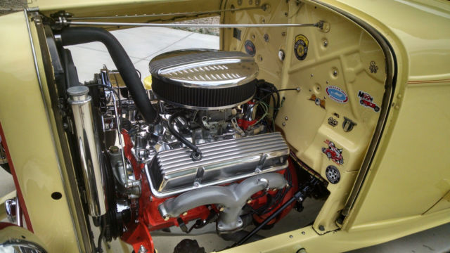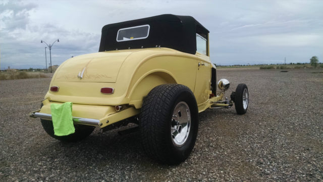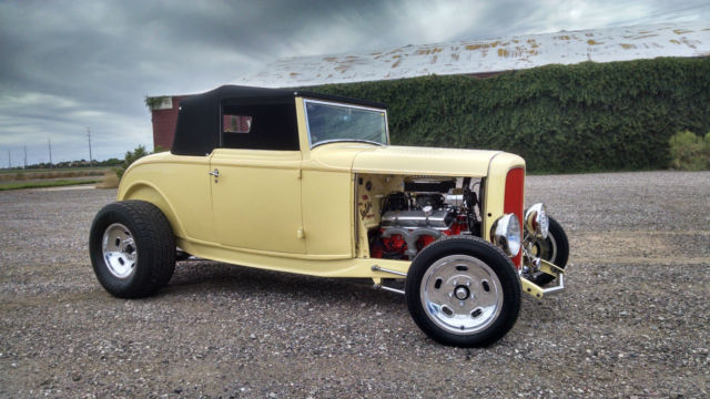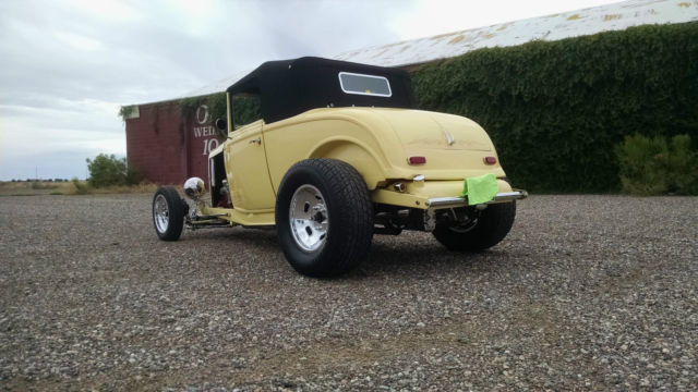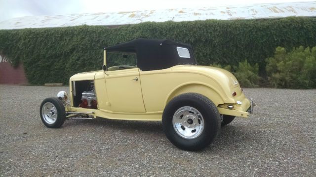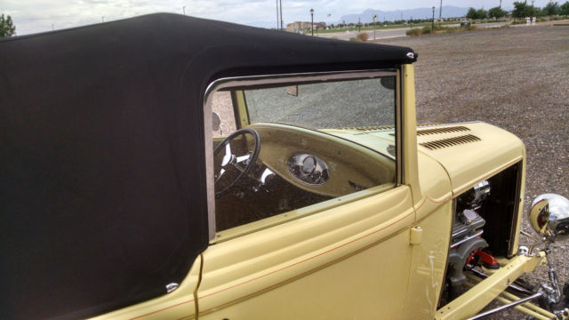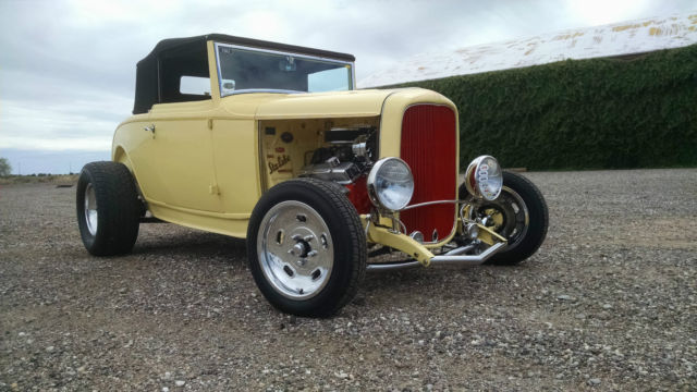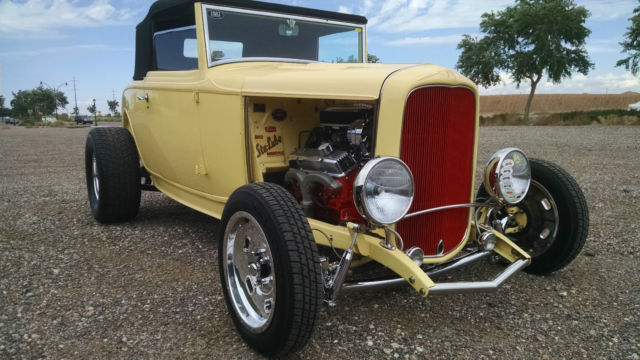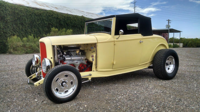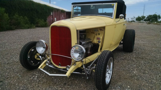 Here is a RARE "Henry Steel" 1932 Ford Cabriolet. (Folding top & roll up windows) This car has been built in this configuration since 1982. Many things have been updated since then. I have owned this car 20 years & have driven it 40+ thousand miles over that time. This car has been in Arizona since the 1950's. It does have an Original Henry 32 frame, 1932 Ford AZ Title. The paint was done 81-82, it still has a great shine! there are some chips. Look at the pictures, ask your questions, I may consider partial trade on a 1950-1957 Ford or Chevy truckSome of the details are:Steel Body, Original frame, Acrylic Enamel, 1980 Grand Prix yellow bird yellowRootlieb Hood, w/ Louvers, also has solid hood sides, Original Steel grille shell & insert, Stainless 20 gal tank in trunkStainless 32 Headlights, on stainless bar, Motor:350 Chevrolet, rebuild 1979 block, AFB Carter 600 cfm, Polished Aluminum intakePolished Aluminum Moon Valve Covers & Air Cleaner w/ K&N FilterChrome Alternator, Electric Fan, Stainless overflow bottleWalker Radiator, Stewart Components Hi Flow water pump, powder coatedOriginal Ram horn manifolds, ground smooth, & Jet Hot coated.1939 Ford 3-speed Transmission, Ram Diaphragm ClutchRear:Original Halibrand Quick Change, "Culver City Cal", "201" Aluminum center section w/ Polished Aluminum cover1946-1948 Axle housings (Chrome), w/ Drum brakes, chrome backing plates, Chrome So-Cal shocksPosies model A spring w/ Teflon buttonsFront:Chrome Super Bell Axle, Posies spring, Chrome 4 Bar, Stainless Batwings, Chrome So-Cal shocksMustang Super Bell disk brakes, Vega steering boxWheels:Rodders Real Wheels, Kidney Beans ( Like Halibrands) Polished Aluminum 15 x 4 1/2" w/ Firestone tires radials, 16 x 9" w/ Hoosier 31x12.50 radials Interior:Roll up windows w/ Chrome frames on the glass Glide Engineering seat,Black cloth Top (Mercedes cloth),Glass back window w/ Gypsy back panelVDO gauges (ALL work), Moon TachOriginal Bell 3 spoke wheel,Pioneer Radio w/ CD player (hidden under dash) (4) hidden speakers, A $1000 non- refundable deposit is required within 24 hours of auction end and full payment within 7 days. I will NOT ship, but I will assist your shipper loading. I will accept pay pal for deposit but prefer balance bank wire transfer for balance, no checks. Being sold as is, and I reserve the right to end auction early as it is for sale locally. (unless reserve is met)
