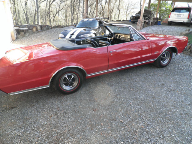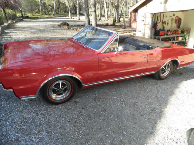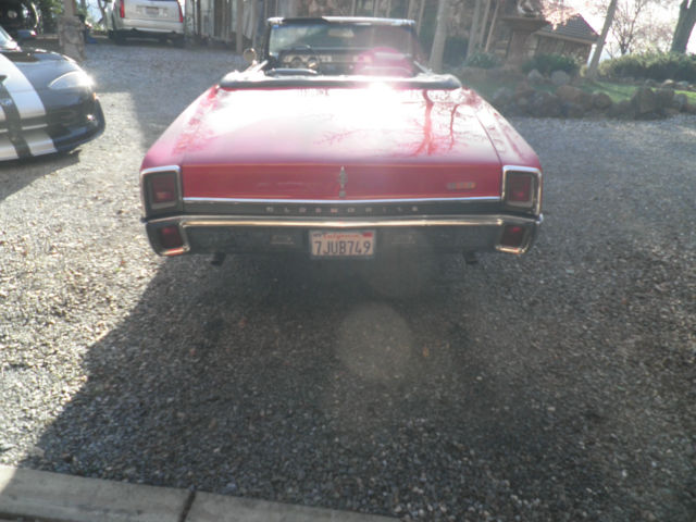 BEAUTIFUL 1967 OLSMOBILE 442 CONVERTIBLE IN PRISTINE CONDITION. I AM A COLLECTOR AND SELLING PART OF MY COLLECTION AS I AM NOW IN MY SEVENTIES AND NEED TO SCALE DOWN THE WORK ASSOCIATED WITH KEEPING MANY VEHICLES. THIS VEHICLE IS FACTORY STOCK INCLUDING THE ORIGINAL ROLLED STEEL EXHAUST TIPS WHICH ARE IN GREAT SHAPE. .POWER STEERING AND POWER BRAKES. THE NEW REDLINE TIRES ALONG WITH THE SUPERSTOCK WHEELS GIVE THIS VEHICLE THE LOOK OF YESTERDAY GONE BYE. THE SPANISH RED PAINT (ORIGINAL COLOR) IS EXCELLENT AND READY FOR SHOW. YOU CAN DRIVE THIS CAR OFF THE TRANSPORTER AND ENTER ANY CAR SHOW AND DO WELL. THERE ARE NO ISSUES TO ADDRESS. THE INTERIOR IS AS NEW WITH NO FLAWS. THE BLACK CONVERTIBLE TOP IS EXCELLENT AS IS THE BACK WINDOW. ALL CHROME IS ALSO IN EXCELLENT SHAPE. THE VEHICLE HAS BEEN RESTORED ENTIRELY. THE DRIVE TRAIN IS ORIGINAL AND CORRECT. EVERYTHING OPERATES AS IT SHOULD SO NO WORK TO DO. THE ORIGINAL A/M RADIO IS INTACT WITH AN AFTER MARKET AM/FM CASSSETTE UNDER THE DASH SO NO ALTERATIONS WERE DONE. JUMP IN AND START THE MOTOR AND GO BACK 50 YEARS TO THE MUSCLE CAR ERA. THIS VEHICLE IS AN ACTUAL 442 AND NOT A CLONE. CERTIFICATION PLATE ATTACHED TO FIREWALL AS DOCUMENTATION PLEASE FEEL FREE TO CALL ME AT 530-622-1361(CALIFORNIA TIME)IF YOU HAVE CONCERNS OR QUESTIONS. DUE TO THE AGE OF THE VEHICLE IT IS SOLD ''AS IS'' WITH NO WARRANTY OF ANY KIND