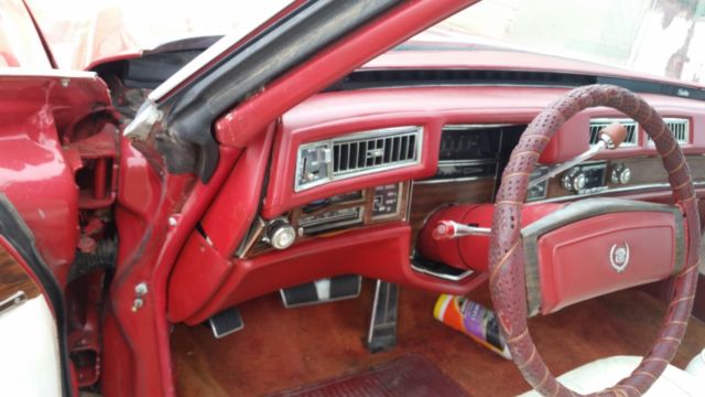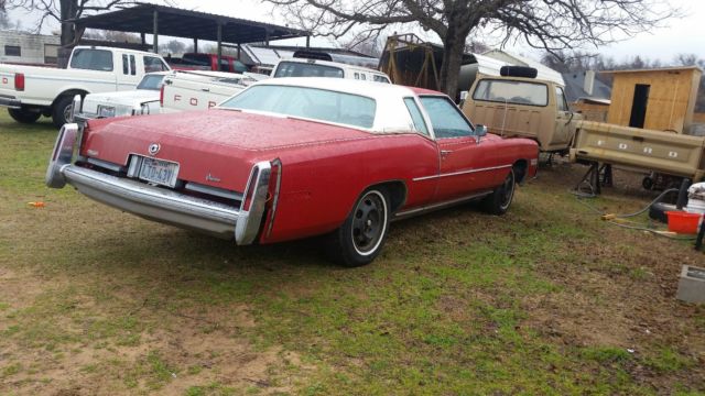1977 2 door Cadillac Eldorado. Original red paint, new tires. one scratch on the passenger side door that is probably from a shopping cart and some spots where the paint has bubbled around the vinyl top and is rusting in those spots as well as 1 or two small spots around the doors. The hood is missing the emblem as is the trunk as well as one of the hood springs isn't attached but is there. The interior needs front seats recovered as well as the arm rests in the rear seat. headliner is in good condition. Dash is in excellent shape and the power seats work as do the power windows. The ac needs charged. Has climate control heat and air. the carpet is faded through out the car. No cracked or broken glass. Needs plastic covers for the headlights and taillights but all the lights in and out work. The hubcaps for the car are in the trunk. needs CV axles and could use a brake job. trunk is in good shape but needs the carpet attached. Runs and drives good. Does not shimmy when it drives. This would be a great car to bring back to its original glory. Not tagged or registered at this time but was garage kept by older owner. we reserve the right to cancel bids as the car is also for sale locally. reasonable reserve on auction.