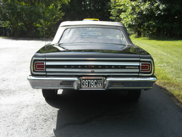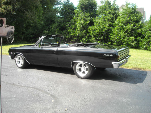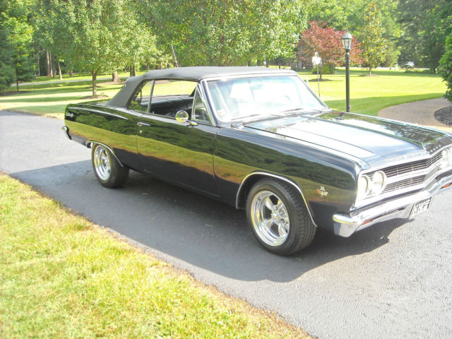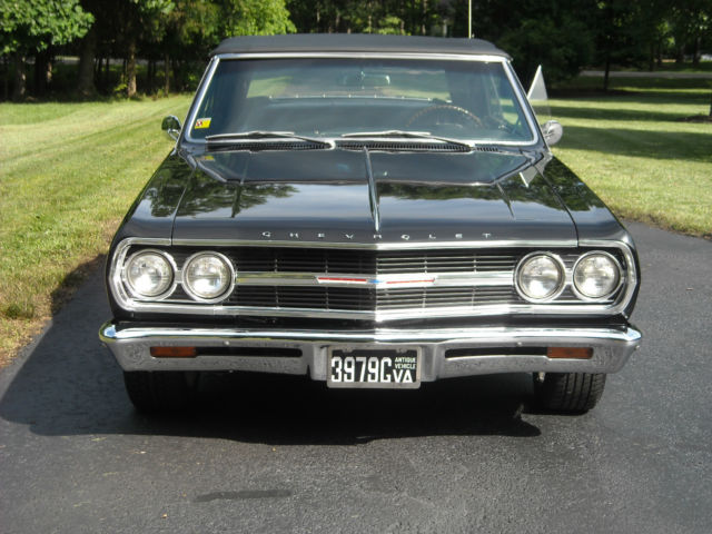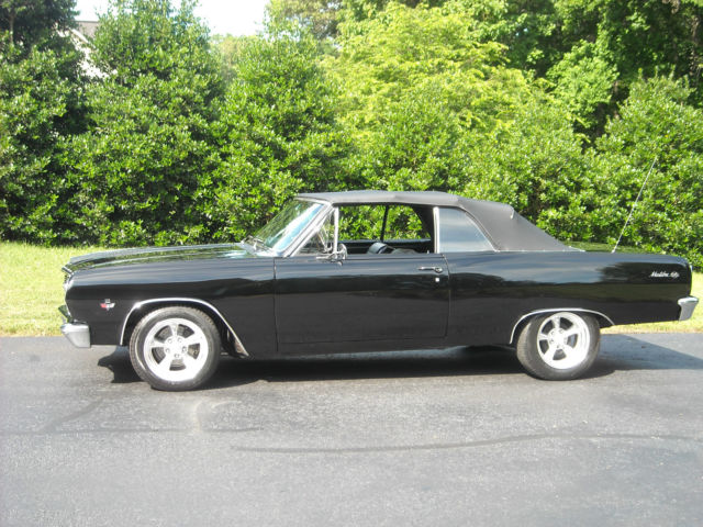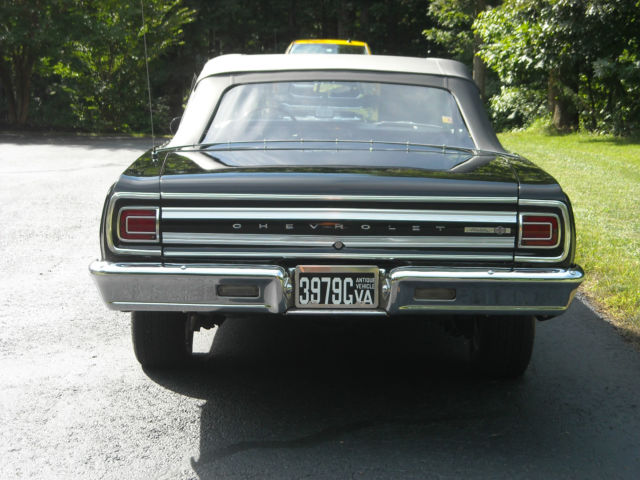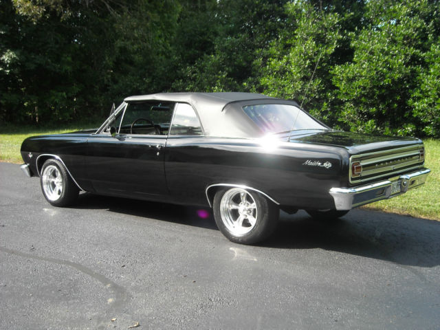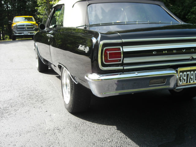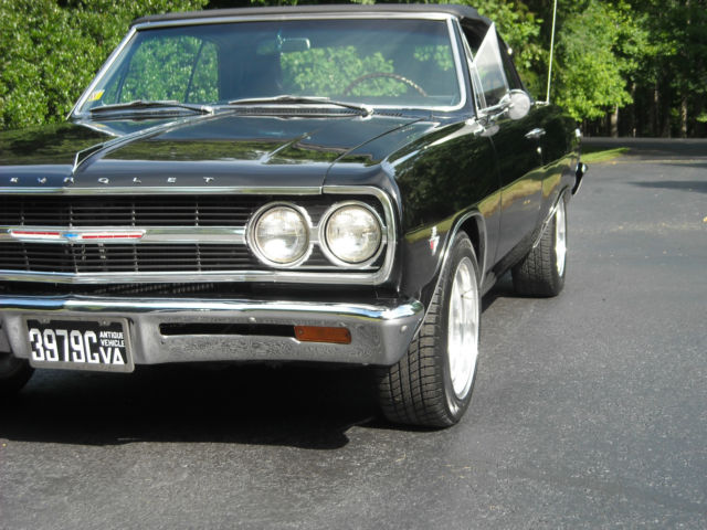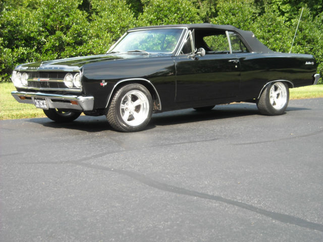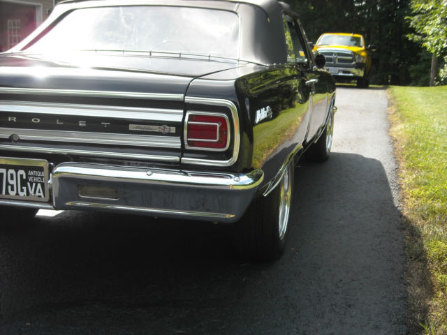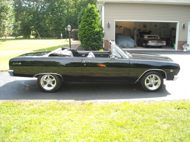 This is a true 1965 Chevelle Malibu SS convertible with the first three digits of the vin 138. The color has been changed to a triple black muscle machine. The original motor is long gone but has been replaced with a 383 strocker. It boasts approximately 500 hp. The headers are long tube with jet hot coating. It has 2 1/2 inch exhaust with flow master mufflers. The heads are aluminum and allow the engine to breathe . An electric fan keeps it cool and running 180 degrees, The 4 speed transmission and hurst shifter coupled with the power output slams you back in the seat. The rear is a 12 bolt chevy with positraction. To stop the car it has been converted to power disc brakes in front and drum rears. The front rotors are slotted and drilled and the calibers are black. The power steering helps you in tight situation without much effort. All the gauges work including the factory tach. The new power convertible top works great and it has a boot to cover it up when the top is down. Everything on the car has been restored or replaced including all suspension pieces, fuel tank and lines, brake lines, interior, chrome, ect. The car has approximately 1250 miles on it since the restoration. The body is very straight and the gaps are even which show off the great paint job. There are no scratches or chips in the paint. The car has won many awards at shows. There is no warranty expressed or implied. I have tried to describe the car but probably have missed a few items. If you are interested in the car please come look at it yourself or send a representative. The car is located in Richmond VA. If you have any questions please give me a call. I am not the best at email and I don't text. Thanks for your interest John (804) 627-1193.