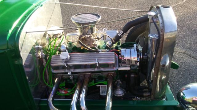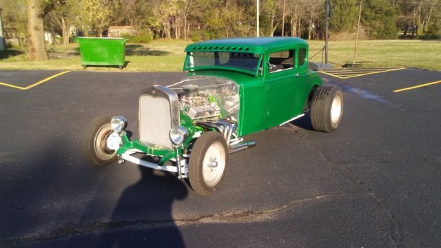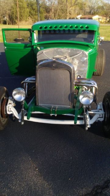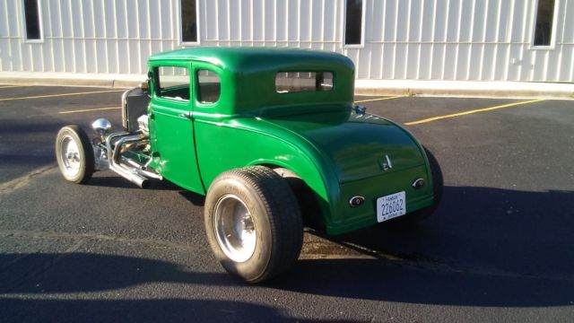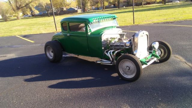 This is a 1931 Ford Model A Coupe. It has a 4 inch chop, with a 3 inch channel. There is a 5 inch dropped Oakie Joe Axil, 40 Ford wishbones, speedway disc brake kit, and chrome shocks. It has a Corvair steering box, with a chrome steering column. There is a 8 inch Ford rear end, with chrome Carrera QA1coil overs, and lateral bars. This cars has a 305 small block Chevy motor, with a Edelbrock carburetor, HEI distributor, polished valve covers, and breathers. There is Lokar oil and tranny dipsticks. The transmission is a Power Glide. It has a polished aluminum firewall, Aluminum fuel cell, tinted windows, black interior. The car is jade green with a green metal flake steering wheel, with stock gauge panel with after market Equus gages. This is a low car chrome shifter. There are new door latches, regulators, felt, and rubbers. It has a new wood kit, 1939 ford tail lights, and chrome roadster headers with baffles. There is a spoon gas pedal, speedway brake pedal assembly, speedway removal tranny cross member. It has a custom tube chassis, with centerline wheels. Front tires are new Firestone tires 135-15. Back tires are Grand Am Radial 275-60. There is an 8 in rear end with 300 gear. Aluminum radiator. The drivers door glass is cracked. This car has a clear Kansas title. This is a nice fun car to drive. It drives easy. This is not a perfect car, this is a nice driver. The tranny shifts soft. Any questions call me (620)-660-0170. This car is also for sale locally. When sale is final there needs to be $1,000 sent to my Paypal within 24 hours.