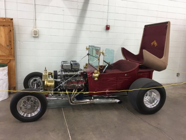 1923 T-Bucket Roadster Red with yellow ghost flames Removable molded hard top with etched glass back window with oak frame Etched glass wing windows with brass fittings Interior is red tucked and is like new The lights, radiator and steering wheel are brass New Mickey Thompson tires and tubs with aluminum center line rear wheels ...