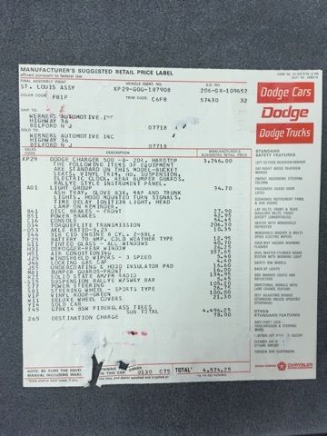 1970 Dodge Charger 500 318 V8 / Automatic / Air conditioning / Console / Power steering and disc brakes. Documentation & Broadcast sheet, Window sticker, Warranty booklet. Triple Green car which includes an F8 Ivy green exterior / Vinyl top and bucket seat interior. This is a true survivor with all original paint - no blends or touch ups anywhere! No rust except minor surface in trunk floor. The vinyl top is original as swell and in excellent condition. The previous owner disassembled the interior and had plans to do something else with the car that thankfully never happened. The parts have been properly stored and boxed - also there are extra parts included as well. The seats are original but will need front inserts or covers. The original drivetrain is in great running condition and has not been out of the car. This would be a great survivor with some effort to put back together or would be a great base for another type of build? Whatever the case it is a rare opportunity to purchase a 1970 Charger that does not need any body work and is a true survivor. Call (502) 639-7593 with any questions.