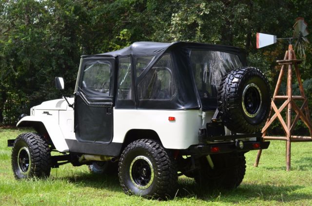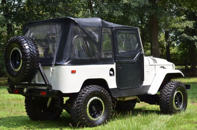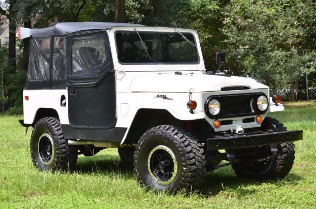 1966 TOYOTA FJ40 LAND CRUISER 4X4 ( RESTOMOD ) THERE IS A LITTLE OVER 6K MILES ON THE CLOCK SINCE ALL WORK HAS BEEN DONE ON EVERYTHING STEEL BODY - ZERO RUST , ZERO ISSUES AND ZERO PAINT BUBBLES , RUNS GREAT ON THE HIGHWAY AT 85 MPH SMOOTH AS A BELL NO DEATH WOBBLE OR SHAKE COMPLETE FRAME OFF RESTORATION 5 YEARS AGO SUB FRAME WAS SAND BLASTED AND PAINTED FLAT BLACK THEN HOLE UNDERCARRIAGE SPRAYED WITH LINE X SO IT WILL NEVER RUST.. COMPLETE INTERIOR FLOOR ALSO SPRAYED WITH LINE X FOR A NICE FINISH AND ALSO NEVER WILL ROT OR RUST PAINT IS A DURA SHINE MIXED WITH A SMOOTH TEXTURE BODY SPRAY SO IT WONT GET SCRATCHES IF TAKEN OFF ROAD ( PAINT IS PEARL WHITE ) ALL GAUGES AND HORN , BLINKERS , LIGHTS AND EMERGENCY BRAKE WORK AS THEY SHOULD AND ARE ACCURATE HAS WORKING HEATER BUT NO AC 5 NEW MASTER-CRAFT 33' MXT TIRES 5 NEW 15' VISION OFF ROAD RIMS WITH BEED LOCK 3' SUSPENSION LEAF SPRING LIFT WITH ADDED SWAY BAR FOR A SMOOTH RIDE DIDN'T WANNA GO WITH A BIG LIFT AND TAKE THE INTEGRITY OUT OF RIDE AND WANTED IT TO DRIVE GOOD . 4 NEW PRO COMP SHOCKS V8 350 MOTOR & 5 SPEED MANUAL TRANSMISSION 4X4 &373 FRONT AND REAR GEARS WITH FRONT LOCKERS NEW HOLY 650 CARBURETOR , MSD DISTRIBUTOR AND ELECTRIC FUEL PUMP NEW BRAKE BOOSTER NEW PAINLESS WIRING NEW 4 CORE CHAMPION ALUMINUM RADIATOR NEW BATTERY NEW WINDSHIELD AND GASKET NEW EXHAUST PIPING AND FLOW MASTERS TRUE DUAL EXHAUST NEW WINDSHIELD MOTORS AND WIPERS NEW BESTOP SOFT TOP AND DOORS OF COURSE ALL REMOVABLE IF YOU WANT TO GO NAKED HAS VERY COMFORTABLE SEATS WHICH SLIDE BACK AND FORTH IM 6FT AND THERE IS PLENTY OF LEG ROOM ALSO HAS REAR SEAT WITH SEAT BELTS ... ******* I WILL CONSIDER EVEN TRADE OR TRADES AND CASH , TRADE VALUE MUST BE WORTH $ 30K ******* NOTE THERE IS OVER 40K INVESTED ! WILL CONSIDER A NICE HOT ROD CAR OR TRUCK , C10 , HARLEY BAGGER , SPORTS CAR OR HUNTING ITEMS MAYBE A NICE BAY BOAT OR ? THIS IS THE KING KONG OF THE JEEP FAMILY AND A VERY SOUGHT AFTER ANTIQUE RIDE THAT ONLY GOES UP AND NEVER DEPRECIATE VALUE... SELL FOR $28,500 CASH CELL ( 8 3 2 - 6 0 6 - 0 0 0 1