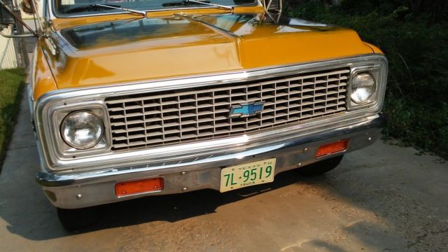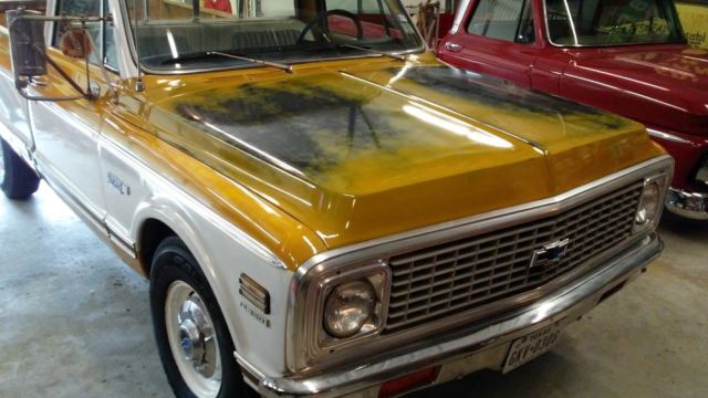 1972 Chevrolet Super Cheyenne C20 Trucks like this don't come up very often. Original one owner, never painted, never abused, taken care of Super Cheyenne.  The most deluxe model you can find is a Super Cheyenne and these are getting hard to find since most were work truck, low option models.  1972 Super Cheyenne C20 all original.  Original 350 motor with GM metal tag still on it, see pic.  Still has original GM Chalk marks on firewall and frame as pictured.   Original Th350 trans that was rebuilt 9000 miles ago.  The truck has been well taken care of as you can see.  It has been driven regularly.  Its had trans rebuilt 9000 miles ago, regular maintenance done over the years; radiator flush, belts, hoses, etc etc.  The truck is tagged and stickered.  I have put a new fuel pump on it, fuel filter, spark plugs, new carpet, new original seat cover.  The floors on the truck are very clean as you can see in pic, this is how they looked when carpet was removed.  This truck is very solid.  No rust in rockers, doors, cab corners, or front fender pockets.  They have never been repaired.  I haven't seen any in this condition rust wise.  The cab supports are very clean and nice as shown in pics.  The insides of the doors and bottom of doors are nice too.  The only rust I can find is a little bit below the tool box door on the bed.  Most of the trucks like this one would have been completely gone, as in it was a bad GM design.  This truck has a lot of options which makes it a very desirable truck, being a Super Cheyenne.  Factory houndstooth seat cover, deluxe wood grain interior and exterior, A/C needs a new compressor, P/S, Power disc Brakes, Heavy duty front sway bar, Rear heavy Duty Leaf springs, Factory slider rear glass.  List goes on for options, check data sheet on pics.  The truck over all is very nice solid complete, original paint, unmolested truck that runs and drives.  Overall truck has some little dings and scratches over the original paint.  Very solid rust free cab, fenders etc.  Only rust that I can find is below the rare option tool box door which is minimal and can barely be seen since its on the body roll of the bed.  The truck is sold as is.  It's not restored or perfect.  Its 45 yrs old and is a very nice original truck.  Very hard to find Super Cheyenne's like this any more.  Great for a vintage hauler, driver, or if someone wants a nice original patina truck.  Please ask questions if needed.  I can send more pics.  I will need payment within 3 business days of end of auction.  I will work with buyer as far as I can for helping car hauler if needed.   Call 806-440-1312 if you need more info.