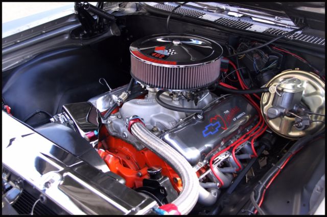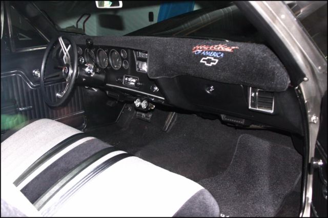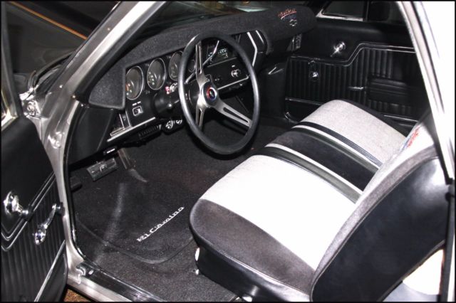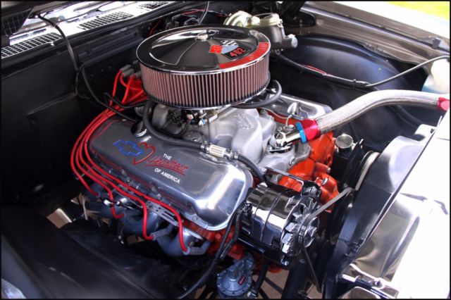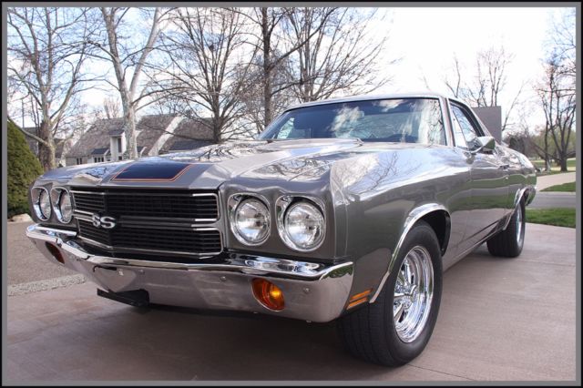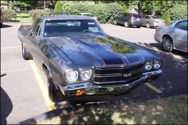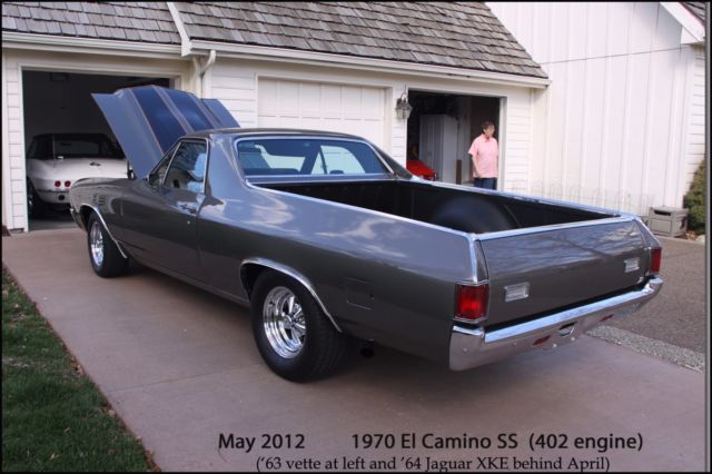 Laser straight body - Show Vehicle Family grocery getter, or Sunday driver Shadow grey with pinstriped hood. Mirror like finish. Rebuilt 402 TH400 with Shift Kit, no A/C or heater. SS black interior with Heart of America seat covers. All new suspension: ball joints, tie-rods/ends, drag link, steering gear box,Front/rear bushings (new original), rear springs  (lowered 2 "), 4 KBY Shocks.BF Goodrich TA radials with SS Cragars all around.Ceramic Hooker Headers w/ side cut-offs, Flow Master exhaust.Custom aluminium valve covers and Edelbrock 650 CFM Thunderjet Carb w/ Elec. Chokeand fuel pump. MSD H.E.I. ignition/spark plug wiring w/ looms-chassis Dyno Tuned.K & N 4" High Flow Air Filter - new carpet - new sill plates - head lights - tail light housings/lenses - back-up light lenses - mirrors - bumpers - windshield/rear windows - new bed done professionally by Rhino.After-market "look-a-like" AM/FM in-dash stereo with CD Changer mounted in rear with subwoofer and 400 watts of amp (presently having trouble tuning in).Complete painted frame & undercarriage - shaved firewall.This beautiful El Camino was a frame-off restoration done meticulously. The paint is stunning - looks wet and changes hues from bright silver to charcoal grey. Has never seen rain and always garaged. This was a Southern California car with no rust or body filler. Suspension is all new. Has BF Goodrich T/A radials wrapped around new CRAGER ss wheels. Transmission has been rebuilt. It has series 40 Flow Master exhaust coupled to ceramic coated Hooker Headers. This vehicle is fast and gets a lot of attention on the street and car shows. The seats have new foam and Heart of America seat covers (see photos).The dash is covered but has no cracks and is shinny. All ducting has been left in place in case new owner wants to install a new Vintage air system. This is a vehicle to be very proud of, and the 402 engine starts right up. This is the handiest collector vehicle I've had (because of the bed) and I have owned 6.