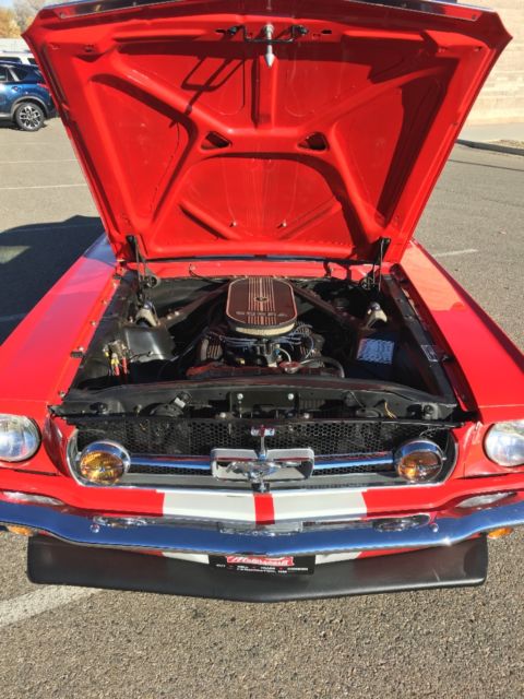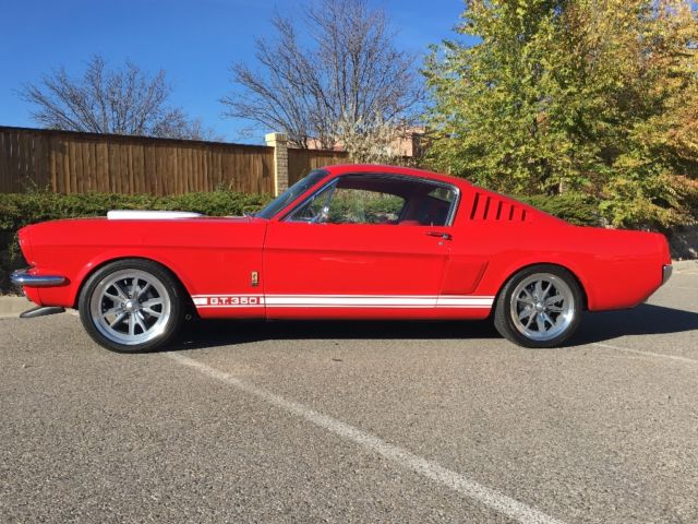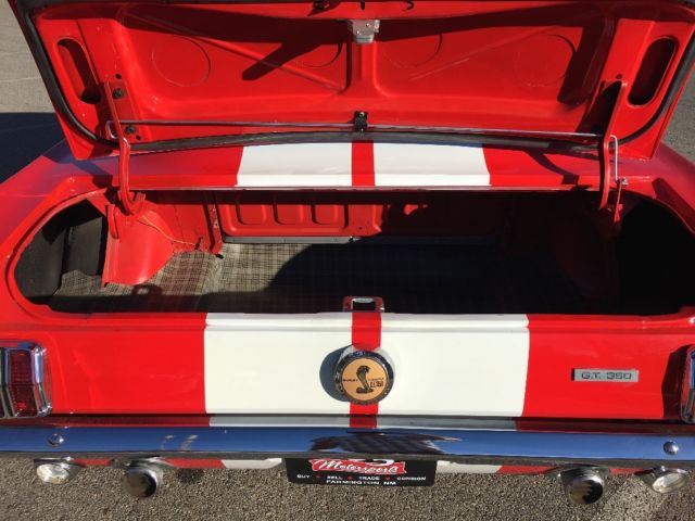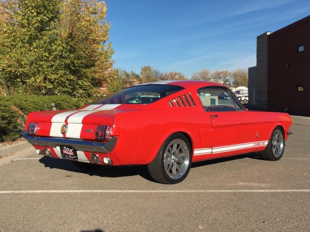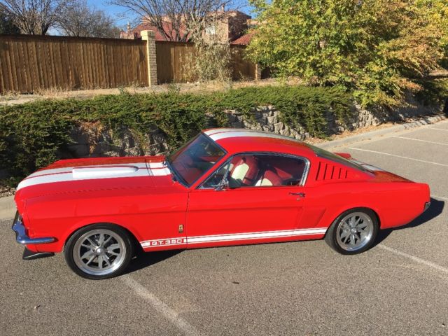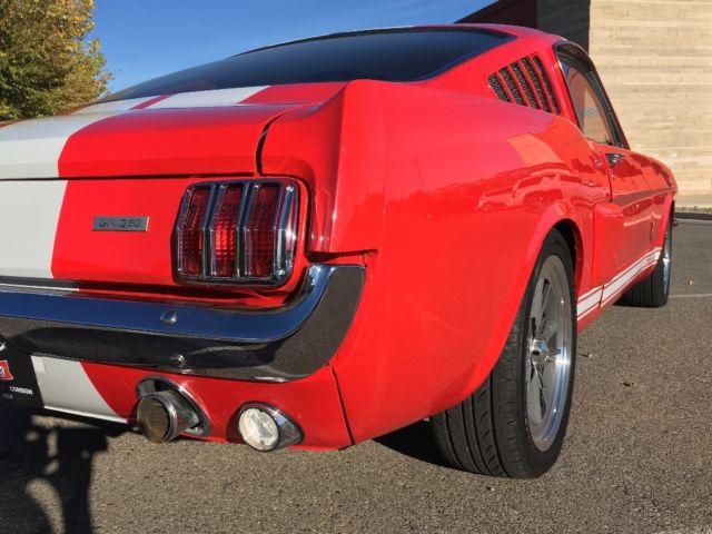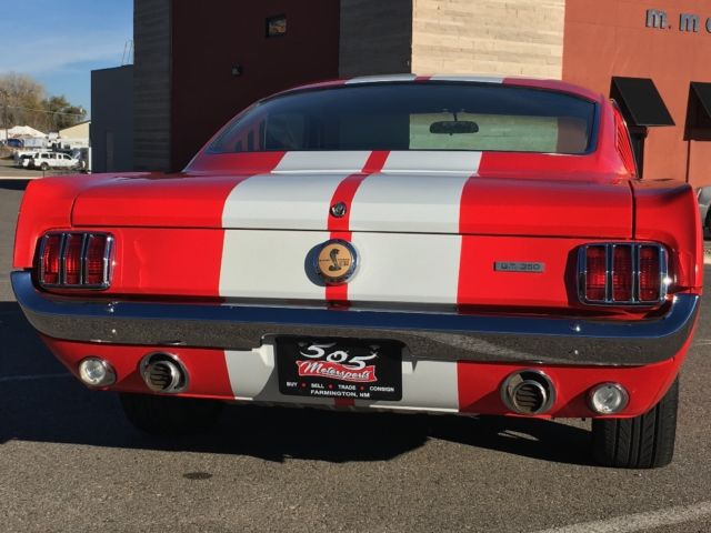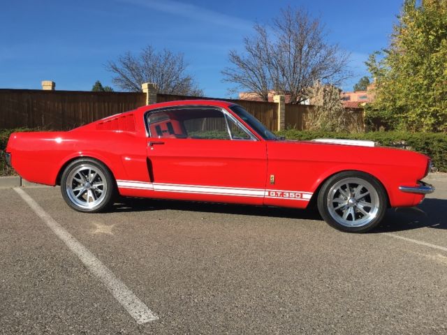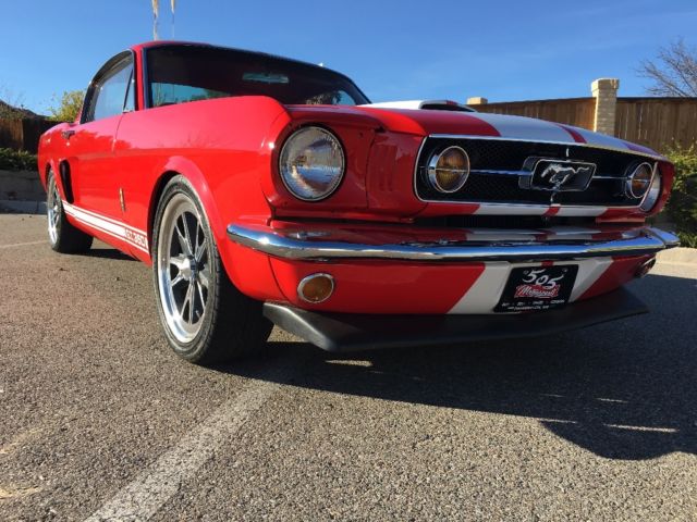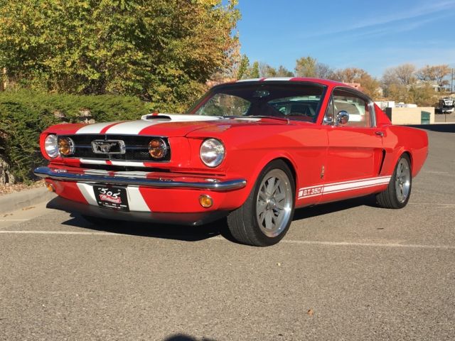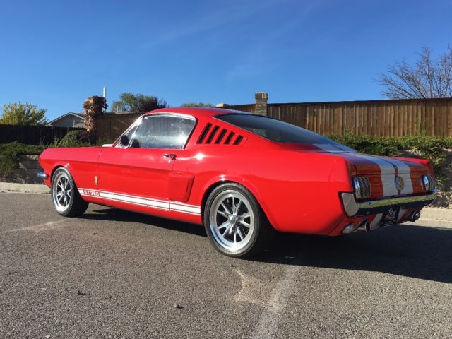 THE SHELBY FEATURES ITS ORIGINAL SHEET METAL AND HAS AN OUTSTANDING QUALITY FIT AND FINISH. THE PAINT IS VERY FRESH AND NEAR FLAWLESS. MIRROR LIKE SHINE AND LAZER STRAIGHT BODY WITH ZERO BONDO. ALL CHROME, TRIM, LIGHTS, BEZELS, AND BADGES ARE BRAND NEW. THE VENT WINDOWS LOOK TO BE ORIGINAL AND SHOW A SMALL AMOUNT OF WEAR BUT NOT DISTRACTING. THE CUSTOM INTERIOR IS ALL BRAND NEW AND LOOKS AMAZING. THE SHELBY STYLE CUSTOM WHEELS AND TIRES ARE BRAND NEW AND HANDLE GREAT WITH THE NEW SHOCKS, TIE RODS, AND BALL JOINTS. THE UNDERCARRIAGE IS VERY CLEAN WITH MOSTLY NEW REPLACEMENT PARTS. FORD 9" REAR DIFF HAS BEEN COMPLETELY REBUILT AND FRESHLY PAINTED AS WELL AS ALL NEW SUSPENSION COMPONENTS AND ALL NEW FUEL LINES, AND EMERGENCY BRAKE LINES. THE FLOORS ALL LOOK TO BE ORIGINAL AND HAVE TYPICAL UNDERCOATING TO PRESERVE THEM. AND FINALLY THE INSTALLED POWER STEERING IS A NICE BONUS TO EVERY DAY DRIVING. PLEASE LOOK AT MY 100% PERFECT FEEDBACK AND FEEL FREE TO CALL OR TEXT ME WITH MORE SPECIFIC QUESTIONS (505)402-1558. I AM VERY HONEST AND HAVE NO INTENTIONS OF MISLEADING ANYONE. THIS 65 FAST BACK IS A HIGH QUALITY BUILD THAT IS REFLECTIVE IN THE PICTURES. I AM VERY CONFIDENT THE NEW OWNER WILL FIND THE CAR EVEN BETTER THAN DESCRIBED AND BETTER THAN THE PICTURES. I CAN EMAIL OR TEXT MORE PICS UPON REQUEST. THANK YOU FOR CHECKING OUT OUR LISTING CLAY 505 MOTORSPORTS WWW 505MOTORSPORTS COM