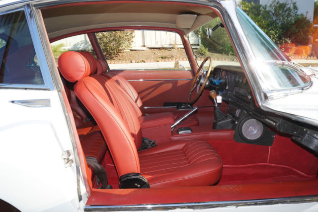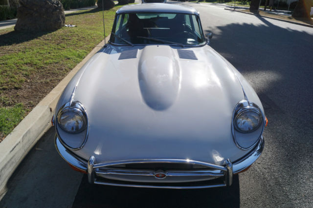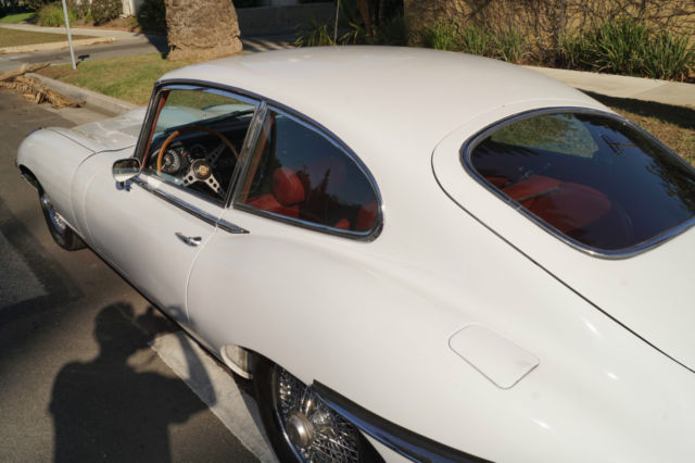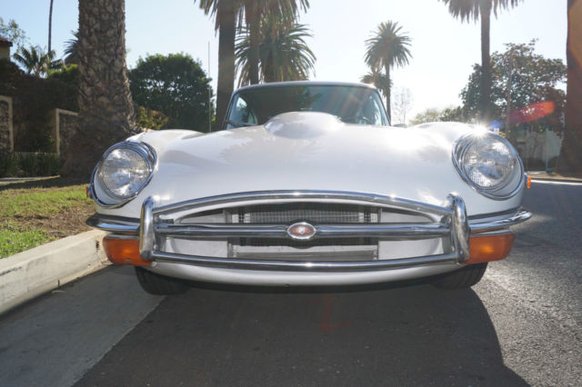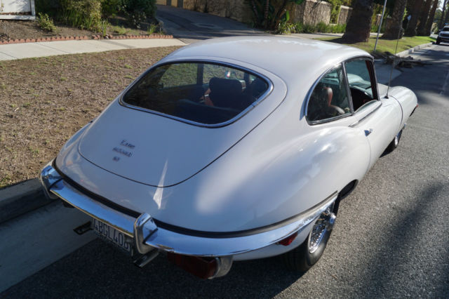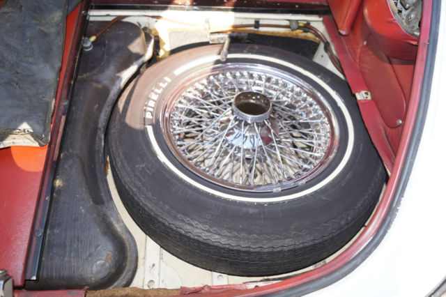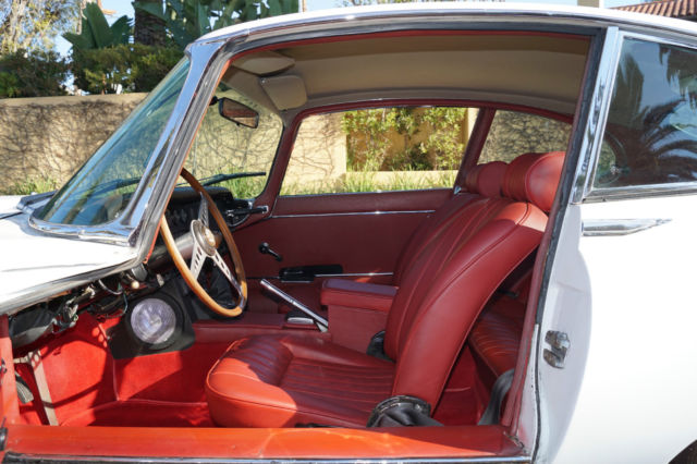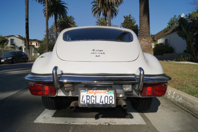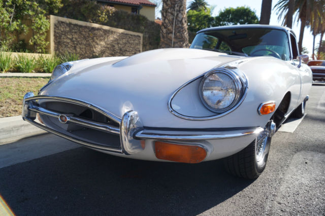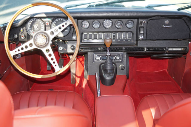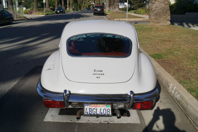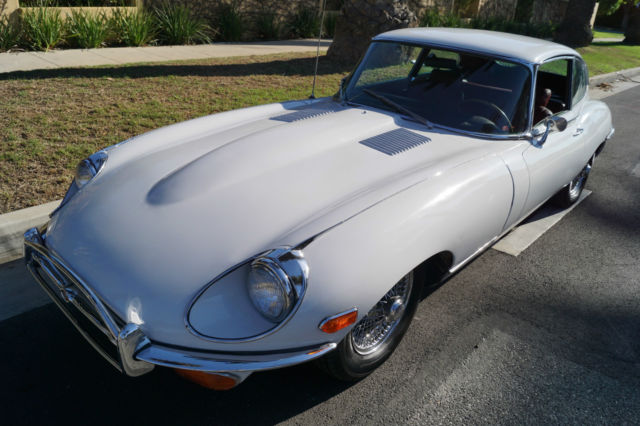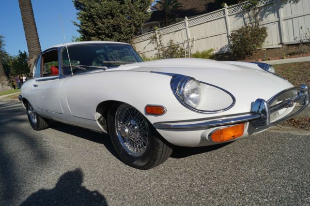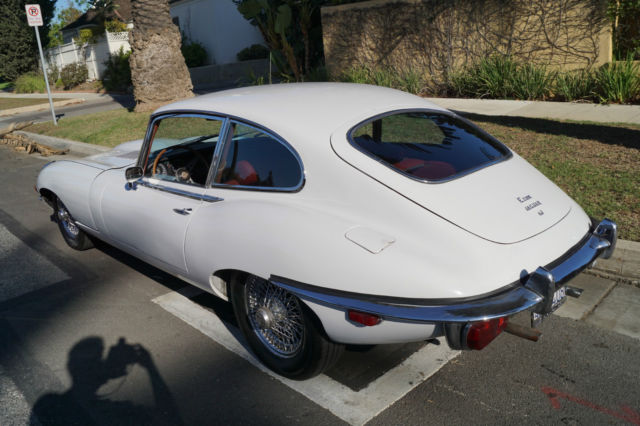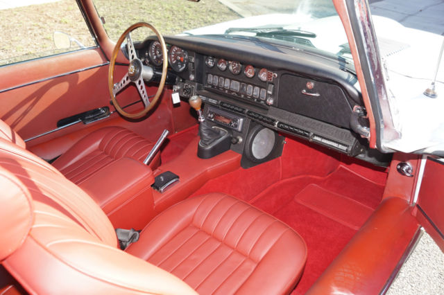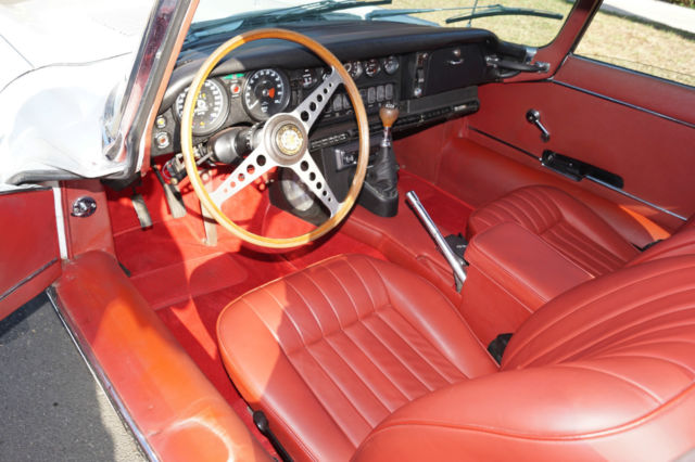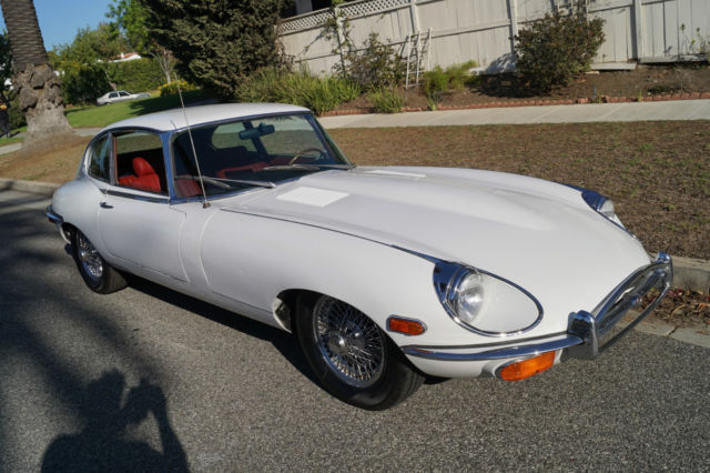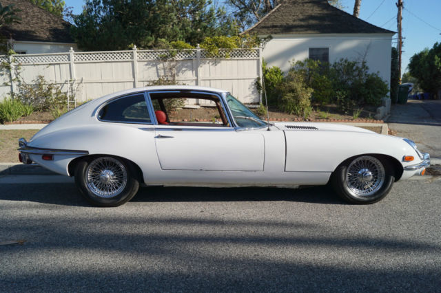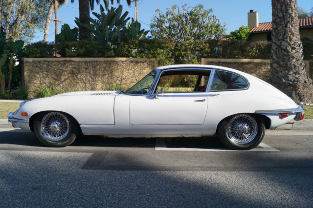 Please note that experience shows us that the photobucket of over 100 large pixel pictures posted here are in most cases best viewed and downloaded using the very latest and most updated version of the 'Firefox' browser as some other browsers and especially older browser versions are not capable of accommodating the size of the download. Over the years our clients have overwhelmingly been appreciative of our many unaltered large pixel photos posted in our ads and our feedback has been that it is very rare that a dealer will post all but the most flattering of professionally finished photographs. We prefer to post the many photos taken of the car, in sometimes unflattering but natural sunlight, in order for our prospective buyers to be able to see true and reliable images of the car advertised and that is the reason for some seemingly duplicated shots. We trust you will agree. West Coast Classics are proud to present a rare barn find (garage really!) of a totally rust free example of this 1969 Jaguar XKE E-Type Series II coupe with a desirable 4 speed manual transmission and its original 6 cylinder 4.2L/246HP matching #'s engine with only 60K original miles in its original 'Old English White' factory color and a beautifully kept 'Red' interior and boasting factory air conditioning and all five original Jaguar wire wheels and jack!The car's original factory options included:Air conditioning, 4 speed manual transmission, chrome wire wheels, tinted glass, disc brakes, heater, leather upholstery, dual exhausts, windshield washer, adjustable steering wheel, back up lights, tachometer, clock, safety belts, outside mirror, padded dash and which will be sold with its original owners manual. The car is reported to have only some 60K original miles by its previous long time southern California owner who purchased the car with 57K original miles in 1998, as confirmed by the California title, and who completed extensive preventive maintenance over the years until it the car was garaged and stored for several years until we recently purchased it. The car should be considered a running and driving project requiring TLC. The floor boards and all the typical rust-prone areas are completely solid and rust-free and the car has no signs of any major accident. It has an older repaint in its original 'Old English White' color and a nicely kept interior, with the original door panels, headliner, dashboard and carpets all in very fine condition and with reupholstered front seats. The chrome is all very good and straight and the car has it's original chrome wire wheels and spare wire wheel and jack located in the trunk.