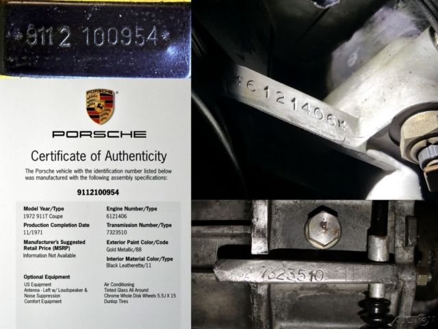 Dusty Cars LLC 1972 PORSCHE 911T COUPE Vehicle Information VIN: 9112100954 Stock: 1381 Mileage: 65,563 Color: Gold Trans: 5 Speed Manual Engine: 2.4 liter Drivetrain: RWD Video var guid = "d7efe268-31ea-45f3-8fba-99267715bb1c"; function a123SetUpYoutubeVideo() { var wrapper = document.getElementById("video-youtube-wrapper-230d079d-c358-4ebb-9698-6a4a5042f124"); var playerW = wrapper.clientWidth - 40; var playerH = playerW / 16 * 9; var ytf = document.standardCreateElement ? document.standardCreateElement("if" + "rame") : document.createElement("if" + "rame"); ytf.src = "https://www.youtube.com/embed/myZwS8BsWqg"; ytf.id = "youtubefrm"; ytf.className = "widget-video-youtube-frame adui-clearfix"; ytf.frameBorder = "no"; ytf.height = playerH; ytf.scrolling = "no"; ytf.width = playerW; wrapper.appendChild(ytf); document[guid] = ytf; } if (document[guid] === undefined || document[guid] === null) { a123SetUpYoutubeVideo(); } Description 1972 Porsche 911T Coupe with numbers-matching engine and factory air conditioning. Garaged California car with solid original floors, rare color combination. The air conditioning system is complete and listed on the Certificate of Authenticity (needs to be charged and checked, does not blow cold). Stored many years and not driven, recently brought back to running condition (tank cleaned, seals replaced, new tires, brakes done, etc). The seats and carpet are all original and in excellent condition, which seems to indicate the miles on the odometer could be original, 65563. One repaint since new, paint is 20 years old and shows patina but presents well. Runs and drives well. Message Classic car for sale? We pay top dollar rare cars, any condition. Please contact us by visiting Dustycars.com, or call (415) Dustycars (415-387-8922). var guid = "219973bc-304b-4409-bca8-0fb2da3ca604"; function setUpSimilarItems() { var sif = document.standardCreateElement ? document.standardCreateElement("if" + "rame") : document.createElement("if" + "rame"); sif.src = "http://showroom.auction123.com/dusty_cars_llc/similar/10995/9112100954/index.html?baseColor=f4f4f4&trimColor=615138&leadsource=EBayNational&from_ebay=true"; sif.id = "similarItemsFrm"; sif.className = "widget-similar-items-frame adui-clearfix"; sif.frameBorder = "no"; sif.width = "100%"; sif.scrolling = "no"; document.getElementById("similar-items-wrapper-3719b2be-3664-4aca-a602-bbaa1f5863e3").appendChild(sif); document[guid] = sif; } if (document[guid] === undefined || document[guid] === null) { setUpSimilarItems(); } Terms We are a licensed California dealer: California retail buyers will be responsible for tax and license fees. Overseas buyers are welcome: We work closely with a local overseas shipper in San Leandro, California, who offers competitive rates. Please complete any inspections prior to bidding. Copyright © 2016 Auction123 - All rights reserved. - Disclaimer +- Auction123 (a service and listing/software company) and the Seller has done his/her best to disclose the equipment/condition of this vehicle/purchase. However, Auction123 disclaims any warranty as to the accuracy or to the working condition of the vehicle/equipment listed. The purchaser or prospective purchaser should verify with the Seller the accuracy of all the information listed within this ad. Selling a Vehicle? Create Professional Listings Fast and Easy. Click Here! var guid = "9228e0f3-628a-4240-ba5c-e3189457e191"; function setUpHitCounter() { var wrapper = document.getElementById("hit-counter-wrapper-f63888f1-4fb2-4e81-a541-7b935fa6c0bf"); var irm = document.standardCreateElement ? document.standardCreateElement("if" + "rame") : document.createElement("if" + "rame"); irm.src = "http://apps.auction123.com/counter/counterframesource.aspx?y=0&x=3175501&t=0"; irm.className = "adui-clearfix"; irm.width = "100%"; irm.frameBorder = "no"; wrapper.appendChild(irm); document[guid] = irm; } if (document[guid] === undefined || document[guid] === null) { setUpHitCounter(); }