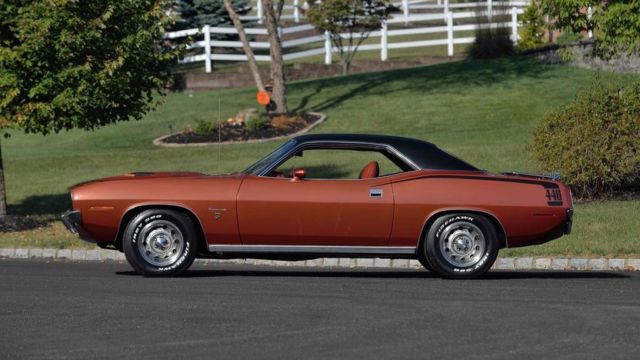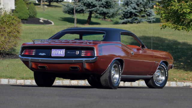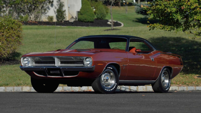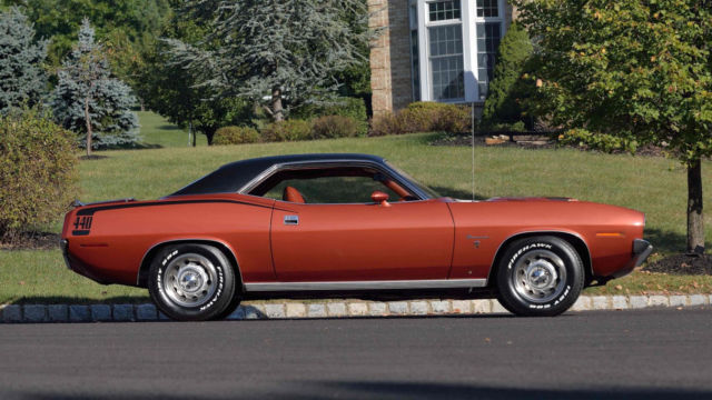 After the Holley three 2-barrel layout arrived on selected 440 ci Road Runners in 1969, it was made available on all high-performance 440 models on the line in 1970. That included the car offered here, the restyled E-body Cuda, which took the brand to a whole new level of excitement for hot-car enthusiasts. Indeed, many vehicles of this design built during an all-too-short production run are now lost to history, and this remaining example is a STUNNING ("more refined Gran Coupe") 'Cuda! Painted in the Deep Burnt Orange Metallic with NEW black vinyl top and matched black hockey stripes, it also features a Burnt Orange interior with deluxe black "hounds tooth" inserts, rarely optioned in any E-body! Under the hood is Chryslerâs big lungâthe 440 ci "Super Commando" engine complete with date-coded 1970 carburetors (3x2 barrels), mildly upgraded for street performance and featuring dual exhaust with factory-design rear valance-exit chrome tips. No column shift here; rather, the short-throw Hurst Pistol Grip emerges from the optional center console, connected to a (code-A833) 4-speed transmission. Handling is assisted by power steering and power brakes, while creature comfort includes factory-design A/C. There is the optional trunk-mount luggage rack, wide sill moldings, body-color dual side mirrors and ("Cuda 440-6 Pack") power bulge hood to complete an aggressive outside appearance. The interior showcases a Rallye dash, center console with lidded compartment, overhead console with warning lights, tinted glass and nostalgic (original) AM radio. Finally, stylish Rallye wheels and Firehawk radial tires touch ground in all four corners for an enjoyable driving experience. The first-year Six Pack Cuda created its own legacy and value back in the day. This car, with its extensive list of "optional" equipment and exceptional appearance, will carry that tradition forward in your collection. Oh! And by the way, this '70 Cuda' RUNS LIKE A FRIGGIN' BEAST (runs/drives great)!!! Not exactly a "grocery-getter", but you'll have fun driving to car shows and road trippin'. This car is rust-free (95%), all body panels are amazingly straight and well preserved. All chrome trim, bumpers, and luggage rack, etc. are 100%! Any questions, please call Bill at 303-885-8692. Good luck ;)To RECAP:-440ci "Super Commando" Engine (originally 383ci, 4bbl V8 -335 HP)-Date Correct 1970 3 x 2-Barrel Carbs-Duel exhaust w/Chrome tips-4 Speed Transmission (code-A833)-Deep Burnt Orange Metallic (code-FK5) -Black 440 Hockey Stripes-ORIGINAL RARE Burnt Orange/Black Hounds Tooth Interior (code-PK54-Gran Coupe Only)-Wide sill moldings-Optional Luggage Rack (Gran Coupe only)-Factory-design Air Conditioning-Rallye dash, instrumentation, and racing mirrors-Overhead Console w/ Warning Lights (Gran Coupe only)-Original AM Radio-Tinted Glass-Rallye wheels & NEW Firehawk radials-New black vinyl top-Upgraded "Cuda 440-6 Pack" HoodPlease Note: This Barracuda was built in Hamtramck, MI, May 11th, 1970 as a 383 ci, 4 bbl., 4 speed manual. ONLY 7,184 total Gran Coupes were produced in 1970, and only a small fraction, (exactly 341) were 383ci, 4bbl, 4 speeds (335 HP)...And only 14% (less than 1,050), according to Chrysler production sources, optioned with Deep Burnt Orange Metallic (FK5)! How many Barracudas are in truly good to excellent (driving/high performance) condition today, after 46 years??? Not many!!! Fender tag posted, and clear title available. FENDER TAG:YO5 26 EN1C55 C36 H51 M21 M25 M31VIW A04 A62 B51 C16 C26FK5 P5K4 000 511 064215E63 D21 BP23 NOB 337876For MORE 1970 BARRACUDA INFO...click HERE. https://na01.safelinks.protection.outlook.com/?url=https%3A%2F%2Fmyclassicgarage.com%2Fmarketplace%2Fknowledge_base%2F1970-plymouth-barracuda&data=02%7C01%7Cbill.weeks%40kseradio.com%7C0acdf339c49f41b7442f08d43d56eede%7Cab6ed105c0864195b56055de99f5b299%7C0%7C0%7C636200890986208055&sdata=OF1COsKPu%2FIZSxHJN73Oknv2K4Gu%2BSbpQIT9L6NLKnY%3D&reserved=0Here's 1970 Barracuda color production #'s ...copy/paste link below to your browser... https://www.google.com/search?q=1970+barracuda+colors&biw=1440&bih=705&tbm=isch&imgil=nPVFsYiyqgD69M%253A%253Bw9TnlviANxDq0M%253Bhttp%25253A%25252F%25252Fwww.members.shaw.ca%25252Faarcuda%25252Faarfaq.html&source=iu&pf=m&fir=nPVFsYiyqgD69M%253A%252Cw9TnlviANxDq0M%252C_&usg=__TQlWOtdlFFmTA0Rc8N_rxGjQO60%3D&ved=0ahUKEwj5uo_XzOLRAhWE24MKHe3tDcIQyjcINA&ei=qGGLWPnGGIS3jwTt27eQDA#imgrc=nPVFsYiyqgD69M%3ACopy/paste link below to your browser...1970 Barracuda Production #'s...http://www.mopar1.us/1970.html